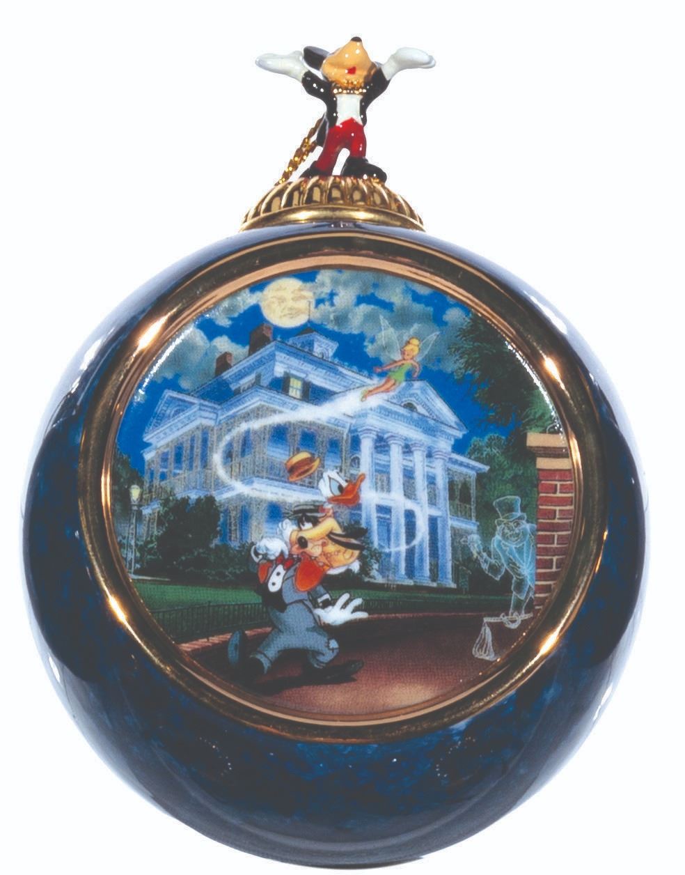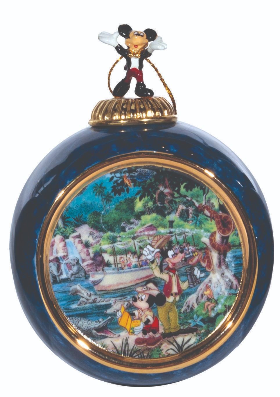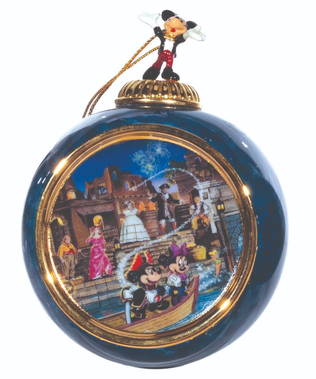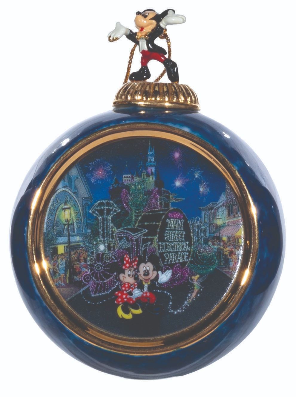 (Bradford Exchange, 2000) A complete set of 12 Christmas ornaments from the "Celebrating the Magic of Disney" Collection by Bradford Exchange. The blue-marbled porcelain ornaments feature an image of Mickey and friends at Disneyland attractions and locations. Each ornament is topped with a figural Mickey Mouse with a gold hanging cord. Measuring 4” x 3” x 2.25” deep the ornaments are in fine condition.