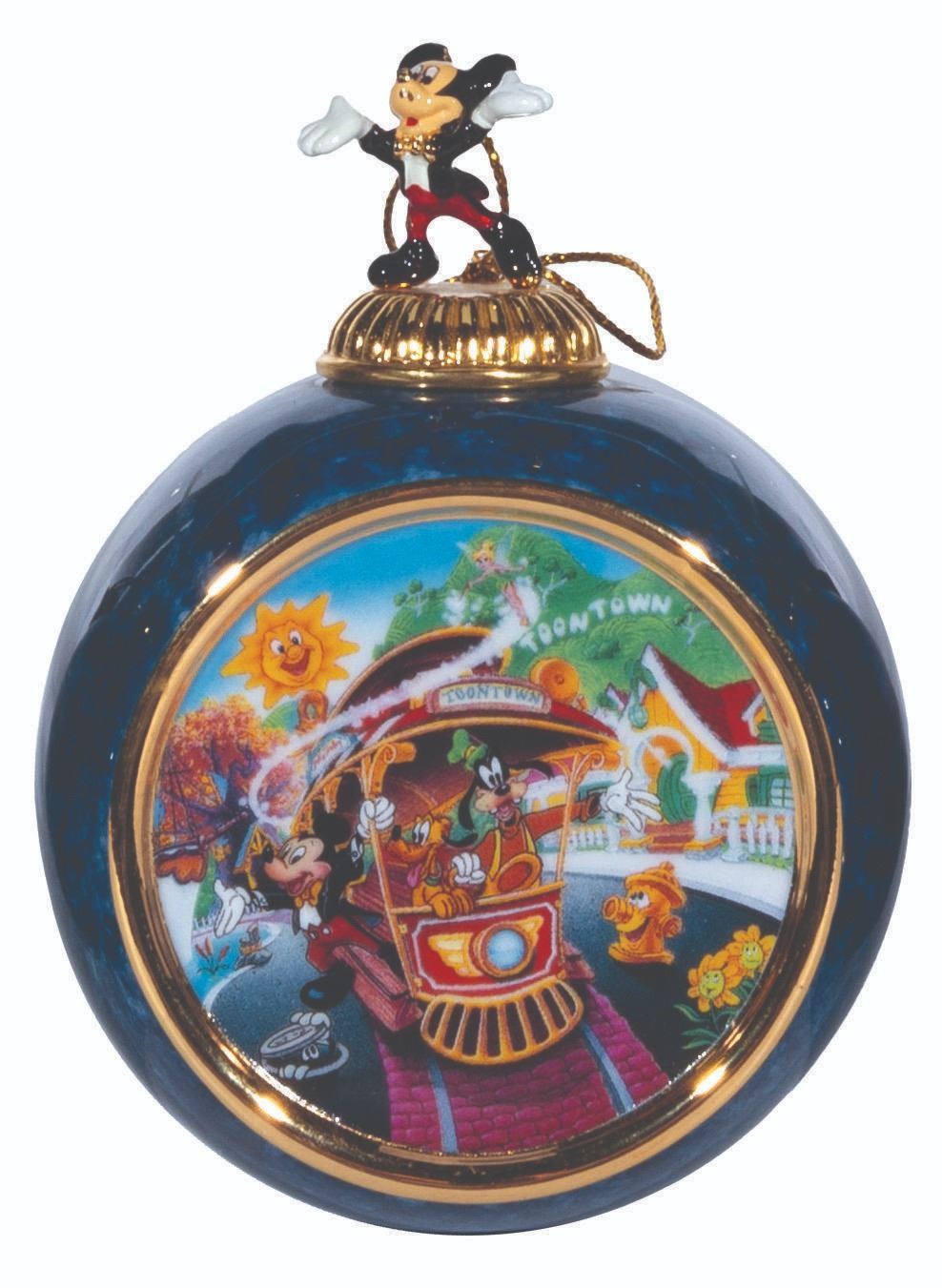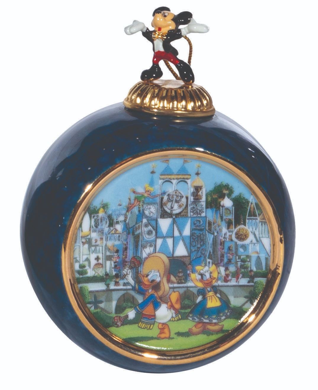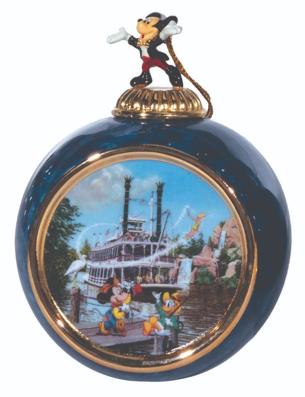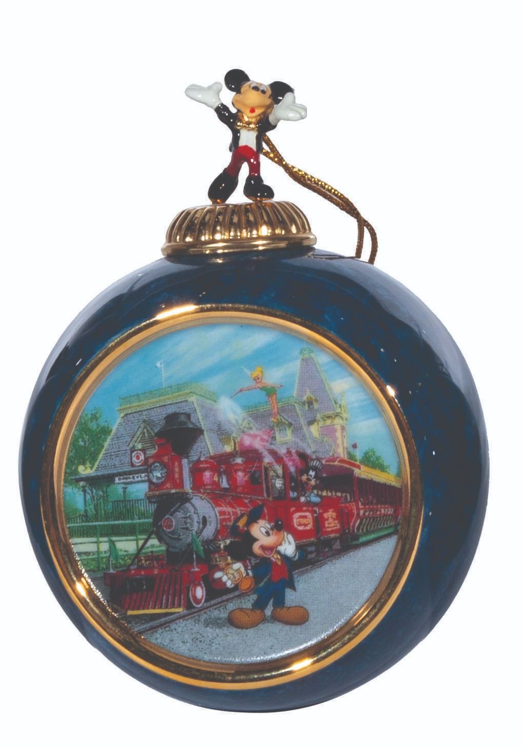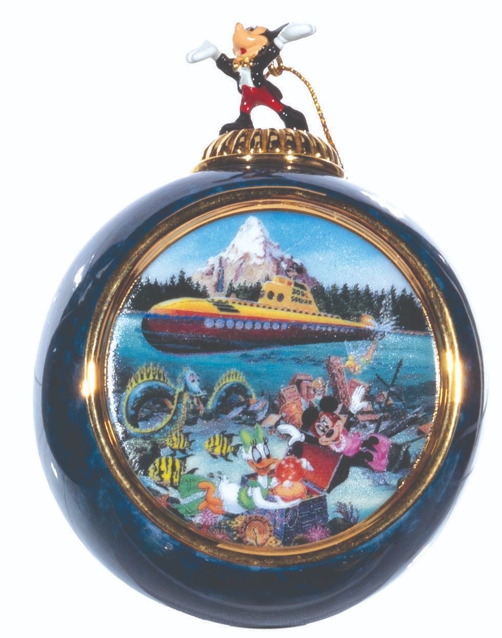 (Bradford Exchange, 2000) A complete set of 12 Christmas ornaments from the "Celebrating the Magic of Disney" Collection by Bradford Exchange. The blue-marbled porcelain ornaments feature an image of Mickey and friends at Disneyland attractions and locations. Each ornament is topped with a figural Mickey Mouse with a gold hanging cord. Measuring 4” x 3” x 2.25” deep the ornaments are in fine condition.
