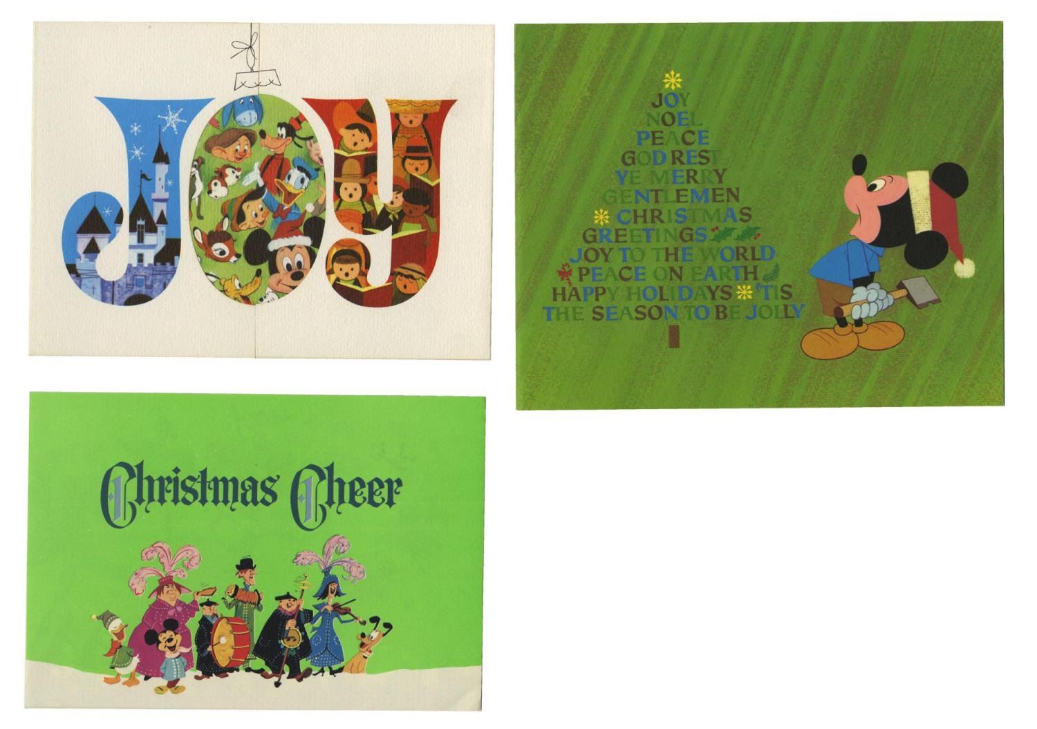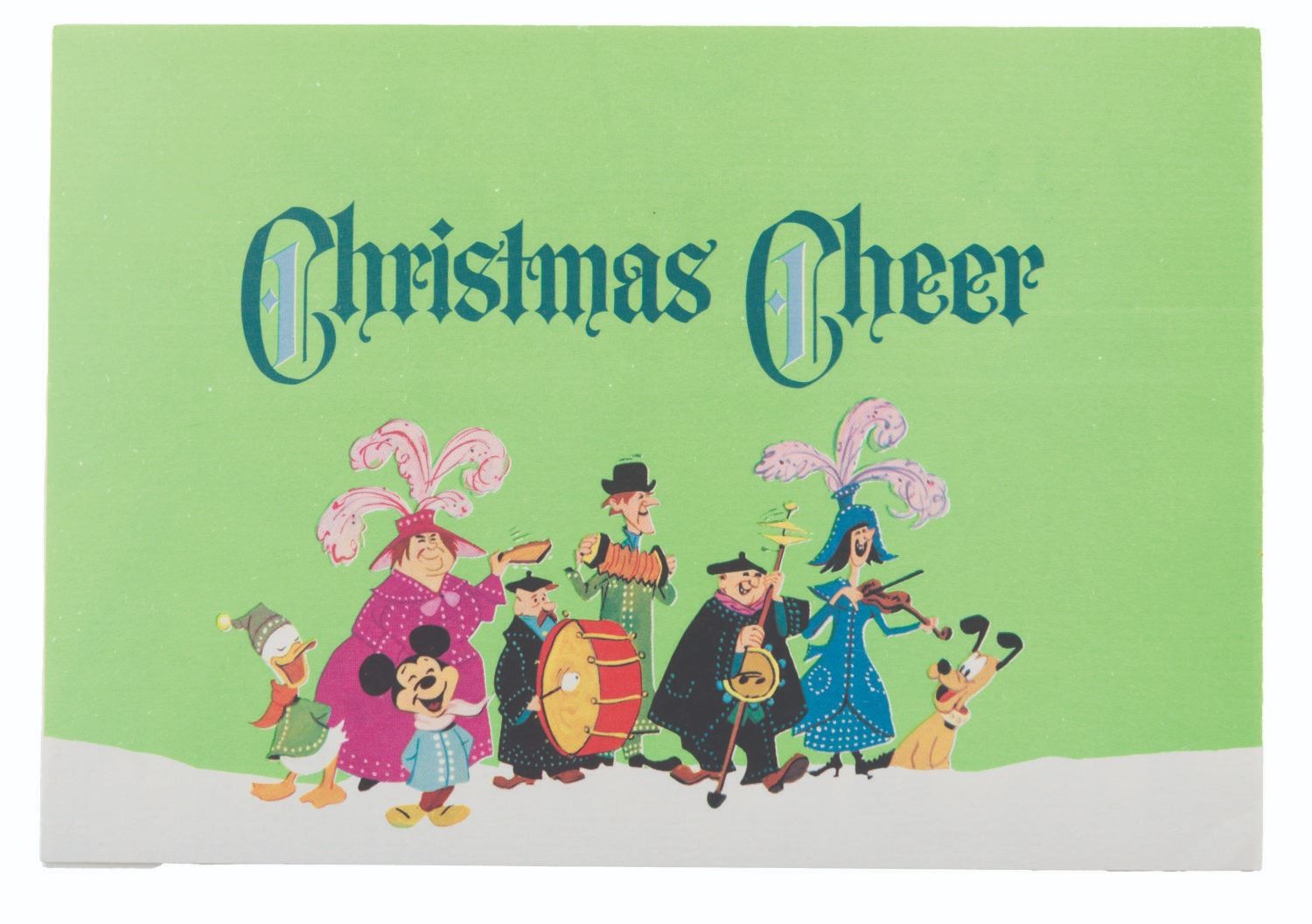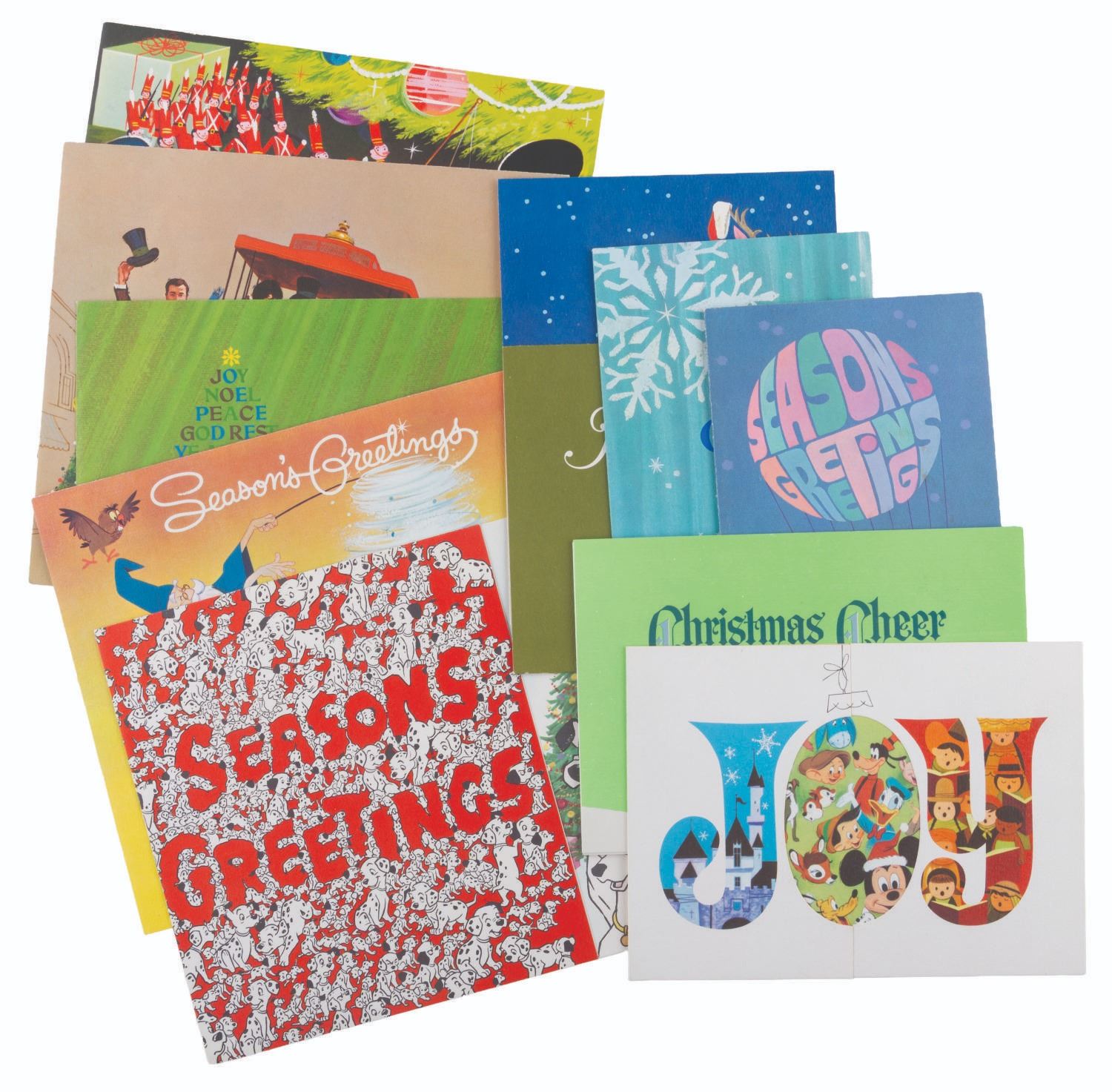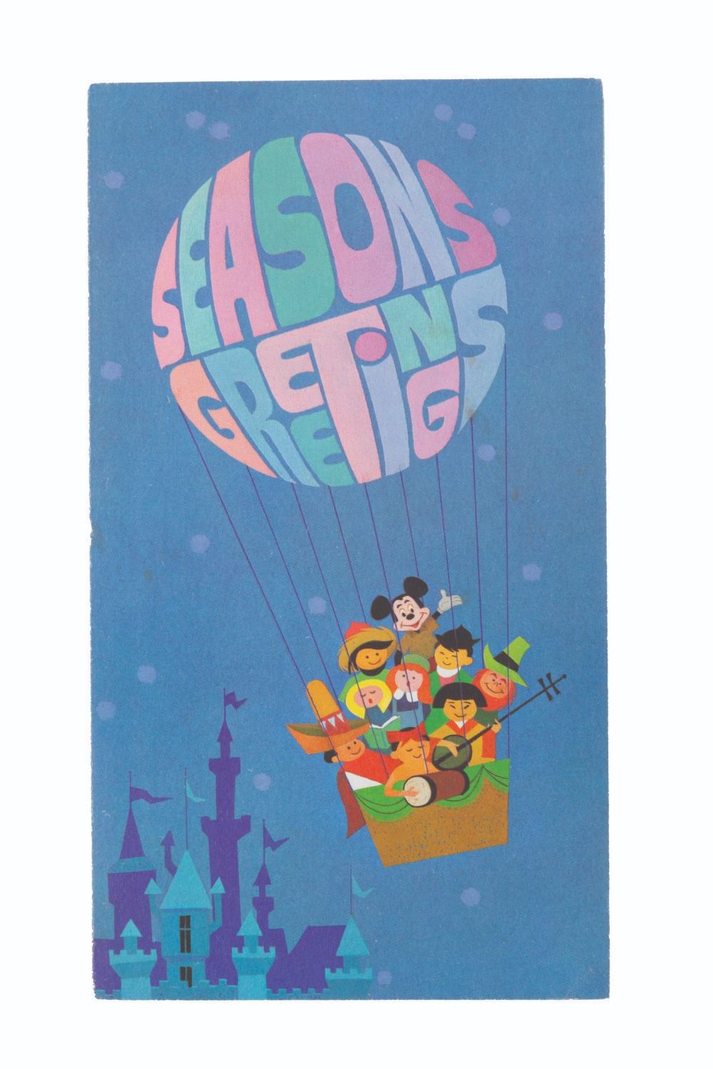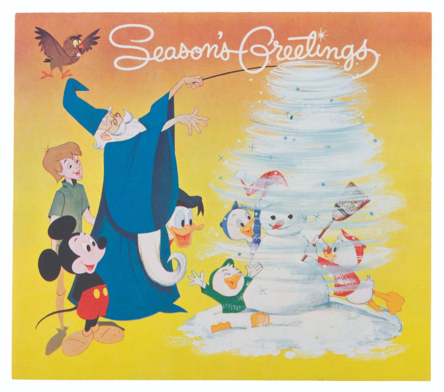 (Disney, 1960-69) A set of ten Walt Disney Studios Christmas cards from 1960 thru 1969. The cards feature Disney characters such as Mickey and Donald, as well as characters from the newly-released films of the decade,"Babes in Toyland,""Mary Poppins,""One Hundred and One Dalmatians" and"The Sword in the Stone." Measuring 5" x 7" to 7" x 8" the collection is in very good condition with some minor handling wear to a few cards, including a few spots of discoloration to the front of the It's a Small World card.