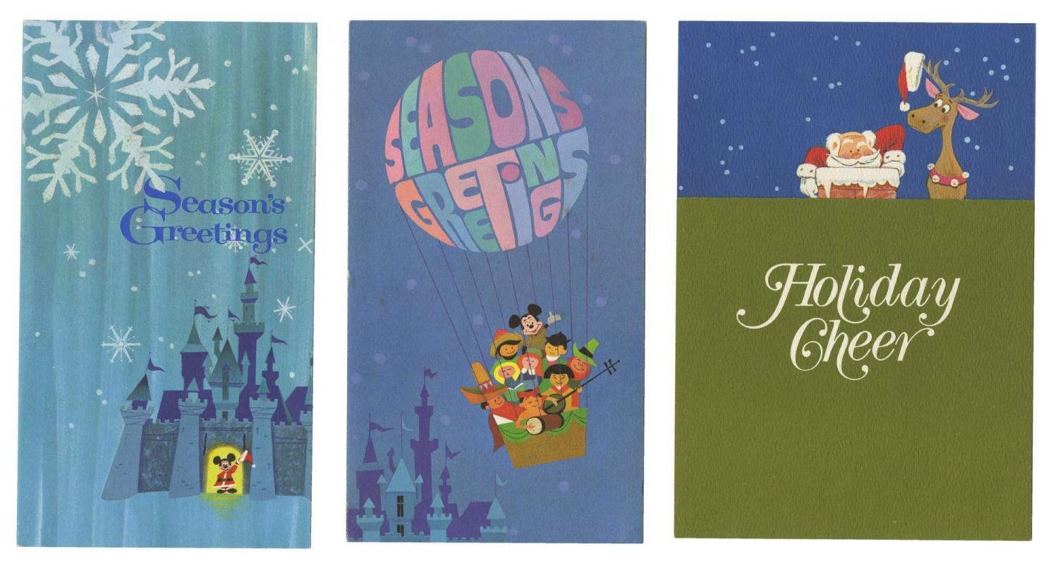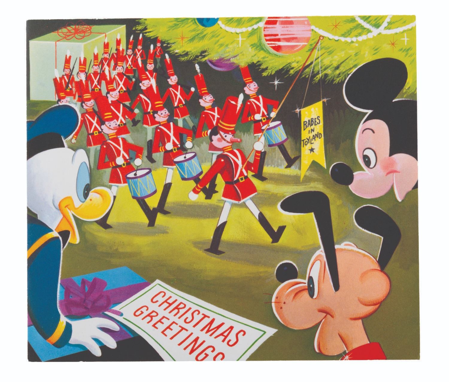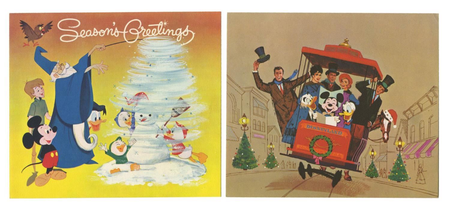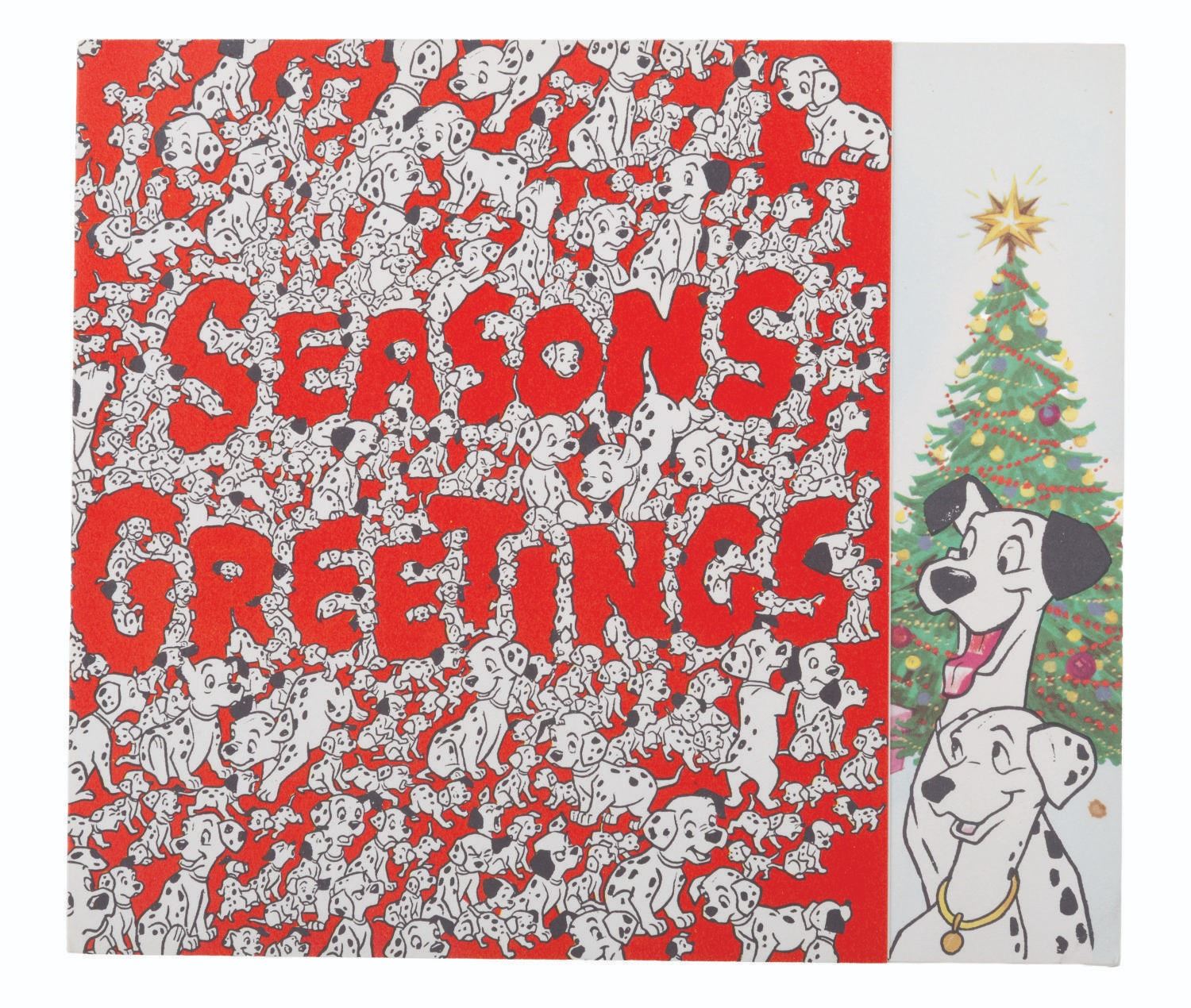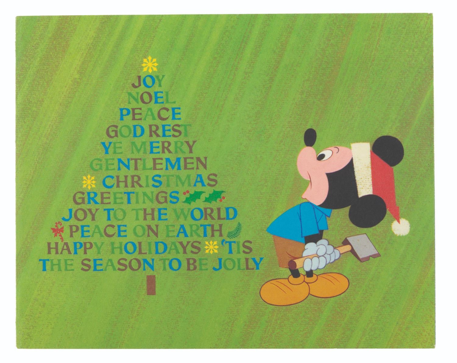 (Disney, 1960-69) A set of ten Walt Disney Studios Christmas cards from 1960 thru 1969. The cards feature Disney characters such as Mickey and Donald, as well as characters from the newly-released films of the decade,"Babes in Toyland,""Mary Poppins,""One Hundred and One Dalmatians" and"The Sword in the Stone." Measuring 5" x 7" to 7" x 8" the collection is in very good condition with some minor handling wear to a few cards, including a few spots of discoloration to the front of the It's a Small World card.