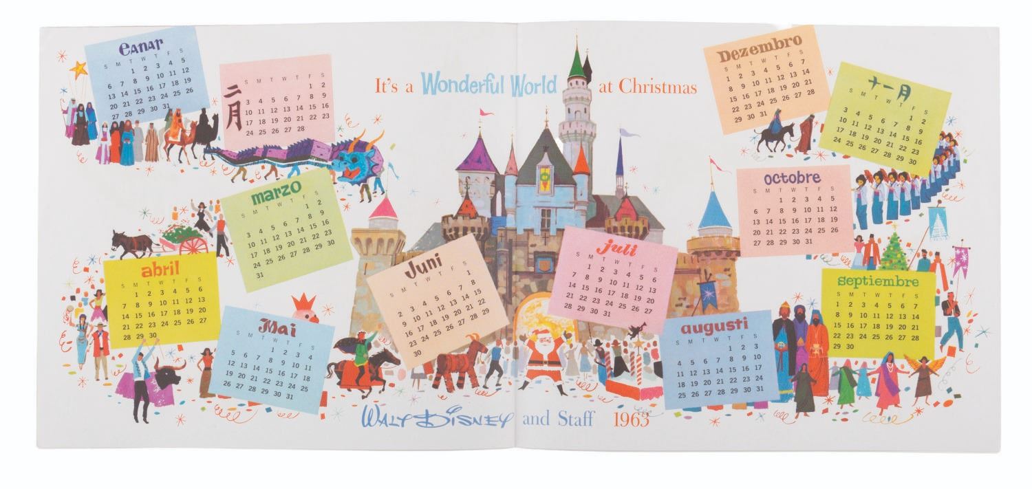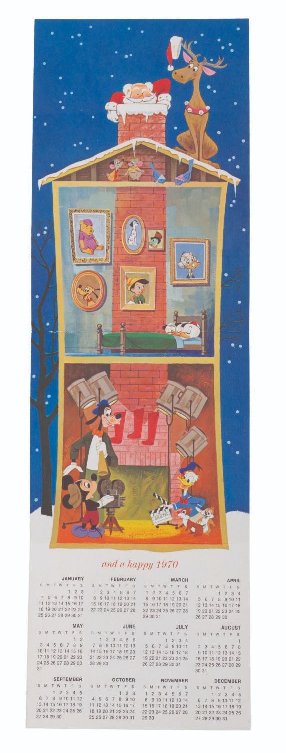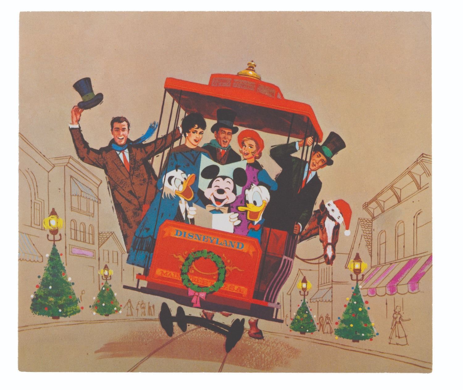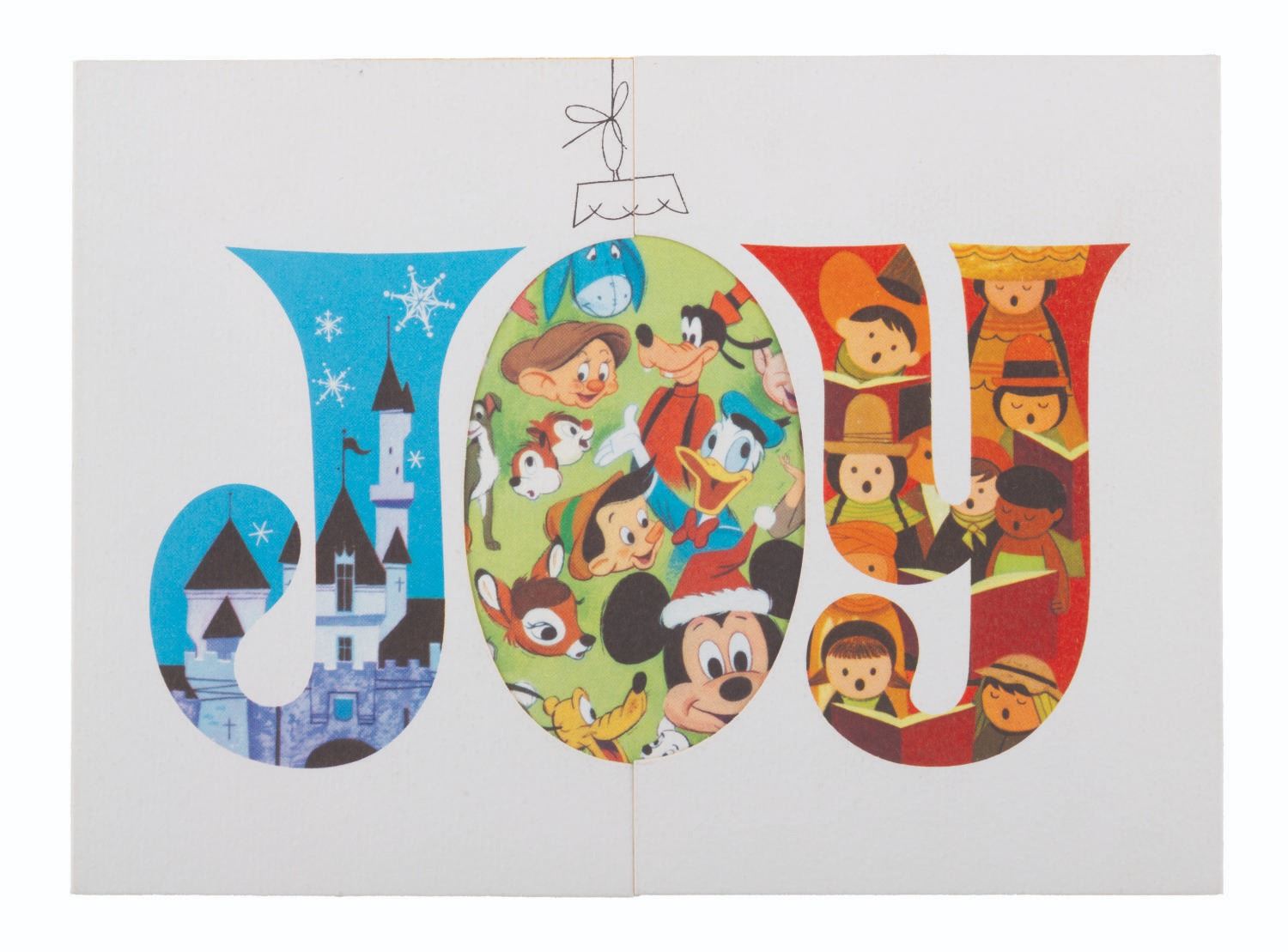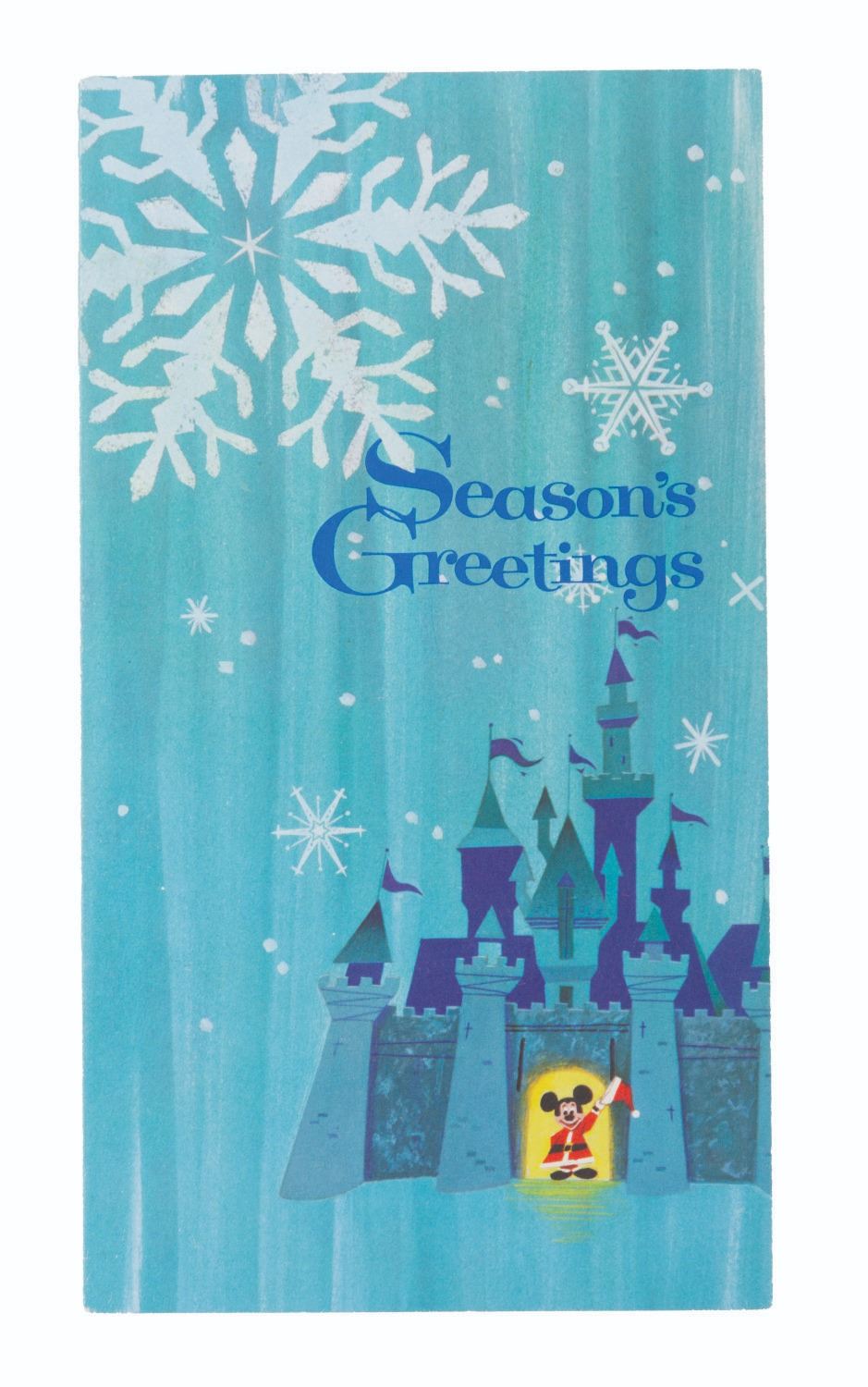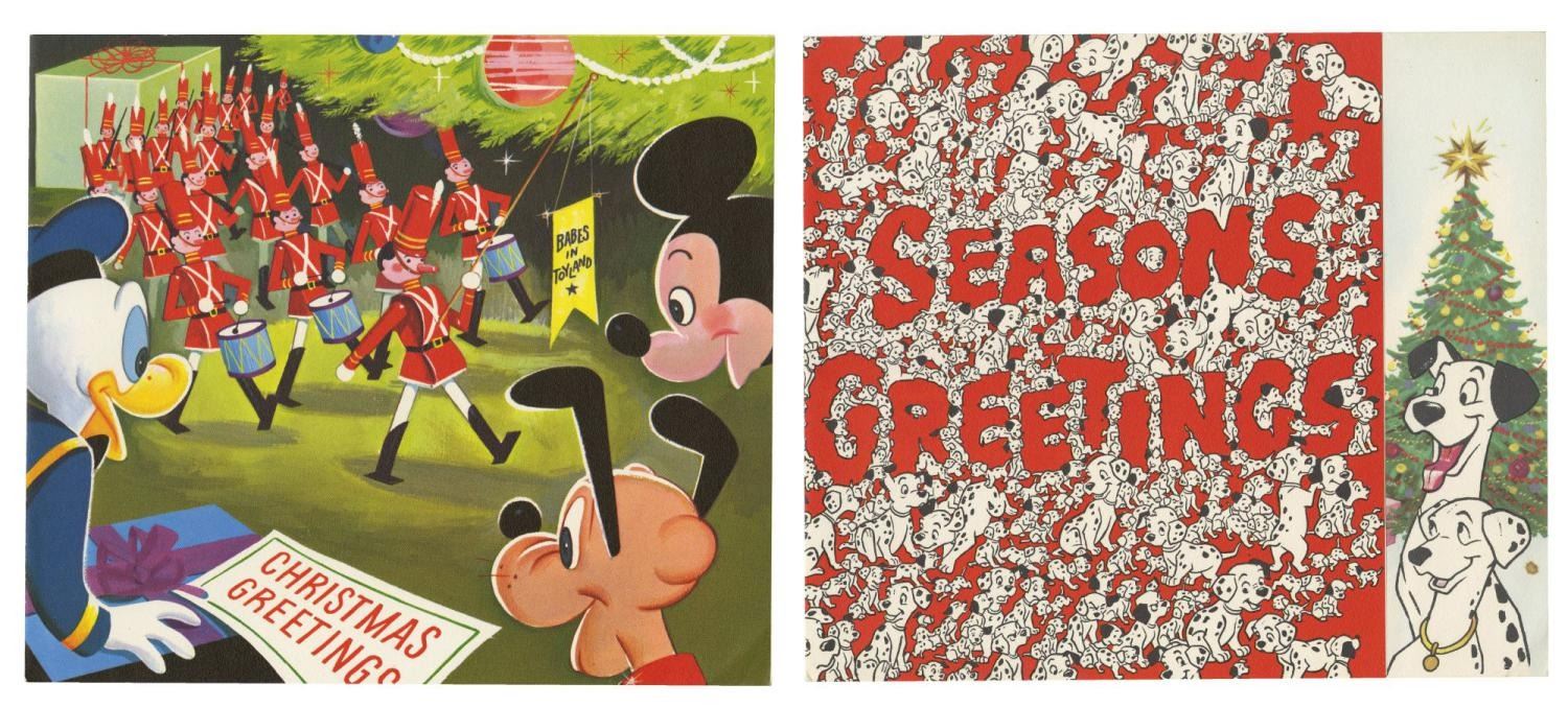 (Disney, 1960-69) A set of ten Walt Disney Studios Christmas cards from 1960 thru 1969. The cards feature Disney characters such as Mickey and Donald, as well as characters from the newly-released films of the decade,"Babes in Toyland,""Mary Poppins,""One Hundred and One Dalmatians" and"The Sword in the Stone." Measuring 5" x 7" to 7" x 8" the collection is in very good condition with some minor handling wear to a few cards, including a few spots of discoloration to the front of the It's a Small World card.