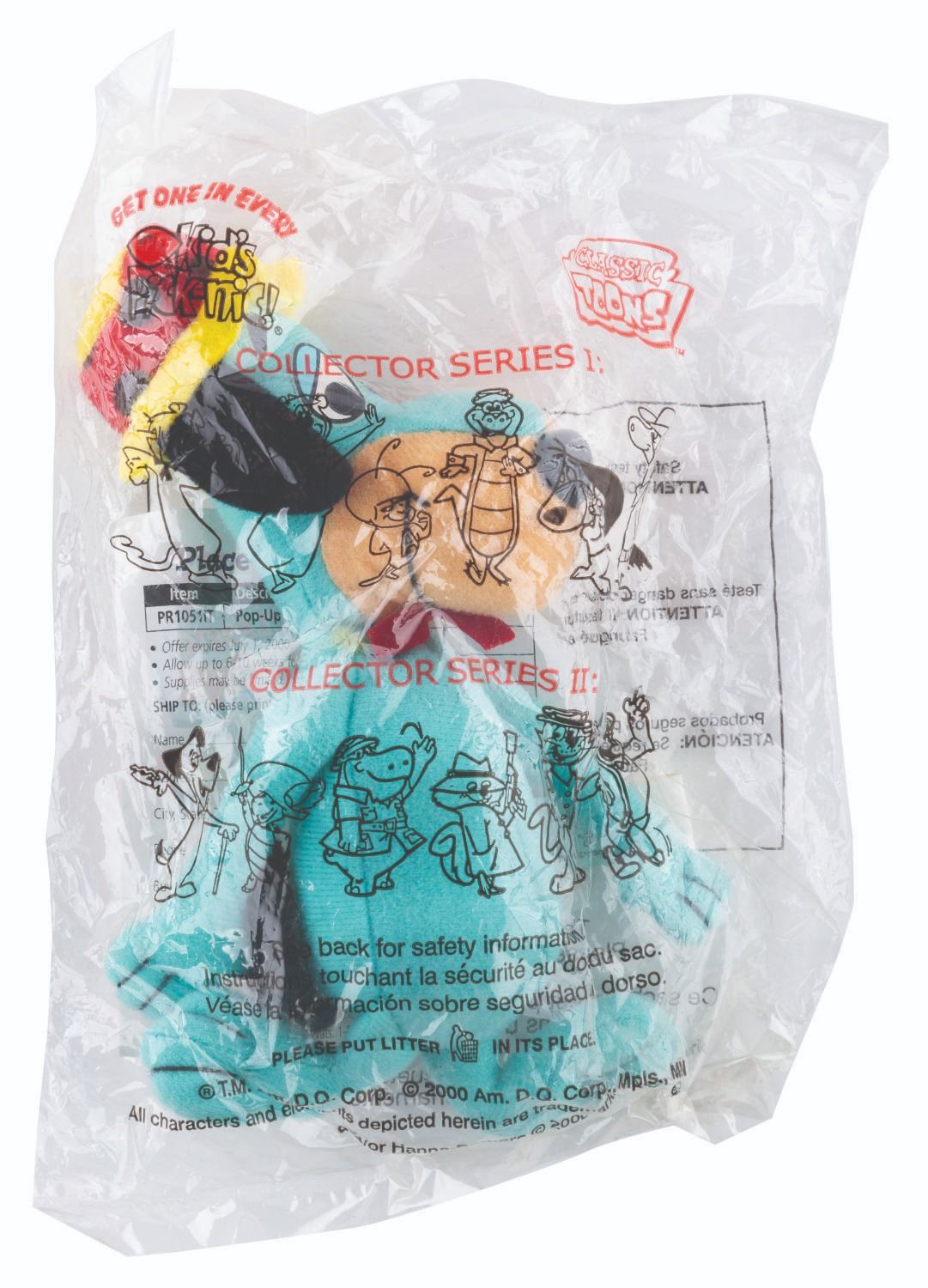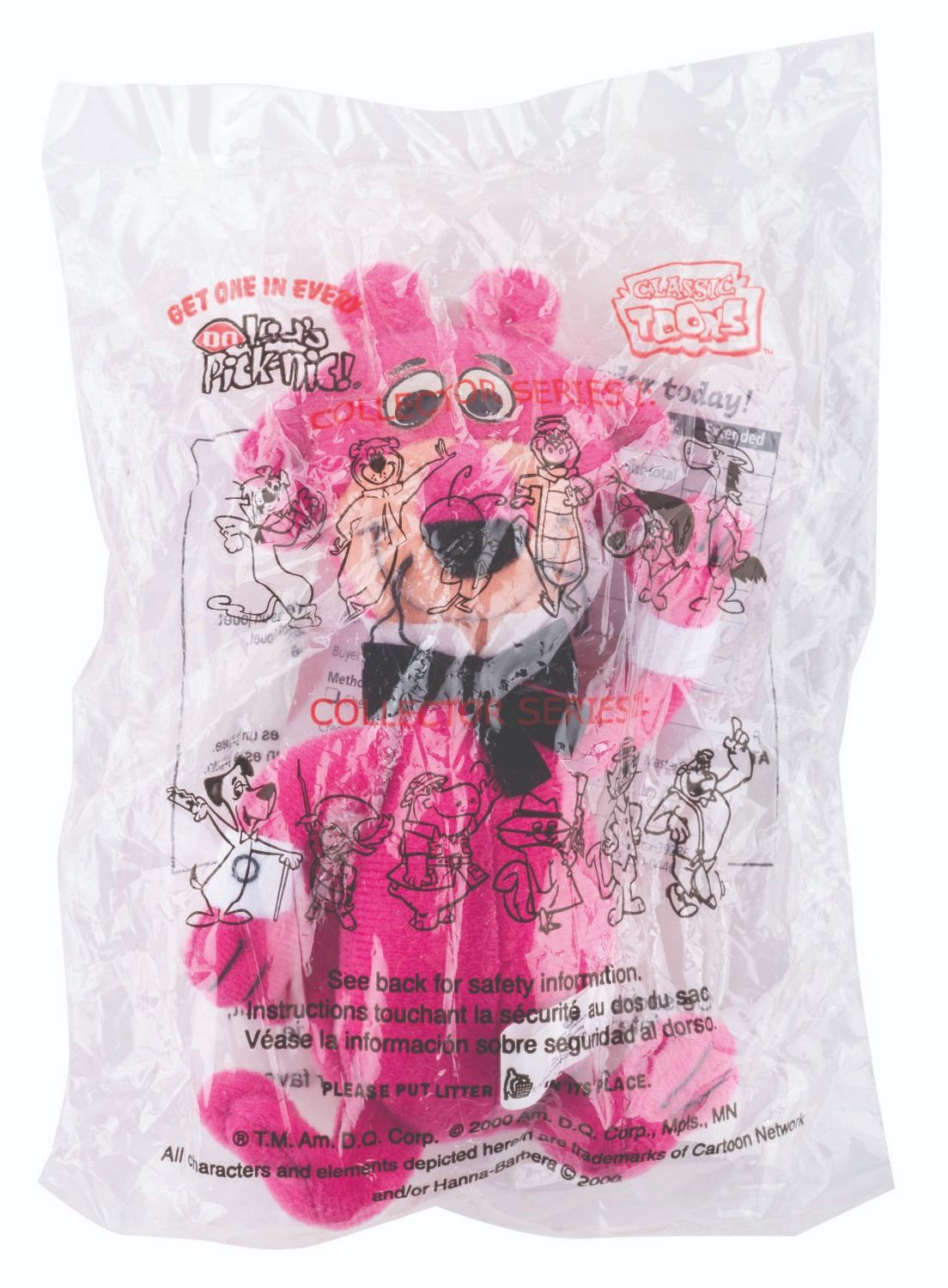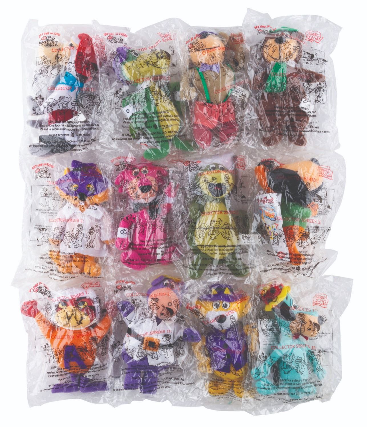 (Dairy Queen/Hanna-Barbera, 2000) A complete set of 12 mini plush toys featuring classic Hanna-Barbera characters offered by Dairy Queen in their “Kid’s Pick-nic!” meals. Included are Snagglepuss, Yogi Bear, Atom Ant, Wally Gator, Augie Doggie, Quick Draw McGraw, Huckleberry Hound, Touché Turtle, Peter Potamus, Secret Squirrel, Top Cat, and Magilla Gorilla. Each measuring 6” tall, the plushes are all in fine condition and sealed in their original packaging.