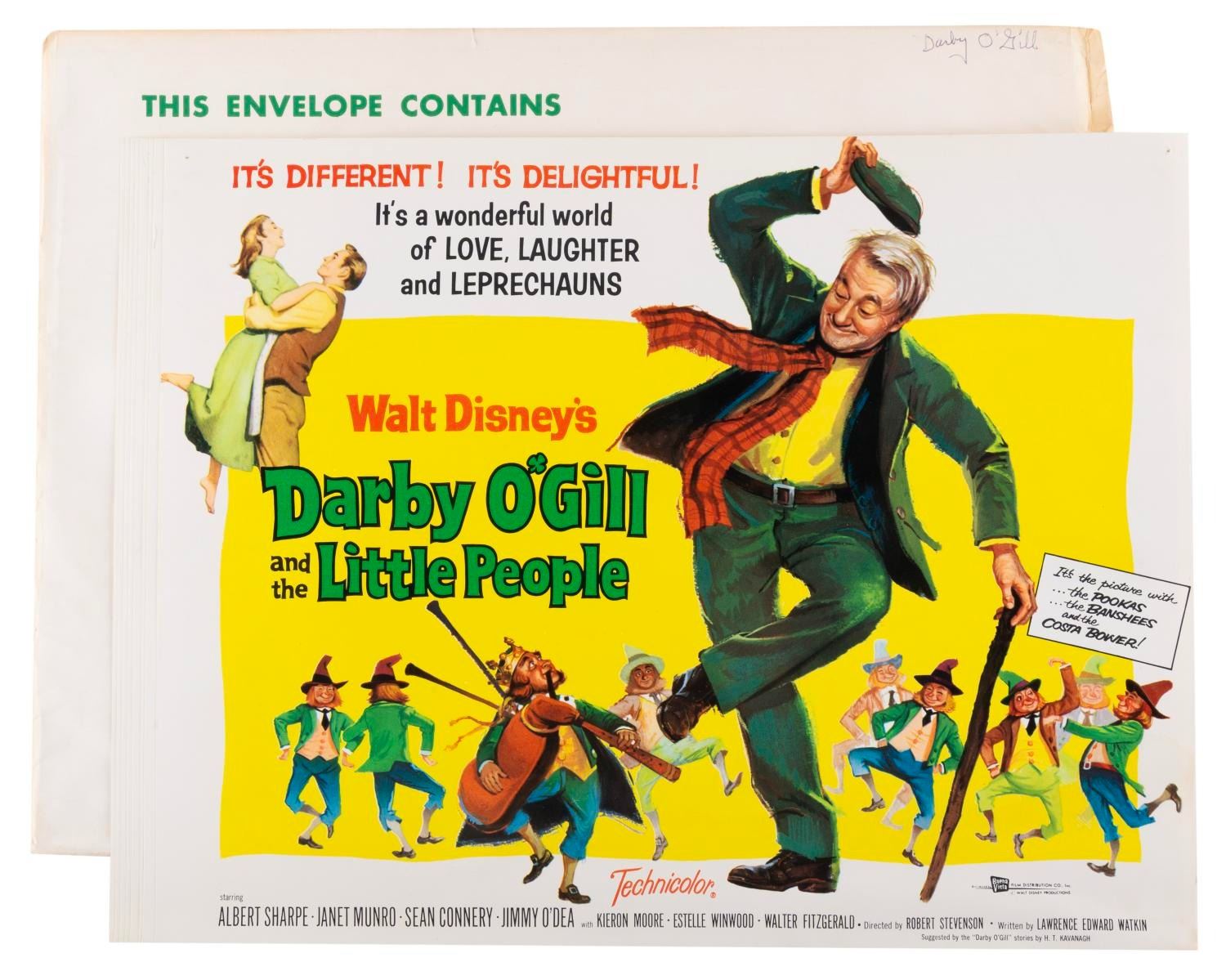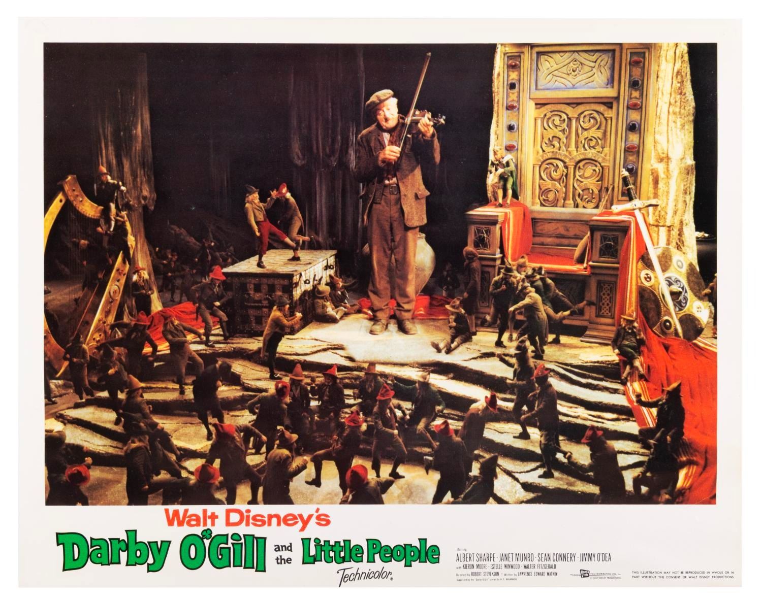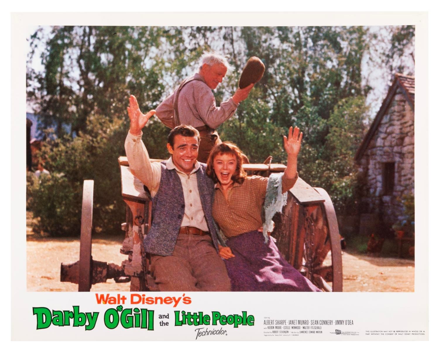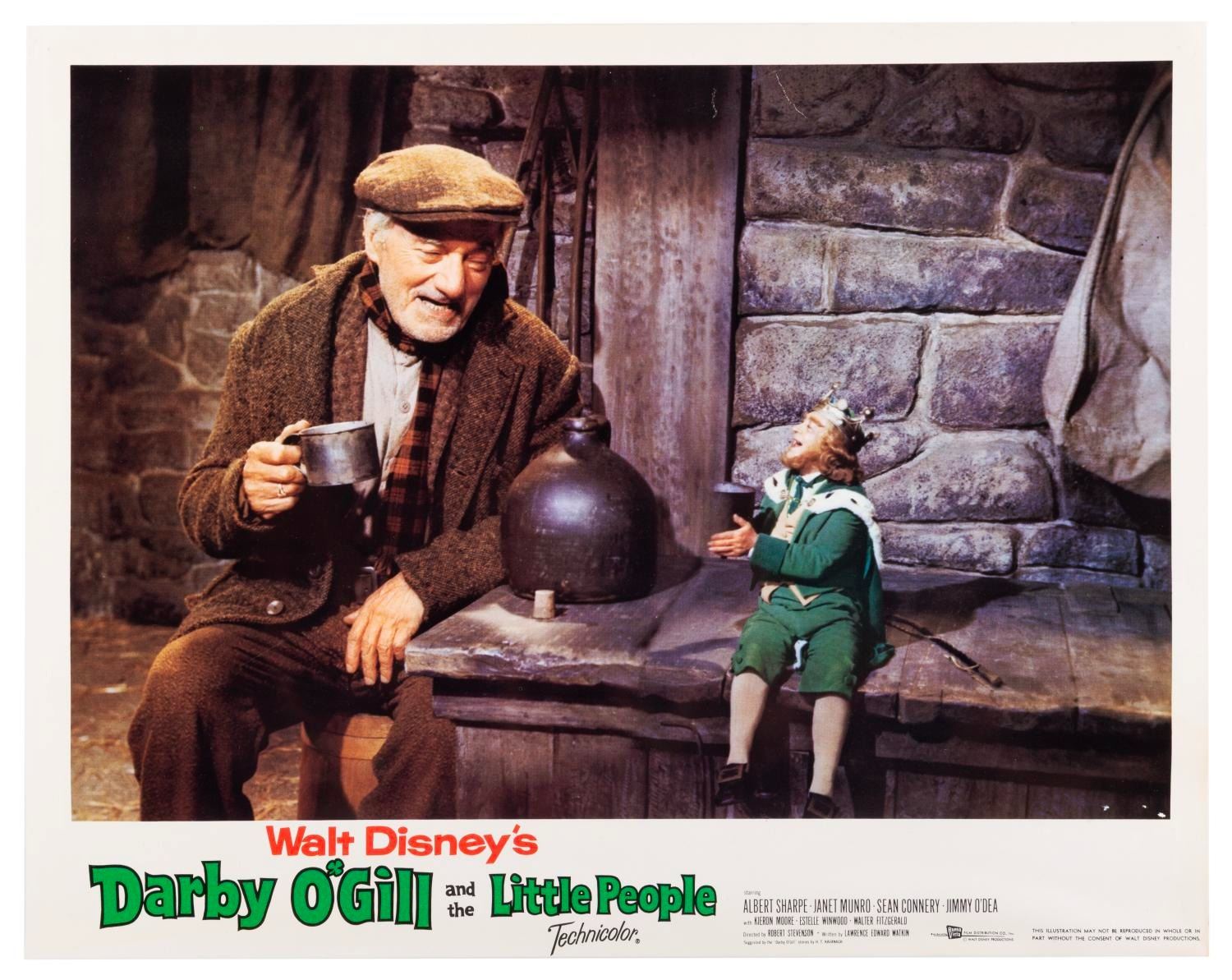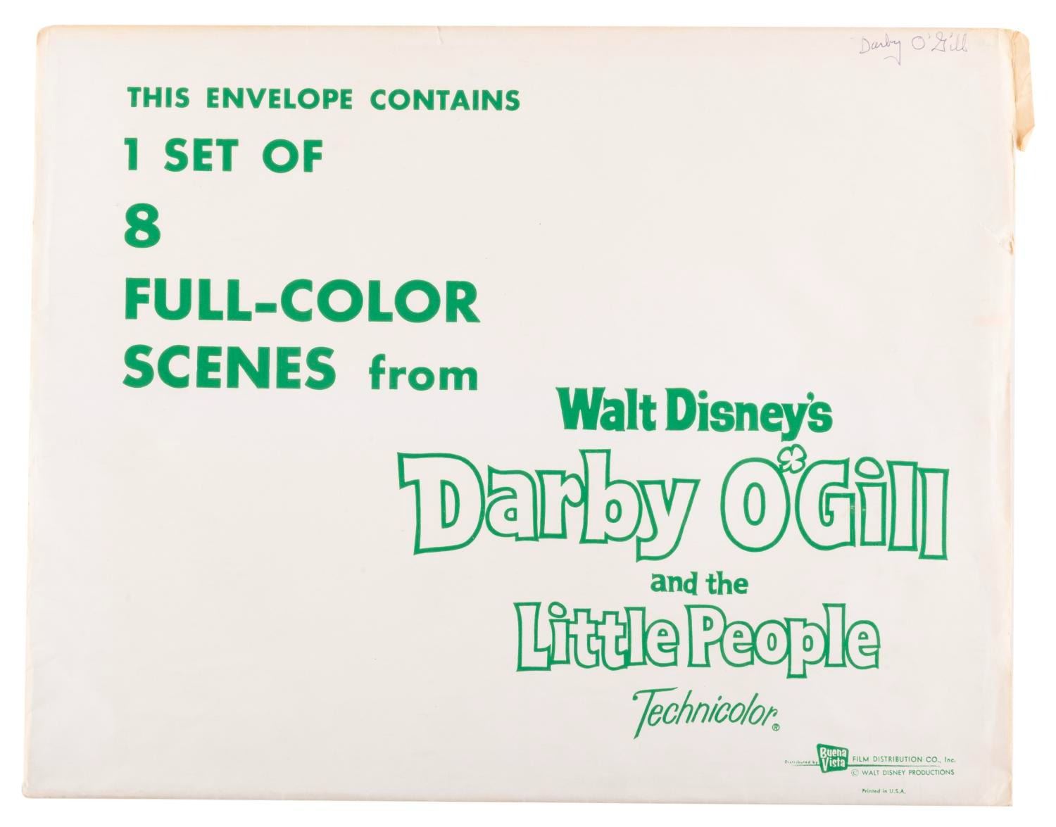 (Disney, 1959) A complete set of eight lobby cards from the original theatrical release of "Darby O'Gill and the Little People" starring Albert Sharpe, Janet Munro, and Sean Connery. Each measuring 11 x 14", the set displays in very good condition with pinholes at the top corners, and some waviness along the bottom of the cards, possibly from liquid exposure.