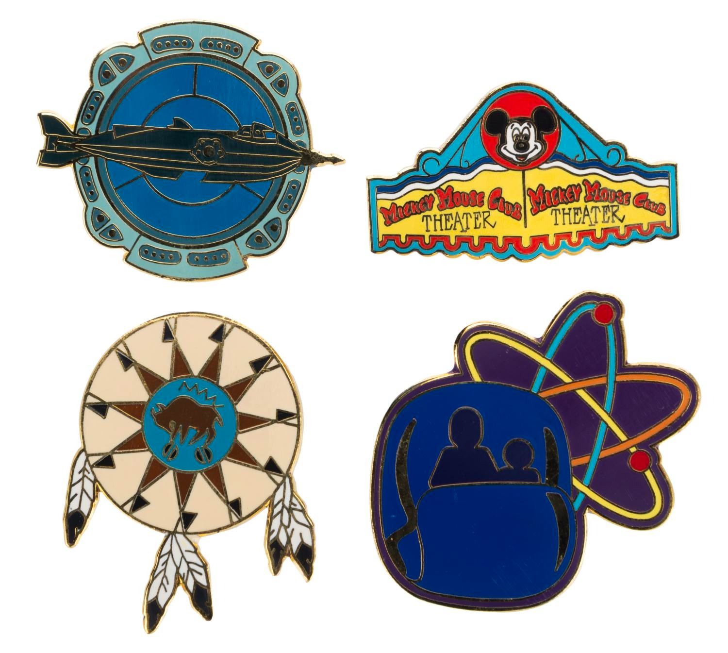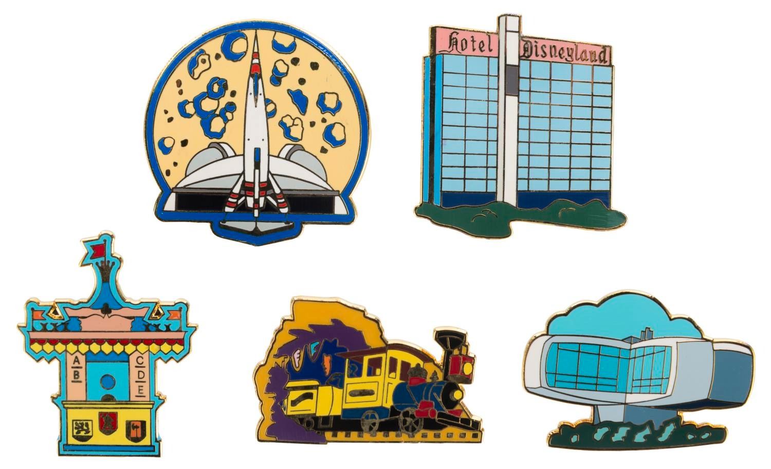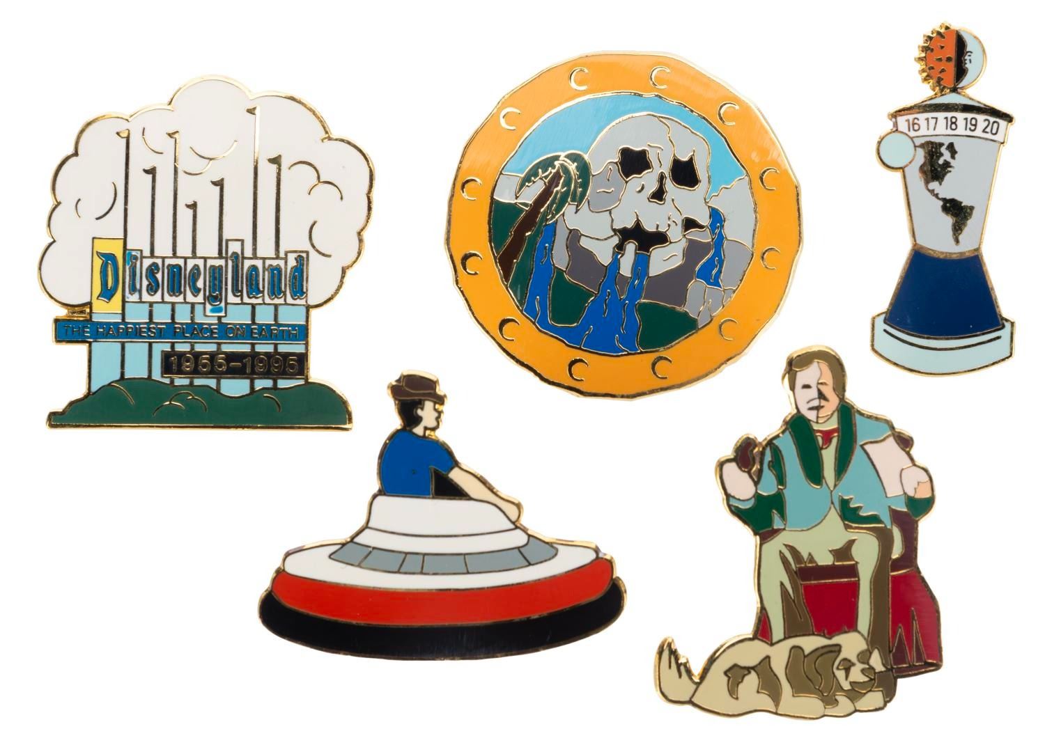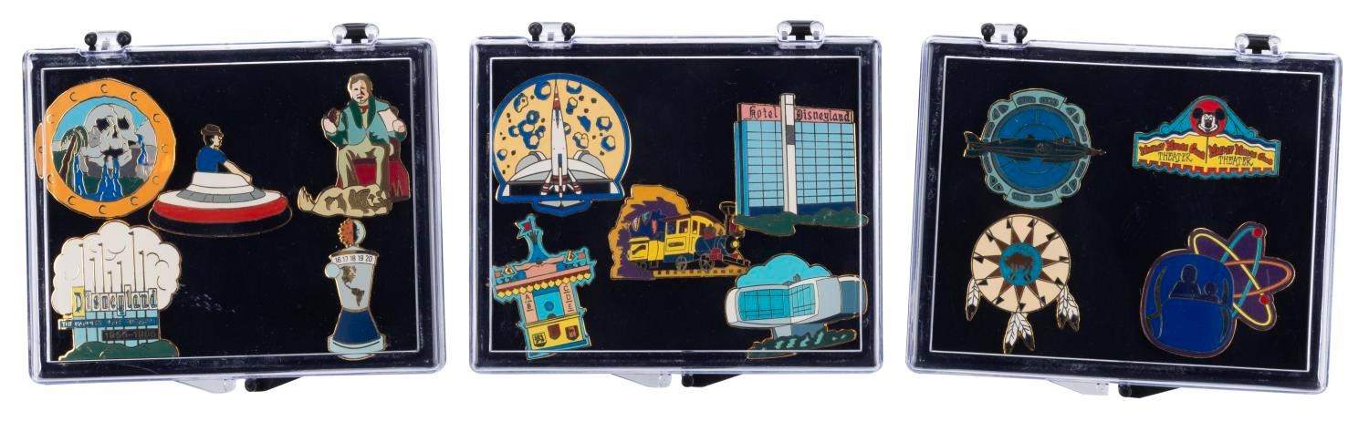 (Disneyland, 1995) A complete set of 14 Cast Member-exclusive pins celebrating Disneyland's 40th Anniversary, featuring past Park attractions, including Adventure Through Inner Space, House of the Future, Rainbow Caverns Mine Train, and more. Ranging in size from 1.25” x 1.5” to 1.5” x 1.5”, the pins are in fine condition, split into three separate sets with cards detailing the history of each attraction, measuring 2.5” x 3.5” each and in fine condition.