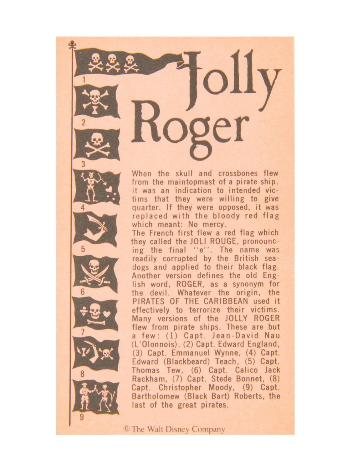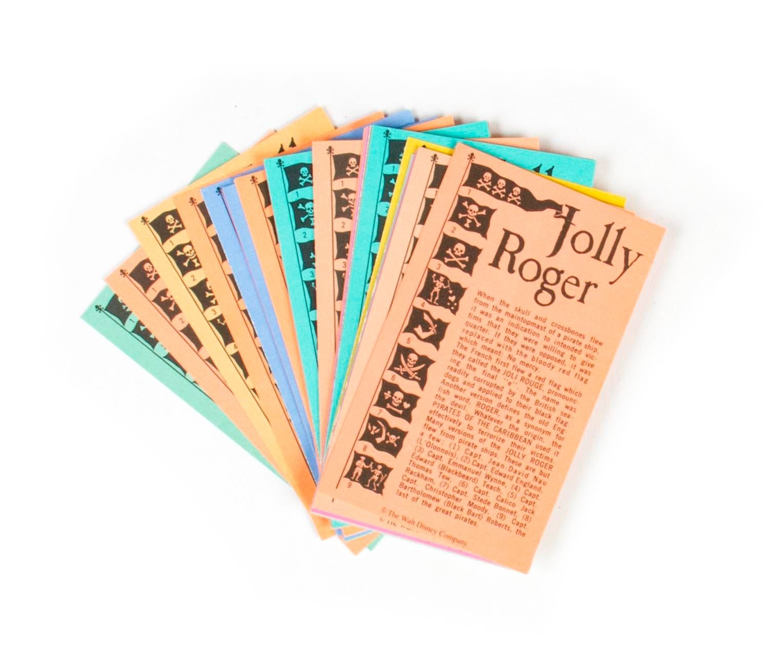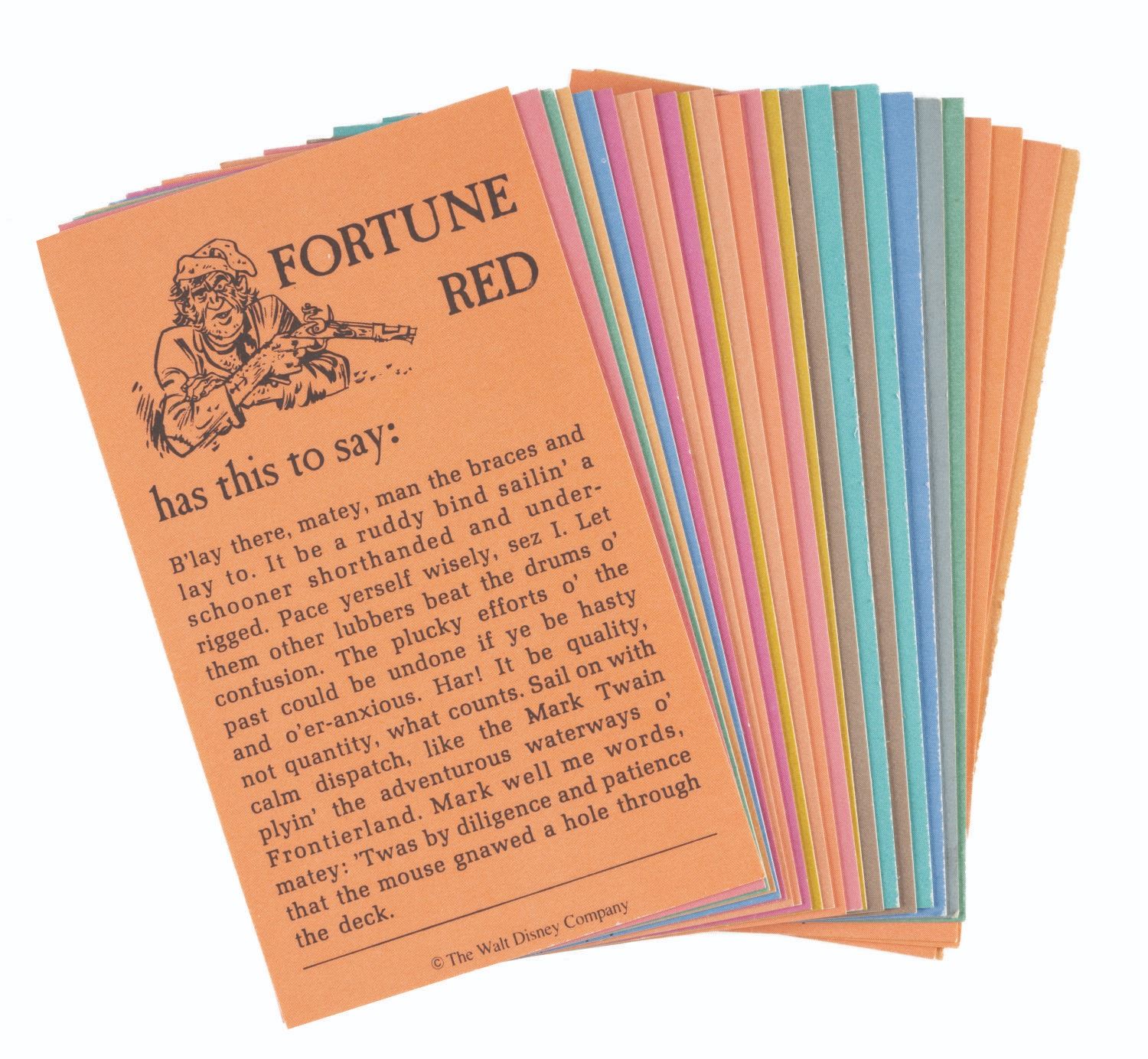 (Disneyland, 1990s) A complete set of 24 cards from the Fortune Red machine near the Pirates of the Caribbean. Each colorful card features a fortune with Disneyland references and a history of Jolly Roger flags. Each measuring 4.25" x 2.5", the complete set is in very good condition with very minor edge wear.