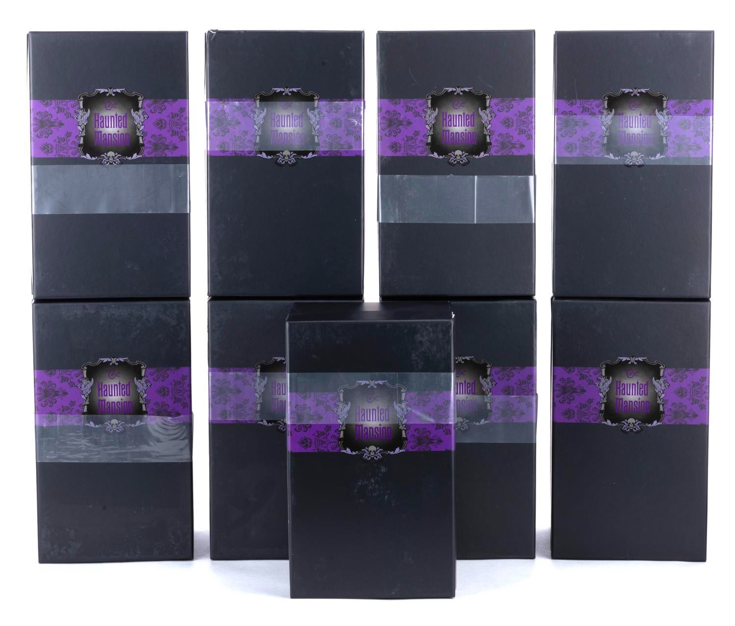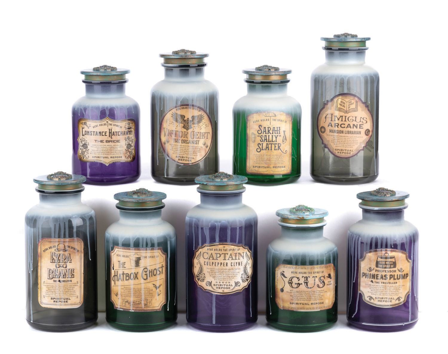 (Disneyland) A collection of (9) Haunted Mansion Host a Ghost Spirit Jars. Each illuminating jar decoration comes with charm, instructions, and COA, in original box. Among the lot is Amigus Arcane, the Bride, Captain Culpepper Clyde, Ezra Beane, Gus, Hatbox Ghost, Phineas Plump, Sarah Sally Slater, and Victor Geist the Organist. The electrical function has not been tested, but each piece is in fine unused condition with little wear to the boxes from storage and use.
