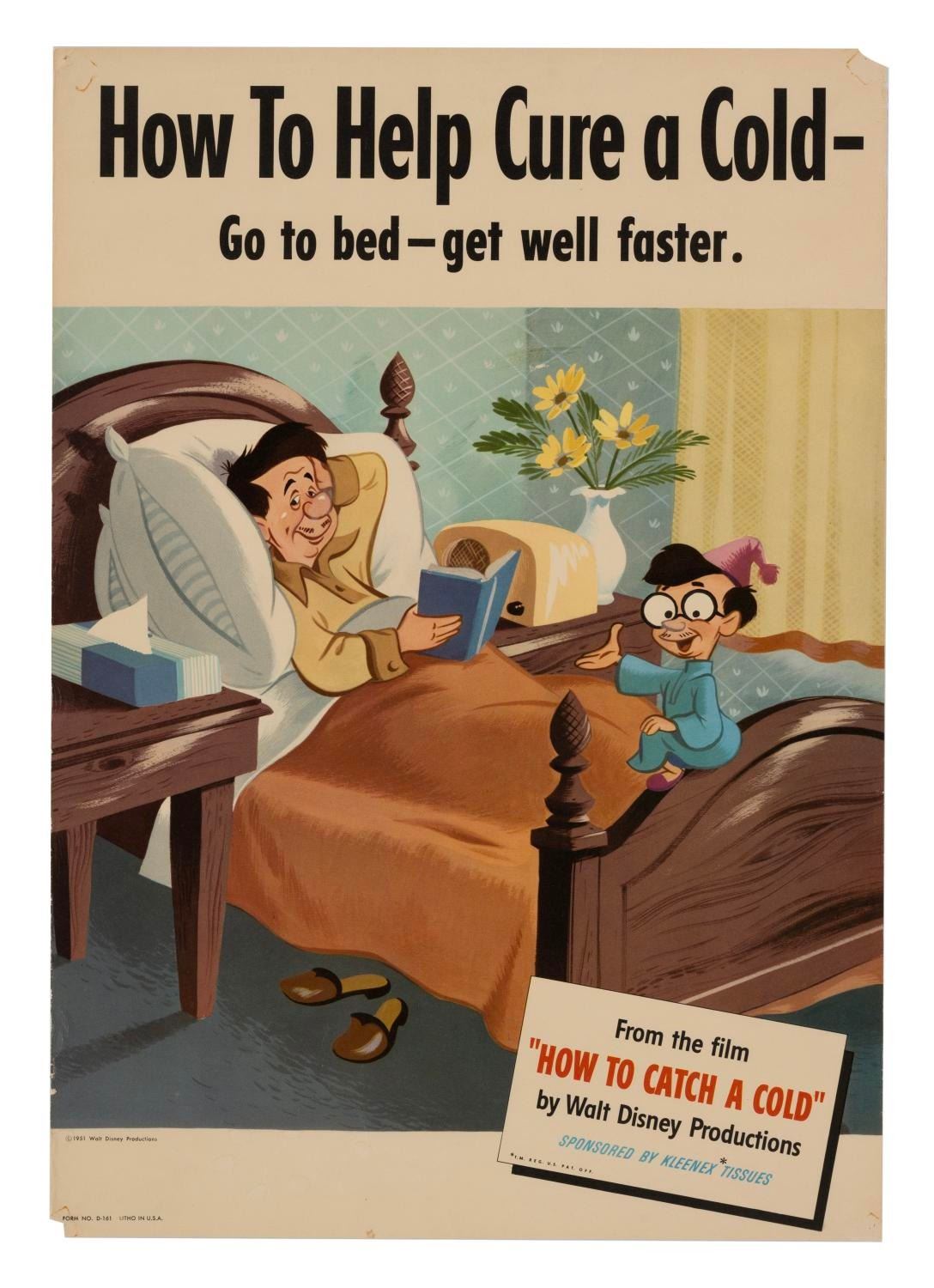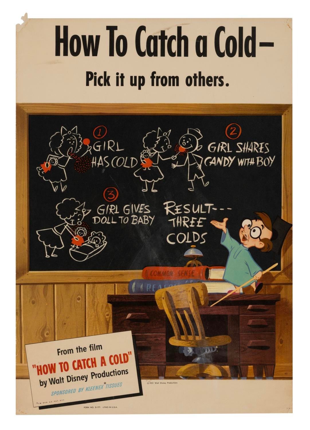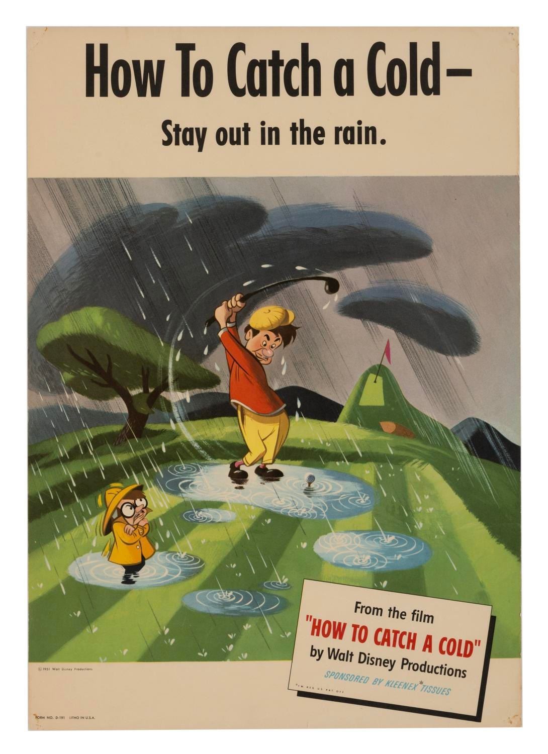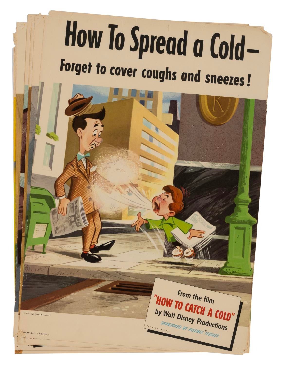 (Disney, 1951) A very rare complete set of six promotional posters for the animated film “How to Catch a Cold.” This short was produced by Walt Disney Productions as an educational film, but also advertised for Kleenex Company. Created as a humorous take on cold prevention, the film was often shown at schools and community organizations where these types of posters were typically used. Each poster measures 14” x 20" and the set is in very good condition with only expected wear from age.
