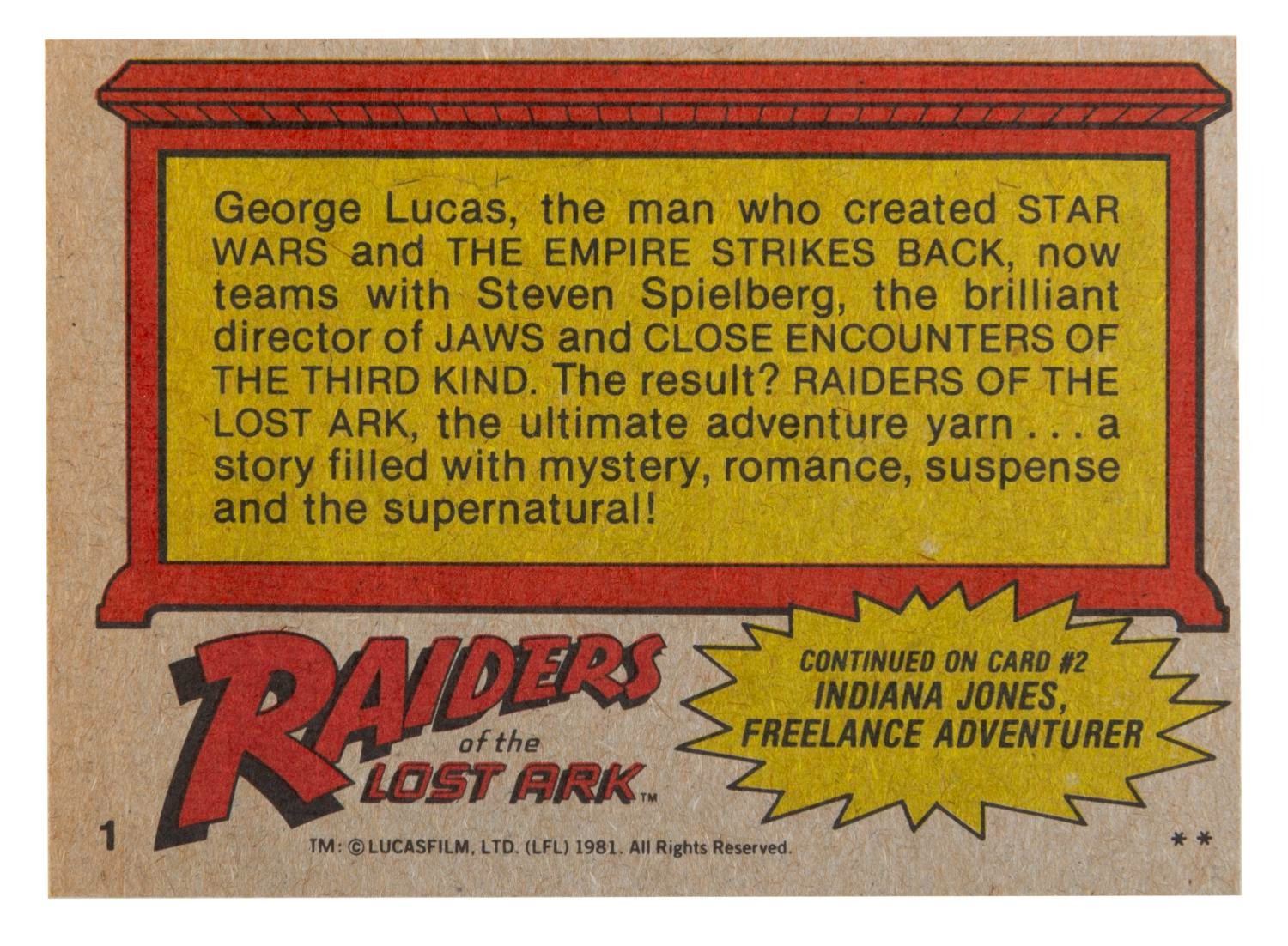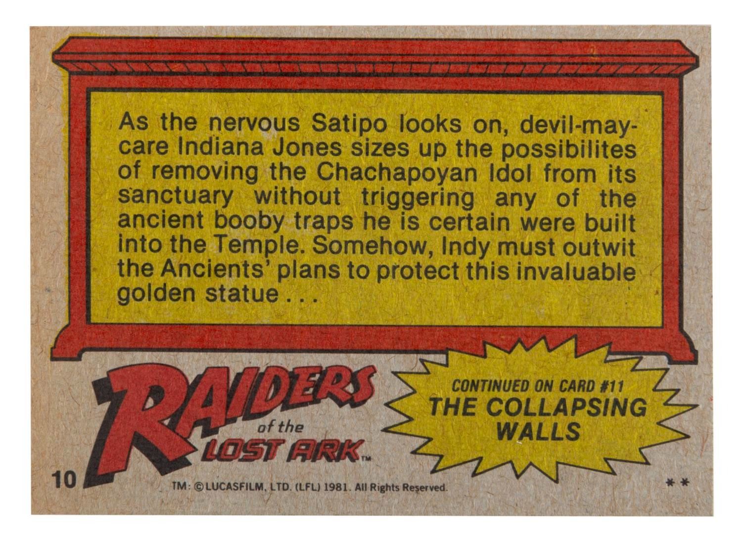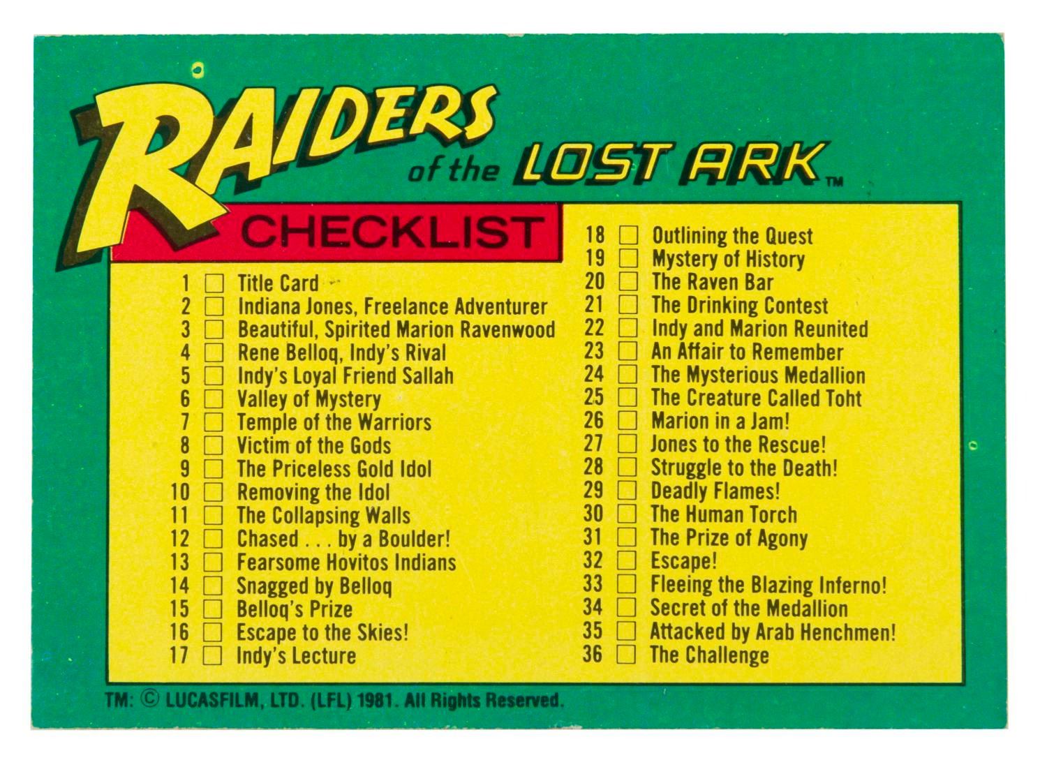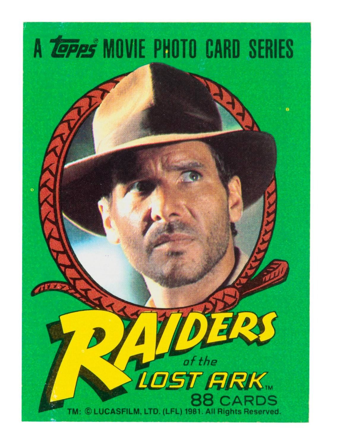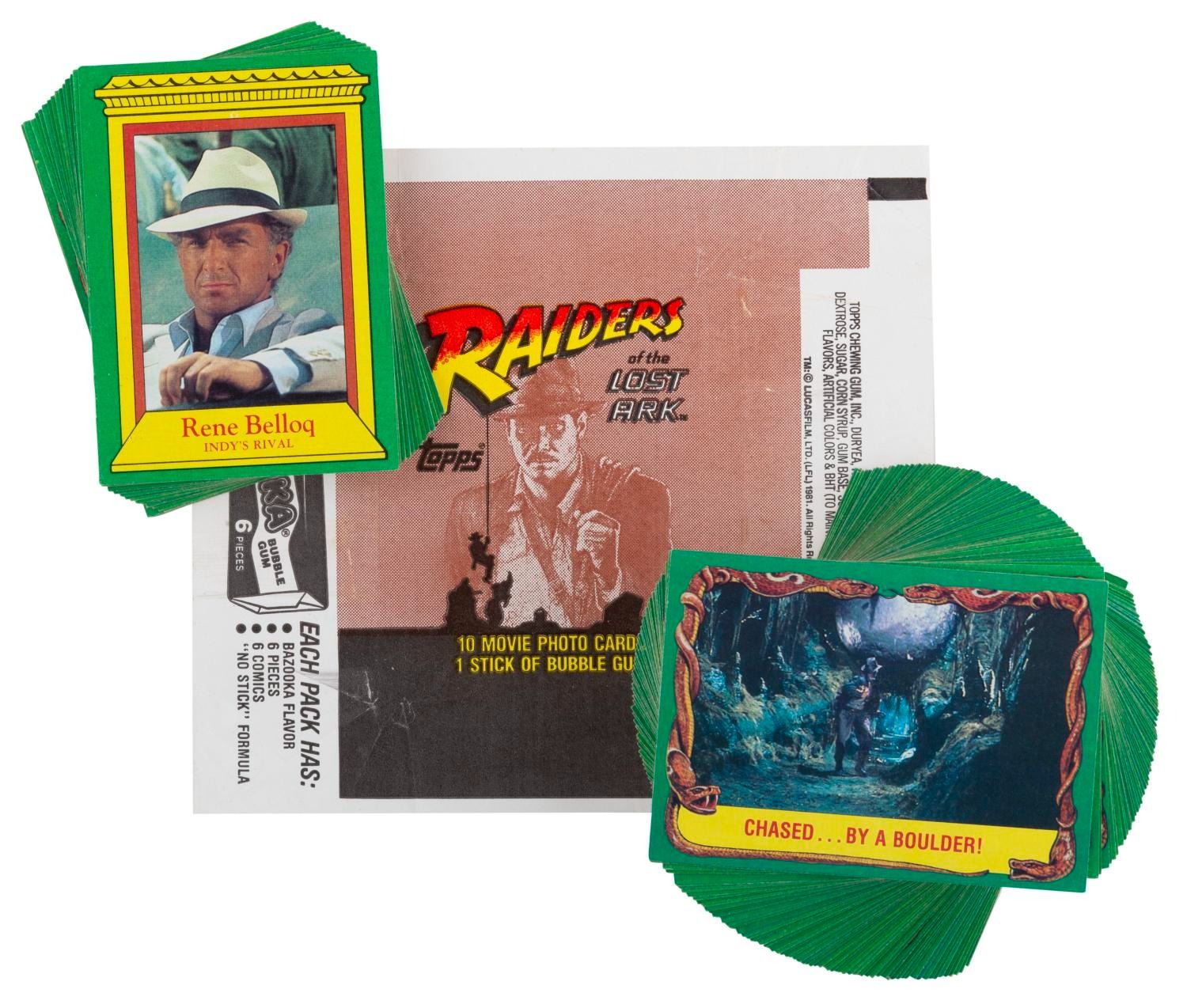 (Topps, 1981) A complete set of Topps “Raiders of the Lost Ark” trading cards including 88 cards and one wax paper wrapper. The cards are in very good to fine condition. The wrapper is in good condition with creases from use.