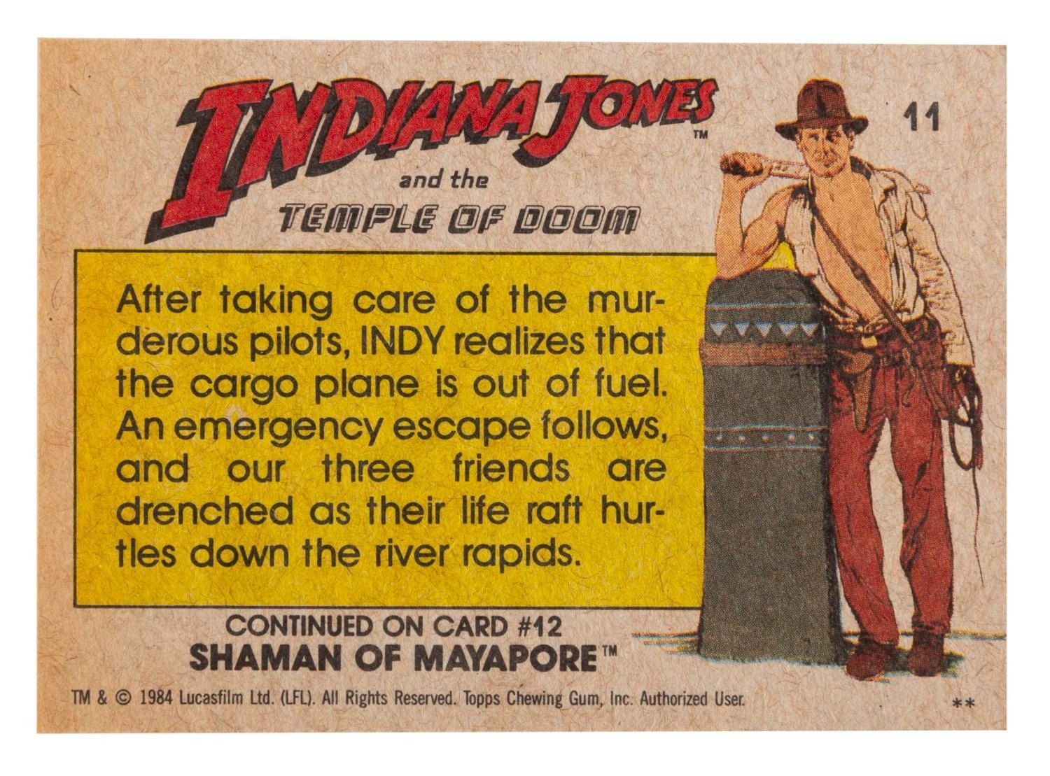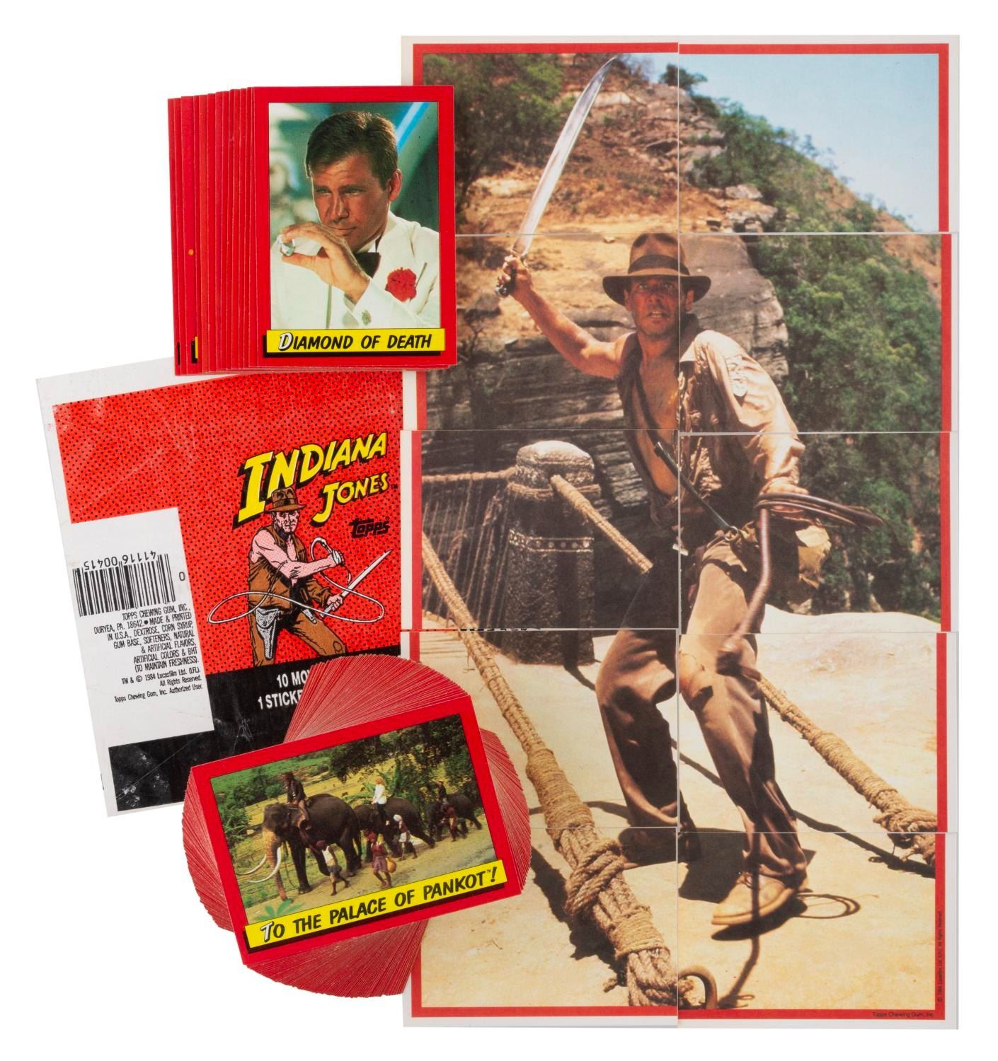 (Topps, 1984) A complete set of Topps “Temple of Doom” trading cards including 88 cards, 11 stickers, and one wax paper wrapper. The cards and stickers are in very good to fine condition with only faint discoloration to the back edge of some. The wrapper is in very good condition with typical creases from use.