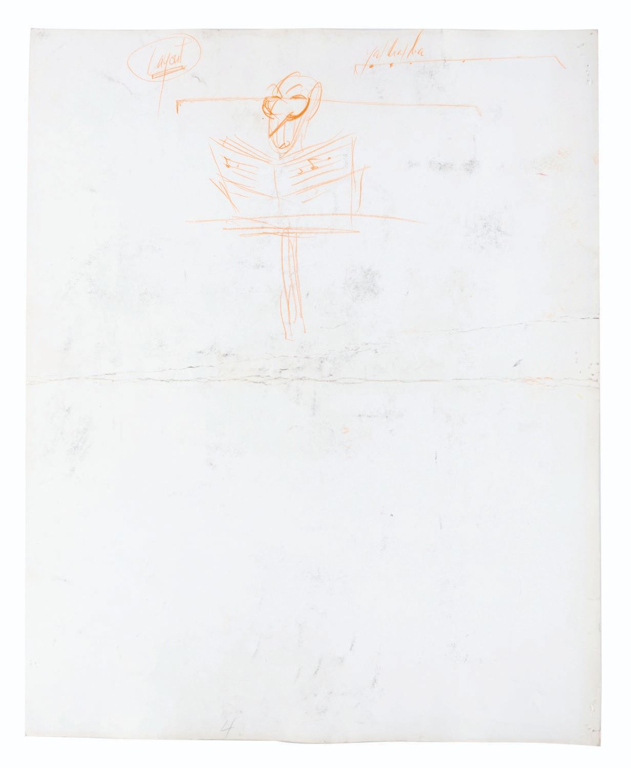 (Clampett, 1962) A pair of photo prints of the complete storyboard for the “Beany and Cecil” episode, “The Hammy Awards.” These photograph prints of the storyboards include hand-written notes in black and orange grease pencil by Bob Clampett and were used by animators during production for reference. Measuring 16” x 20” each, the prints display in good condition with a vertical fold, edge wear from production use, and light warping from age.