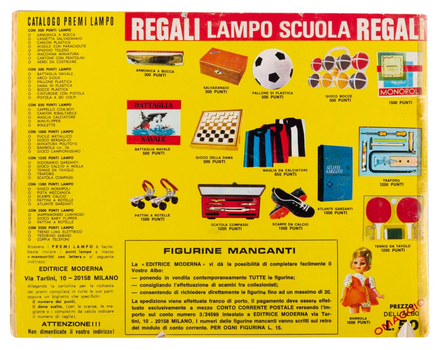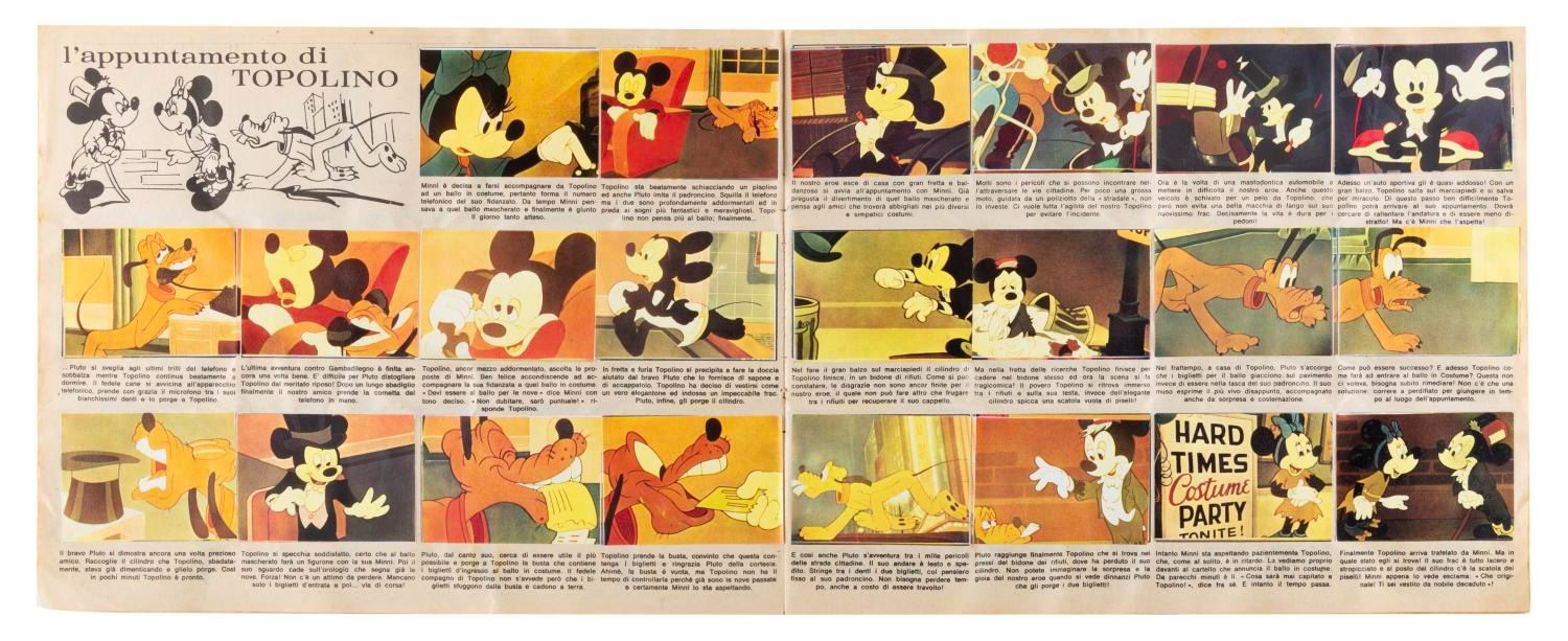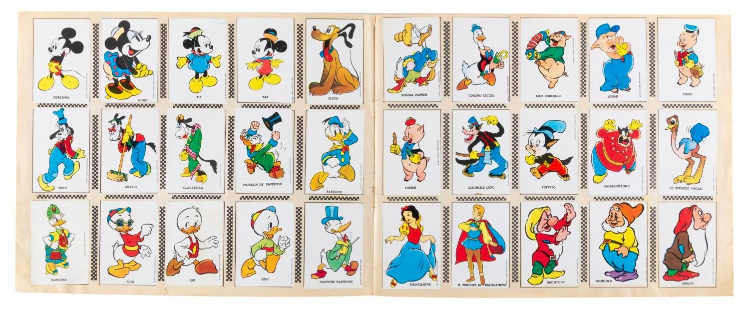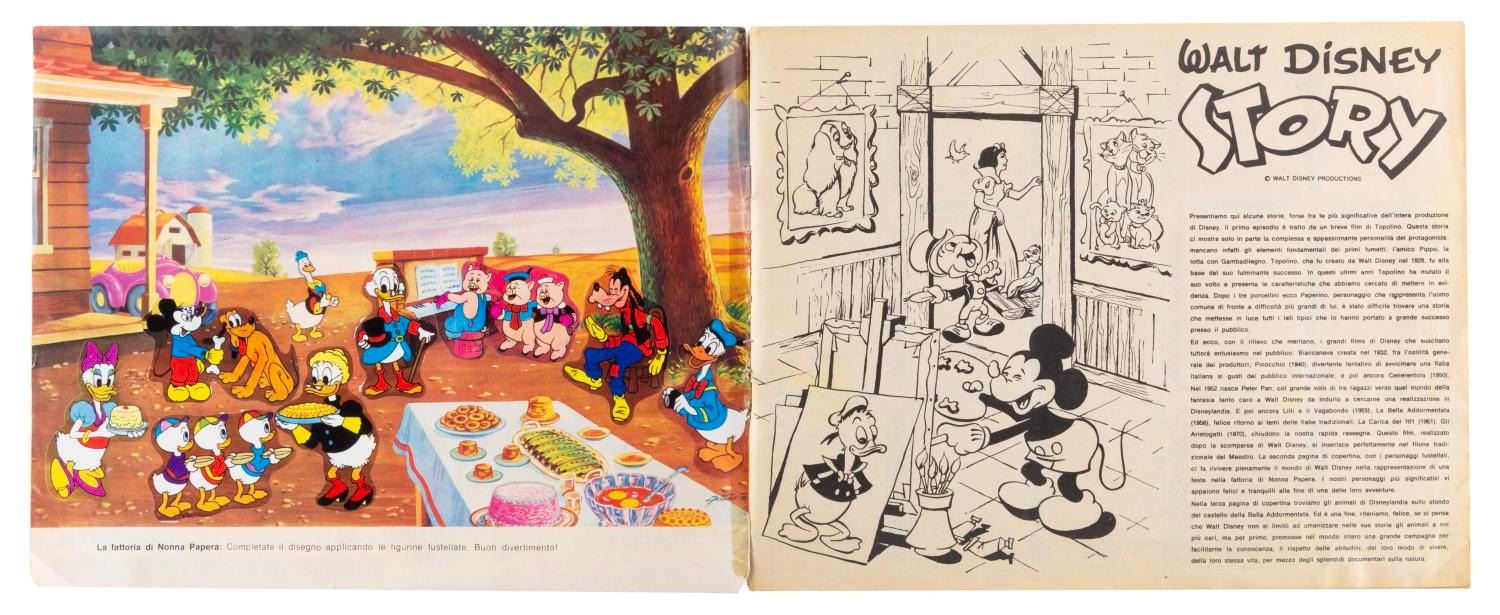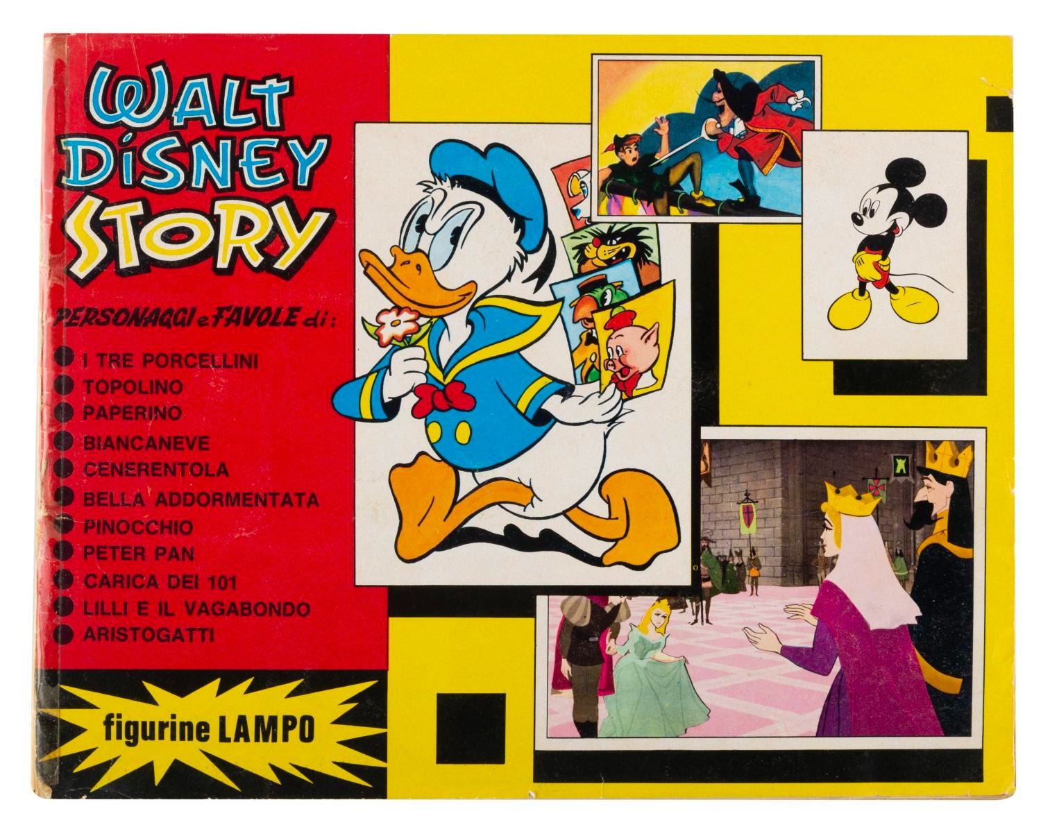 (Editrice Moderna, 1970s) A"Walt Disney Story" Italian sticker book, completly filled with around 300 stickers of Disney characters and stories from Mickey Mouse to"The Aristocats." Measuring 8.5" x 11", the book is in fair condition, with much wear from handling, tape repair to the spine, and a few stickers loose but included.