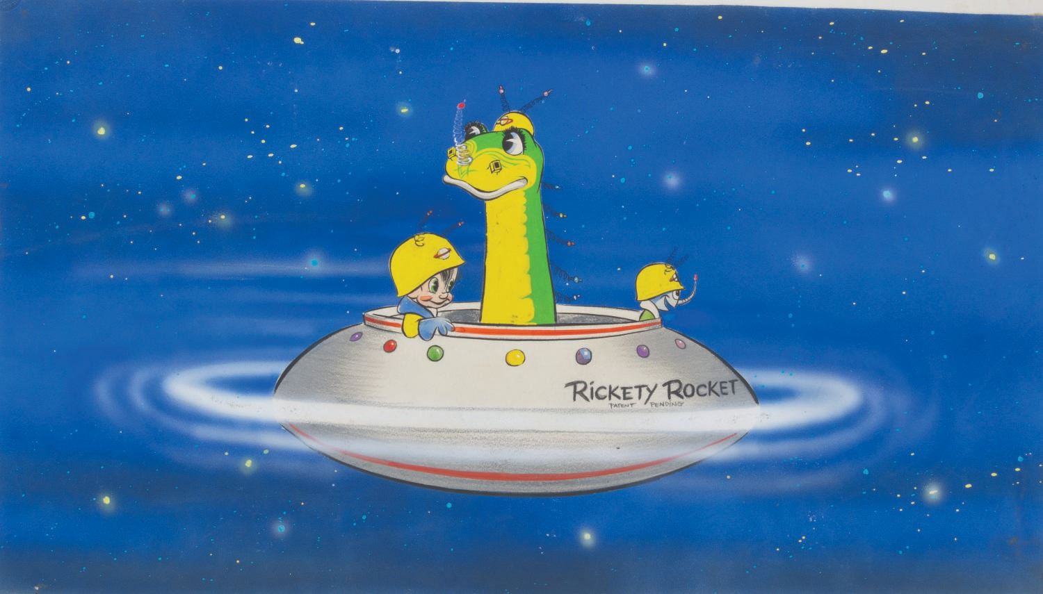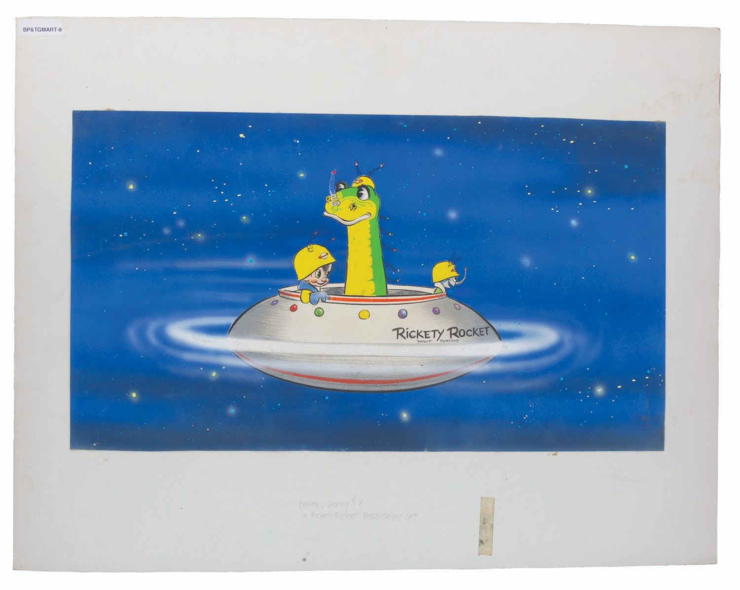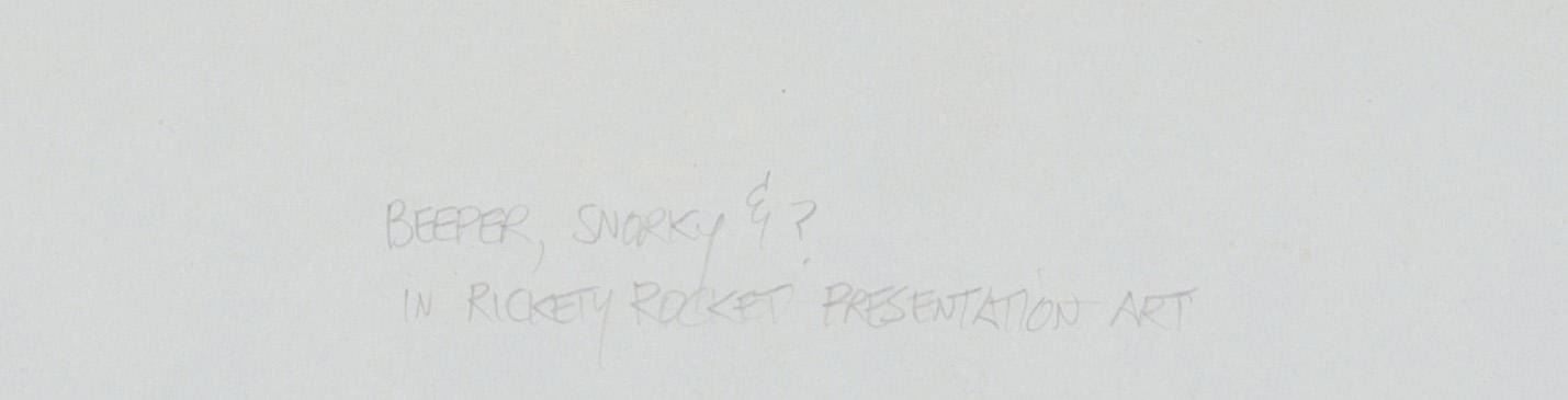 (Clampett, 1959) A concept painting by Bob Clampett for a series titled “Beeper and his Guided Muscle,” combining puppets and animation. The serpent character, “Snorky,” would eventually be introduced to audiences a few years later in “Beany and Cecil.” Accomplished in gouache, ink, pastel, and airbrush and measuring 12.25” x 21.75”, the artwork is in very good condition with corner pinholes and light edge wear.