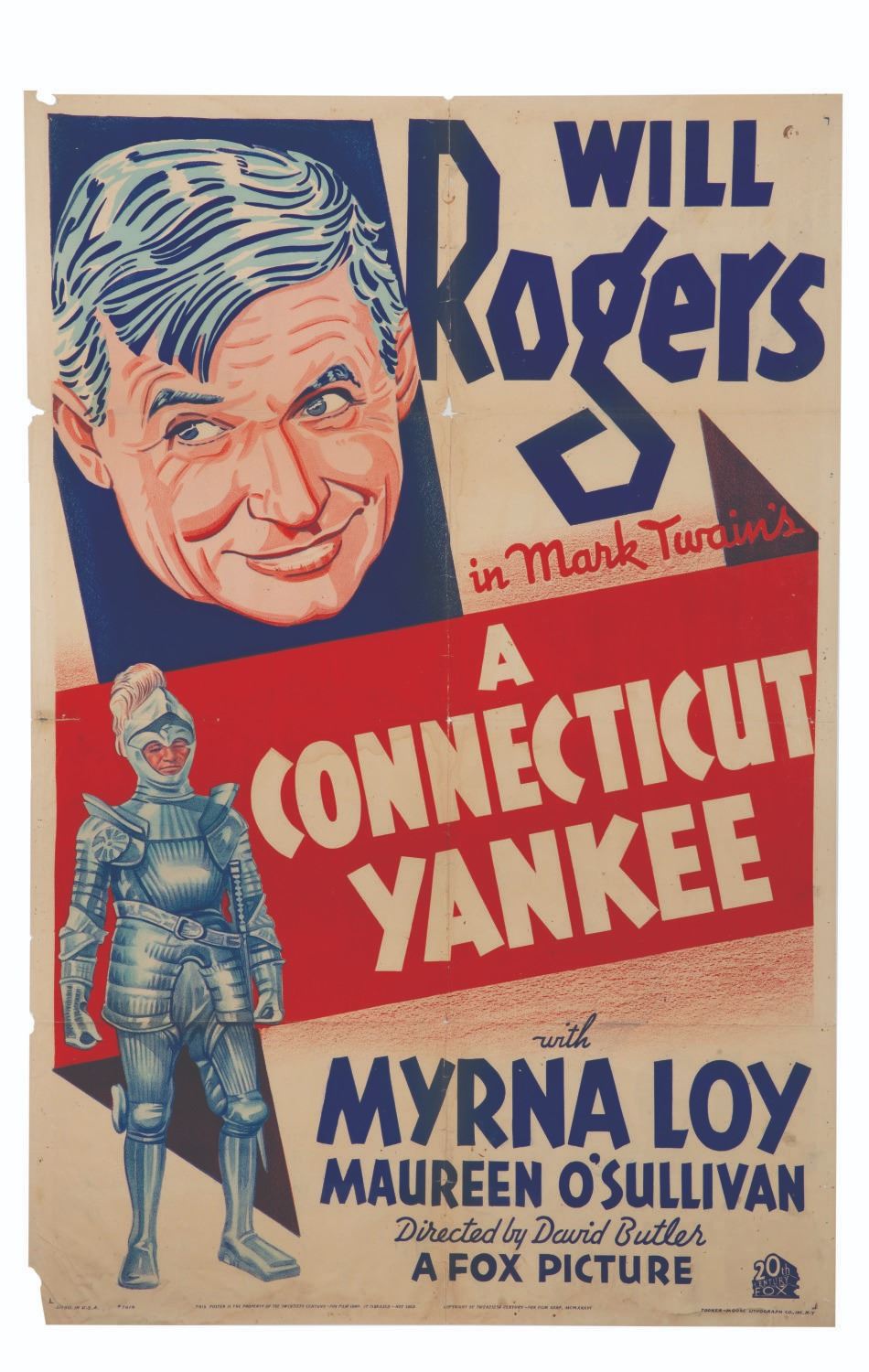 (Fox Film Corporation, 1936) An original one-sheet poster for the rerelease of the 1931 comedy film A Connecticut Yankee in 1936. This first sound adaptation of Mark Twain's novel was a commercial success for Fox, even though released during the Depression. Measuring 27"x41", the poster is in good condition for its age, with bright color and off-white paper, light wear overall, splitting of up to 1" at original fold center points, and chipping along the left side including a .5"x2" tear to the bottom left corner.