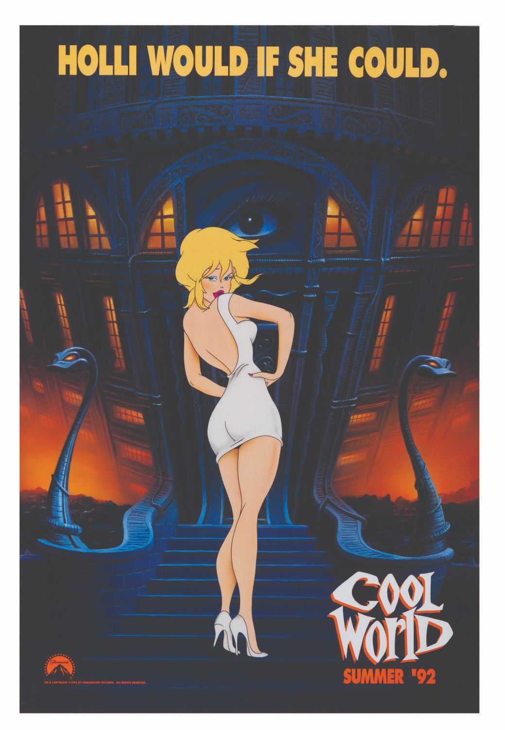 (Paramount, 1992) An advance one-sheet promoting the release of the Ralph Bakshi animated film "Cool World." While the later movie poster would include more characters in its design, the film's early promotional materials emphasized the sex appeal of Holli. Measuring 27" x 40", the poster is in very good condition with light creases and edge wear.