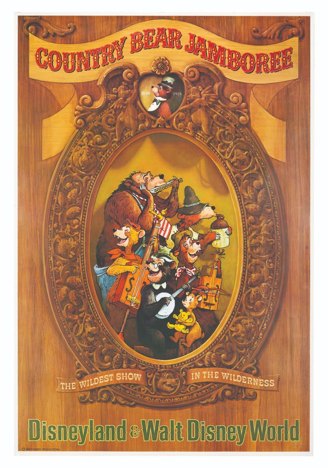 (Disneyland/ Walt Disney World, 1972) An original lithographic attraction poster for the Country Bear Jamboree. This particularly rare variant of the poster, designed by Jim Michaelson, Marc Davis, and Eddie Martinez, was created for both Disneyland and Walt Disney World. Measuring 37" x 54", the poster displays in very good condition with light edge wear and creasing.