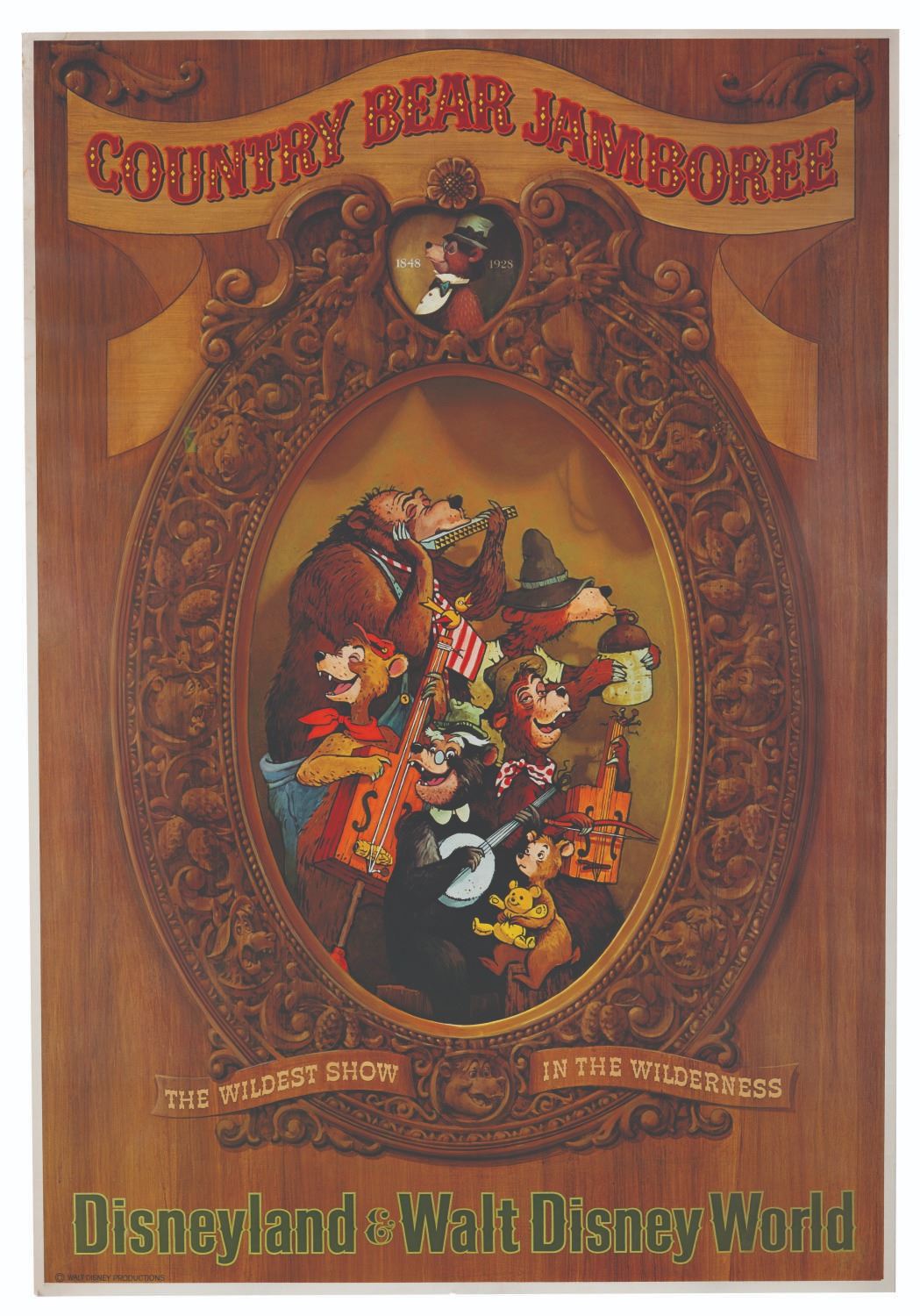 (Disneyland/ Walt Disney World, 1972) An original lithograph attraction poster for the Country Bear Jamboree. This particularly rare variant of the poster, designed by Jim Michaelson, Marc Davis, and Eddie Martinez, was created for both Disneyland and Walt Disney World. Measuring 37" x 54", the poster is in good condition with edge wear, creasing, and water stains to the upper left corner.
