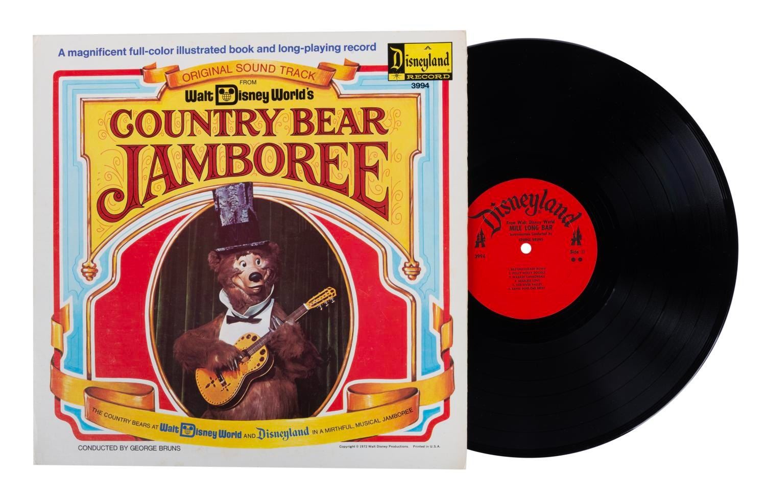 (Walt Disney World, 1972) A book and record featuring George Bruns’ music from the Country Bear Jamboree attraction at Walt Disney World and Disneyland. This 11-page book and record measures 12.5"x12.5". The vinyl itself is in a fine condition, and the album cover and sleeve are in very good condition with minor scuffs and wear to edges and corners.