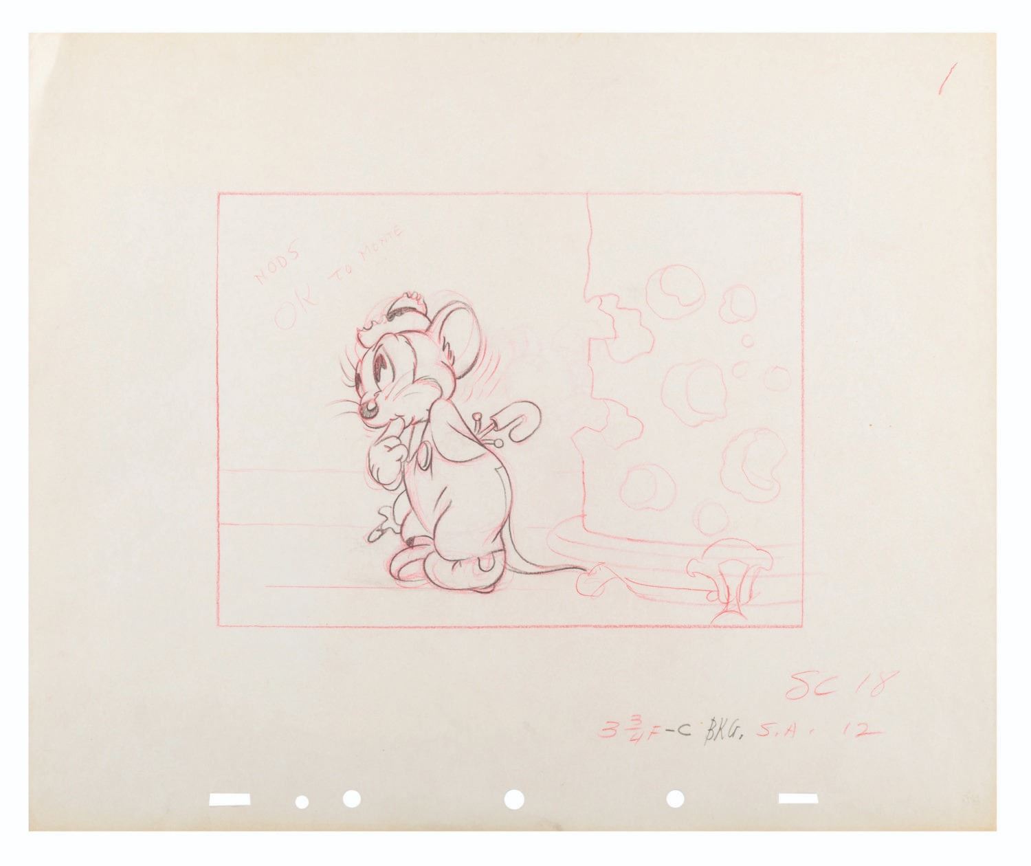 (Disney, 1936) A production layout drawing of Abner Countrymouse from the Silly Symphonies short “The Country Cousin.” With a character image size of 3” x 3.75” on 10” x 12” animation paper, the drawing is in very good condition with light creases, production notations, and discoloration from age.