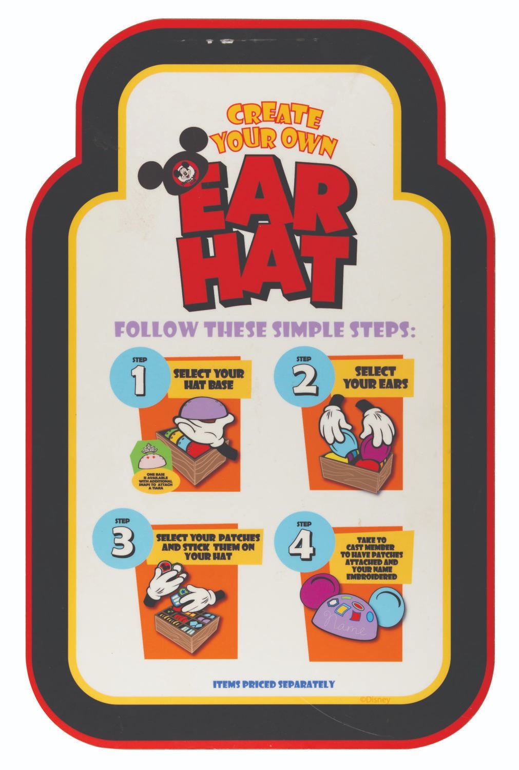 (Downtown Disney, 2009) A sign displayed at the Create Your Own Ear Hat shop at Downtown Disney. Located between Design-A-Tee and The Art of Disney, the store offered Guests the opportunity to design their own custom Ear Hats with a wide selection of colors, patches, and embroidery. Measuring 11" x 17.25", the sign displays in good, Park-used condition with light scuffs and scratches.