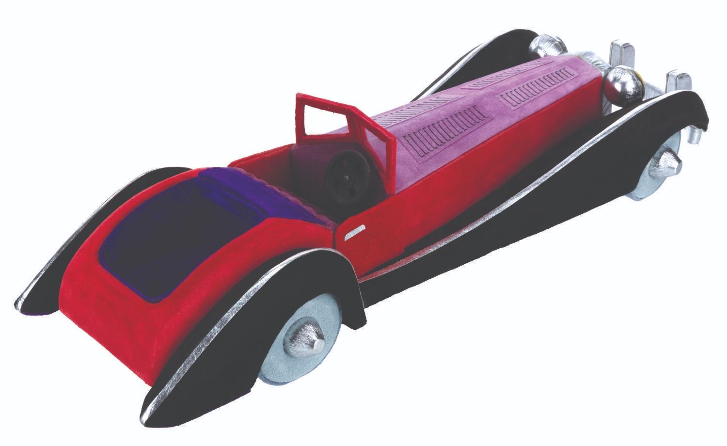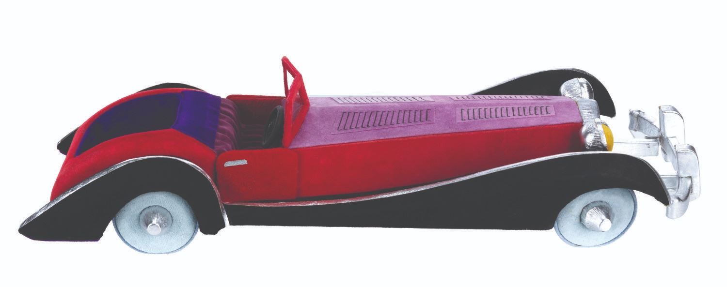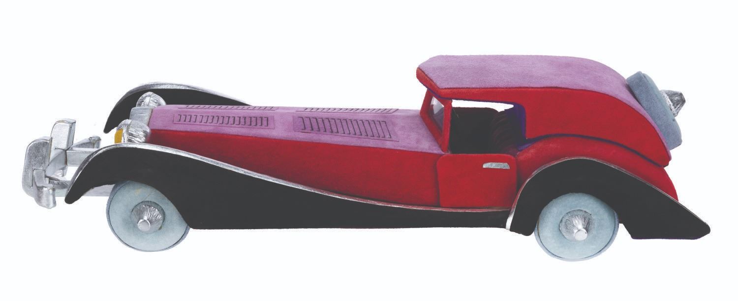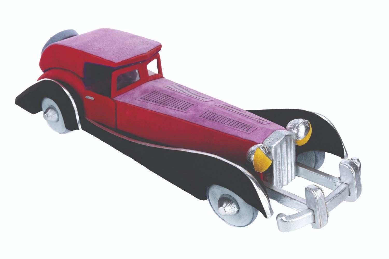 (Disneyana, 1997) An unusual and luxurious suede and leather-covered box in the shape of Cruella De Vil's car from "One Hundred and One Dalmatians." Created by Paddy Gordon in an edition size of only 30 for the 1997 Disneyana Convention, the top removes to reveal a 2.5" x 2.5" space perfect for discreetly storing small valuables. Measuring 7" x 18.5" x 4.5" high, the box is in very good to fine condition, signed on the bottom by the artist.