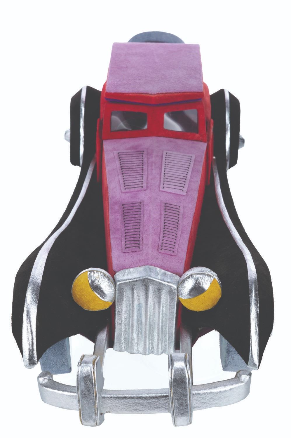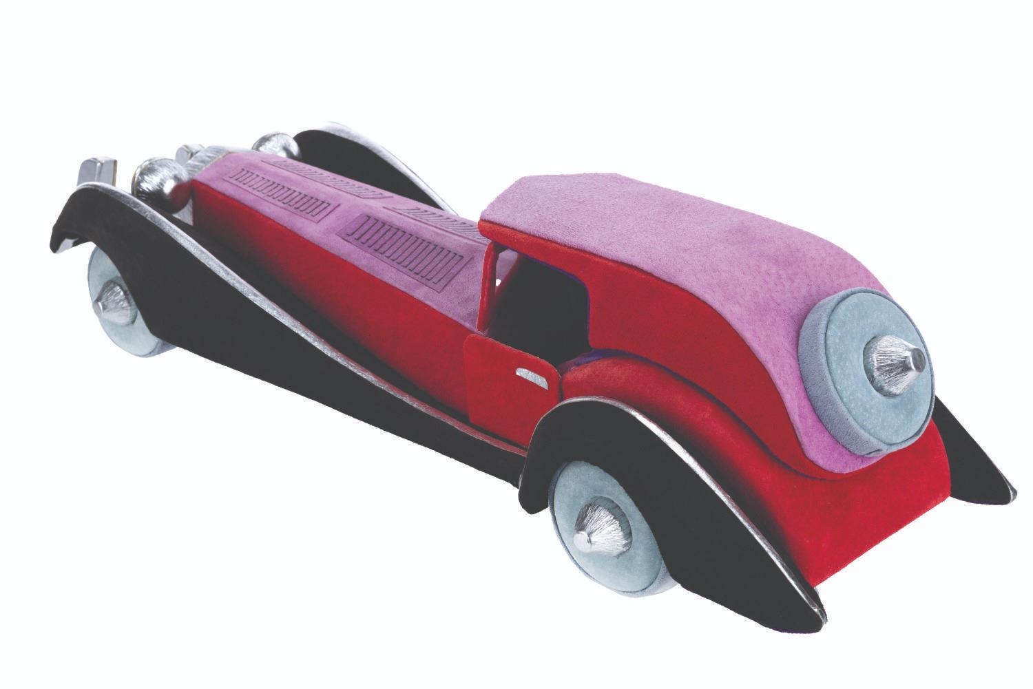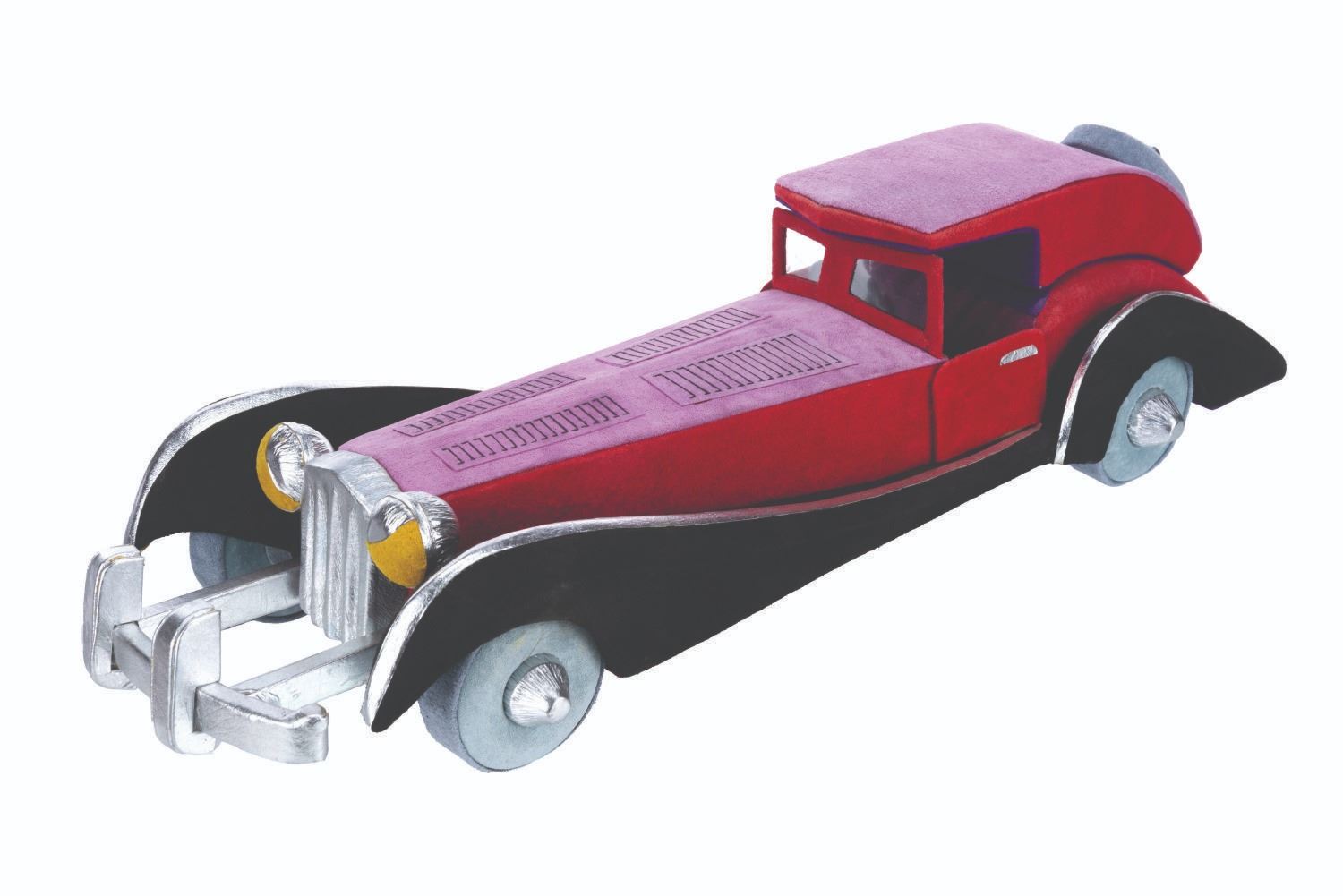 (Disneyana, 1997) An unusual and luxurious suede and leather-covered box in the shape of Cruella De Vil's car from "One Hundred and One Dalmatians." Created by Paddy Gordon in an edition size of only 30 for the 1997 Disneyana Convention, the top removes to reveal a 2.5" x 2.5" space perfect for discreetly storing small valuables. Measuring 7" x 18.5" x 4.5" high, the box is in very good to fine condition, signed on the bottom by the artist.