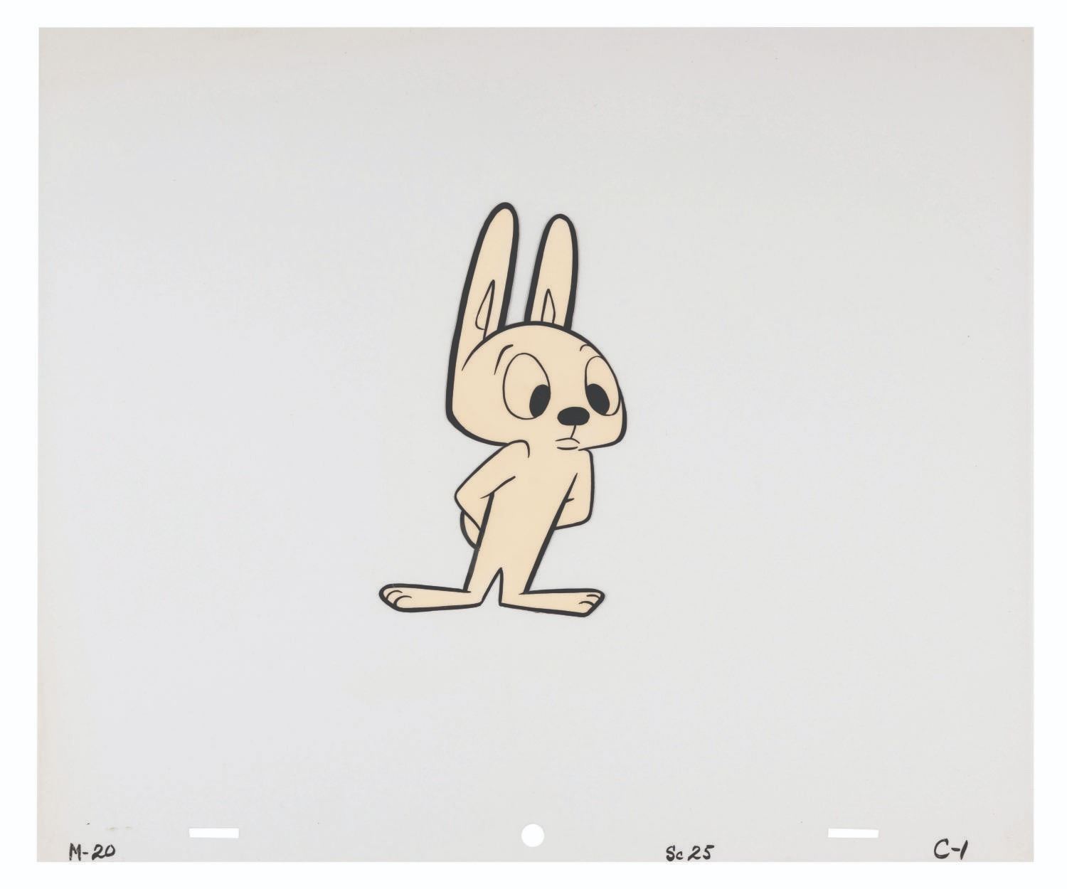 (Jay Ward, 1950) A hand-painted production cel of “Crusader Rabbit.” The animated series created by Jay Ward was the first to be produced specifically for television. With a character image size of 5.25” x 3” on an untrimmed 10.5” x 12.5” cel, the piece is in very good condition with handling wear. Jay Ward was a prominent figure in children's animation during the 1960s, known for his remarkable roster of cartoon characters, including Rocky and Bullwinkle, Dudley Do-Right, Peabody and Sherman, and George of the Jungle. His influence extended beyond television shows, as his studio also designed iconic cereal mascots such as Cap’n Crunch, Quisp, and Quake, along with a series of animated commercials that helped solidify the connection between breakfast cereals and Saturday morning cartoons. Perhaps Jay Ward’s most significant contribution to the medium was the creation of "Crusader Rabbit," which holds the distinction of being the first animated series made exclusively for television.
