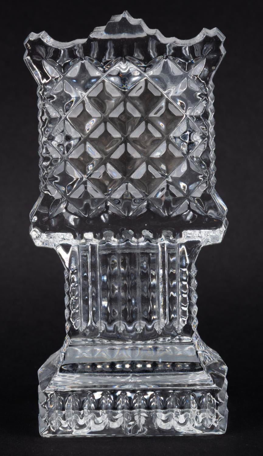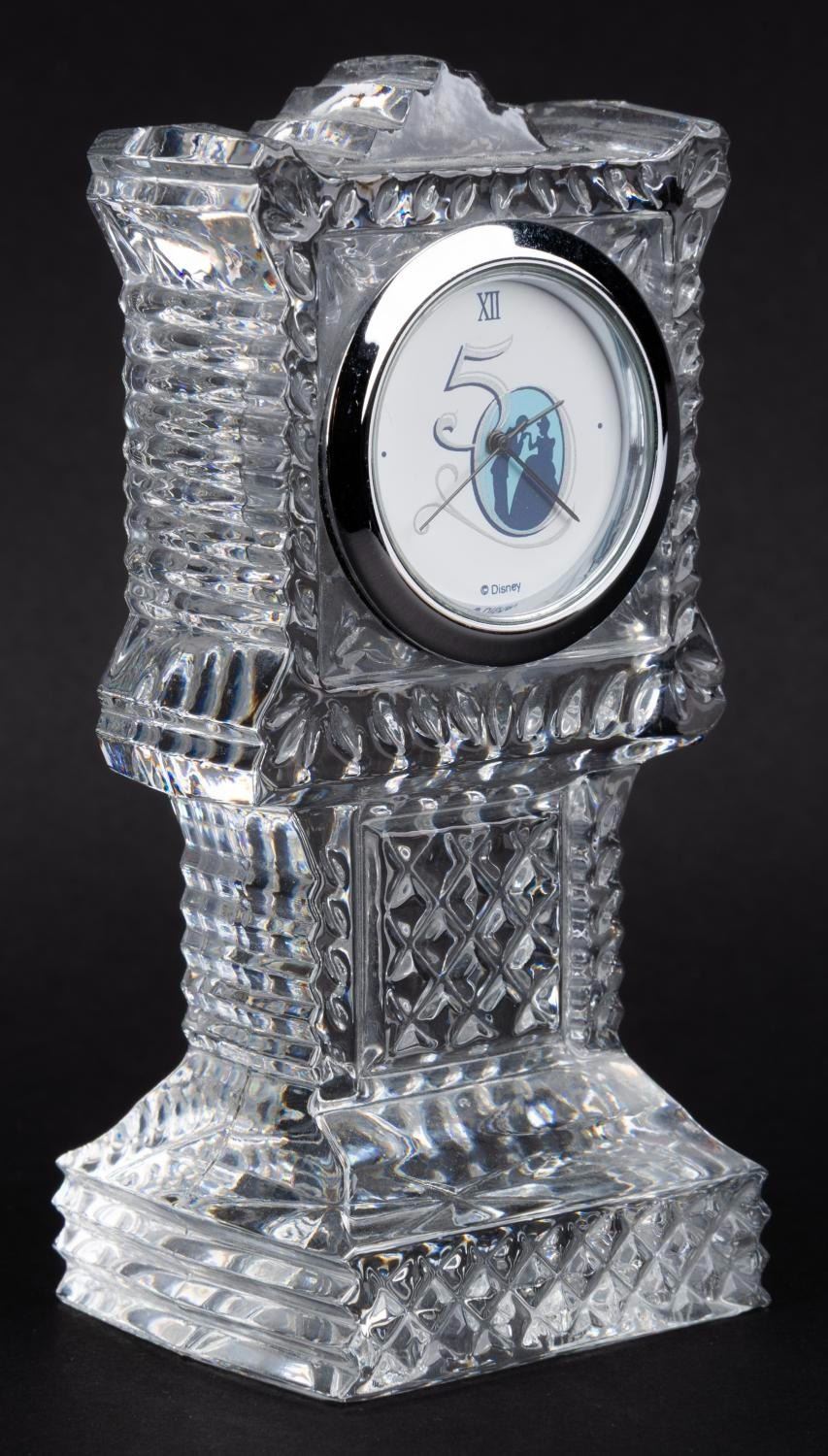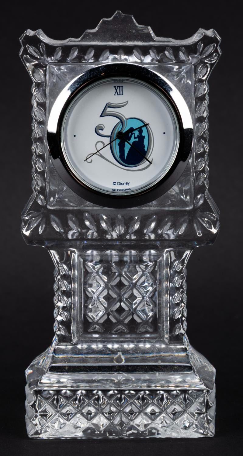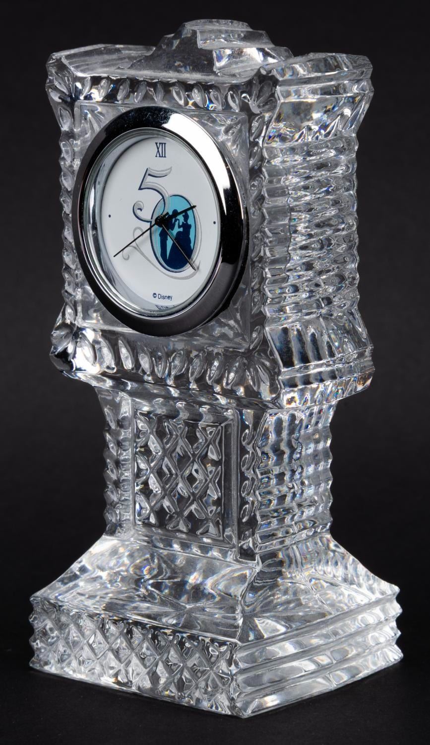 (Galway Crystal, 2000) A Galway Irish crystal clock tower desk clock from Cinderella's Royal 50th Anniversary Celebration event held on Feb 12th 2000, at the Disneyland Hotel. The clock requires a battery (not included) for operation and is untested and may require service to function. Measuring 1.75 " x 2 " x 4.25 " tall, the clock is in very good condition with light wear.