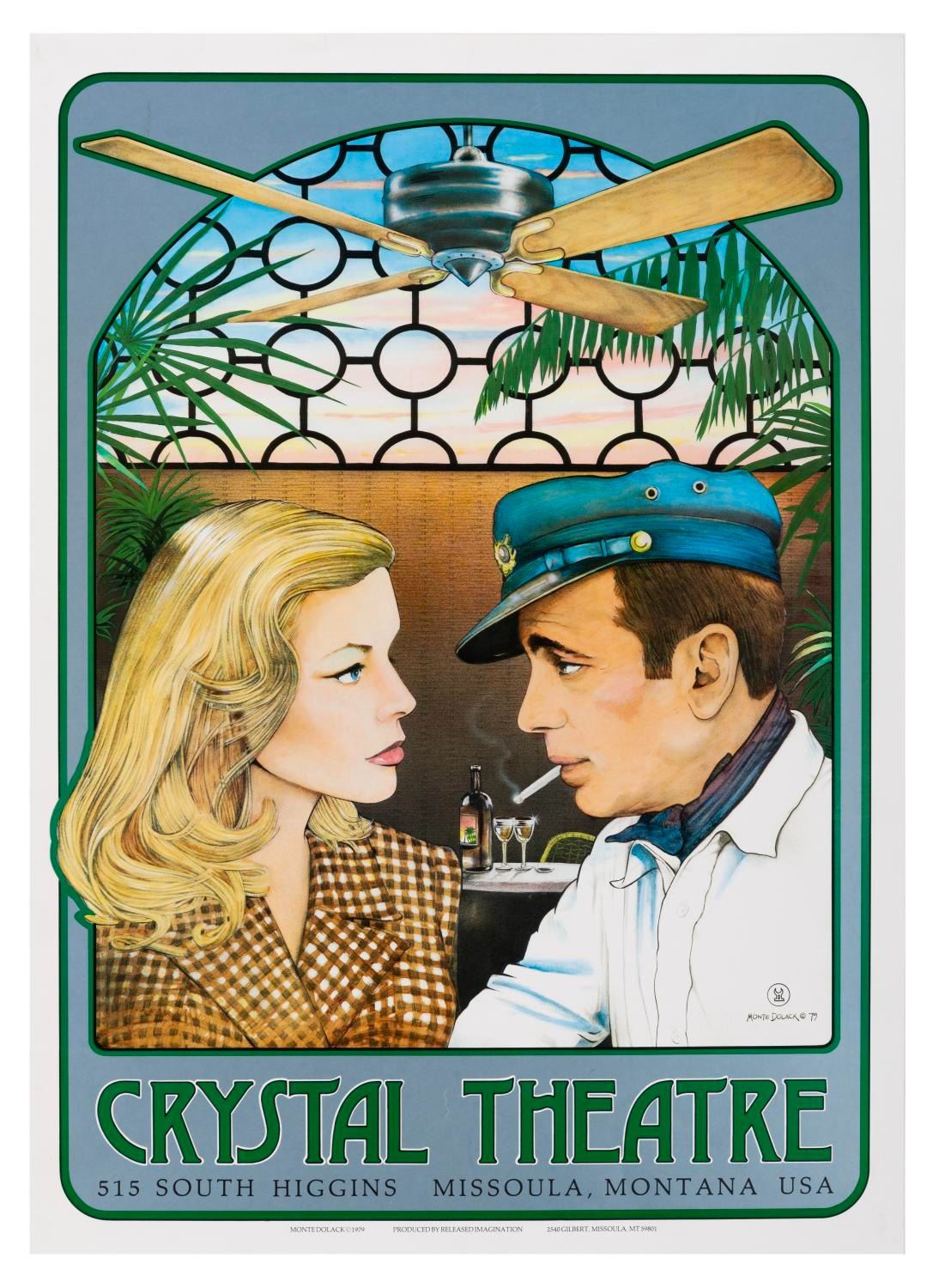 (Monte Dolack, 1979) A poster of Humphrey Bogart and Lauren Bacall in "To Have and Have Not." The art was commissioned by the Crystal Theatre in Missoula, Montana, from artist Monte Dolack. Measuring 18.5" x 25.5", the poster is in very good condition with a few small creases in the upper silver area.