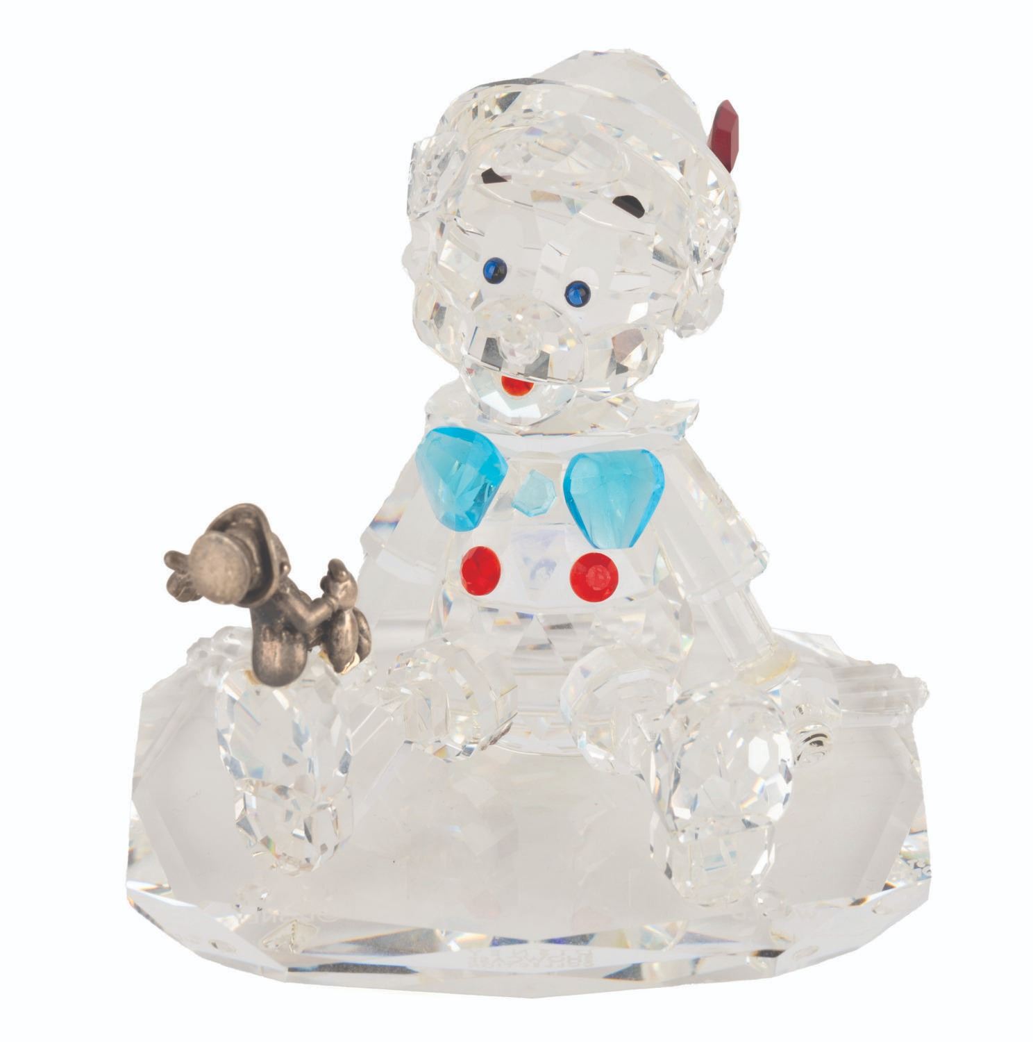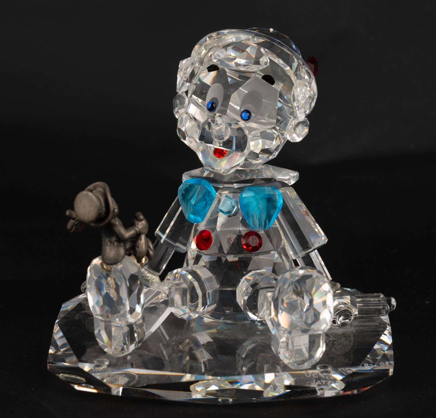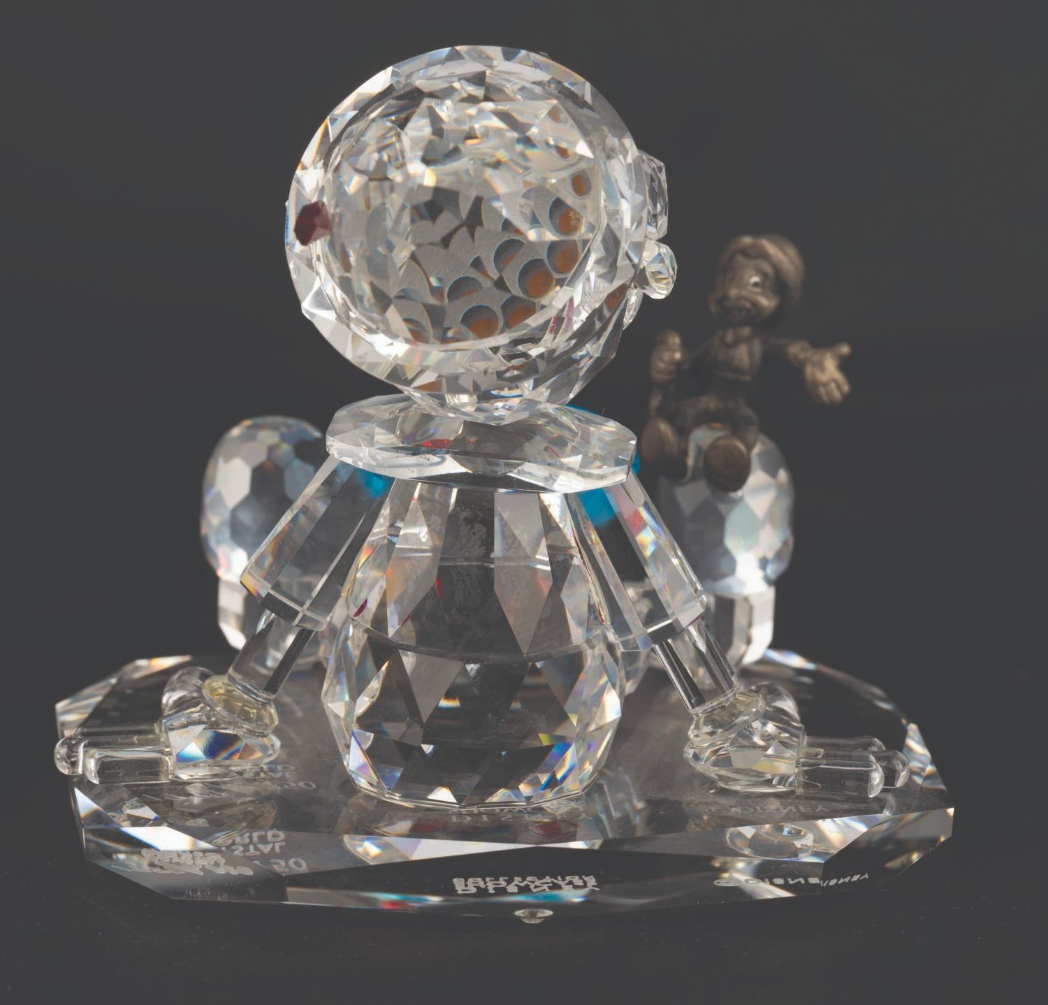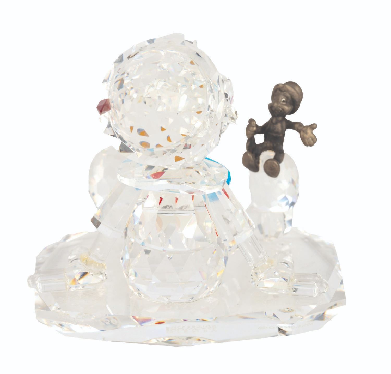 (Crystal World, 1990s-2000s) A Disney Showcase Collection figurine of Pinocchio made of crystal with a sterling silver Jiminy Cricket perched on his shoe. The figurine was released as part of a limited edition numbered 1797/2750. Measuring 2.5” x 3” x 2.5” tall with its original 6” x 6” x 4” tall box, the figurine is in fine condition.