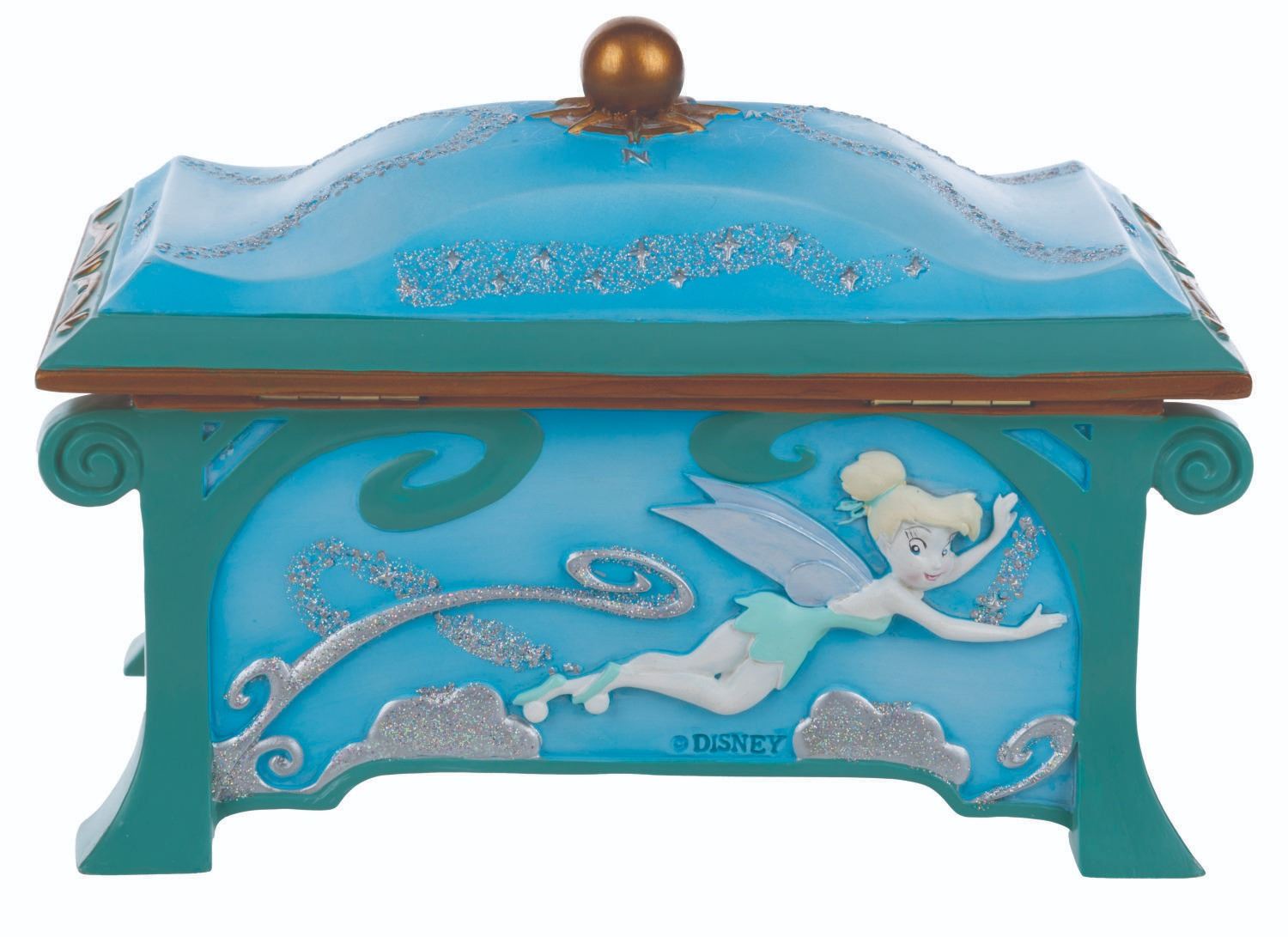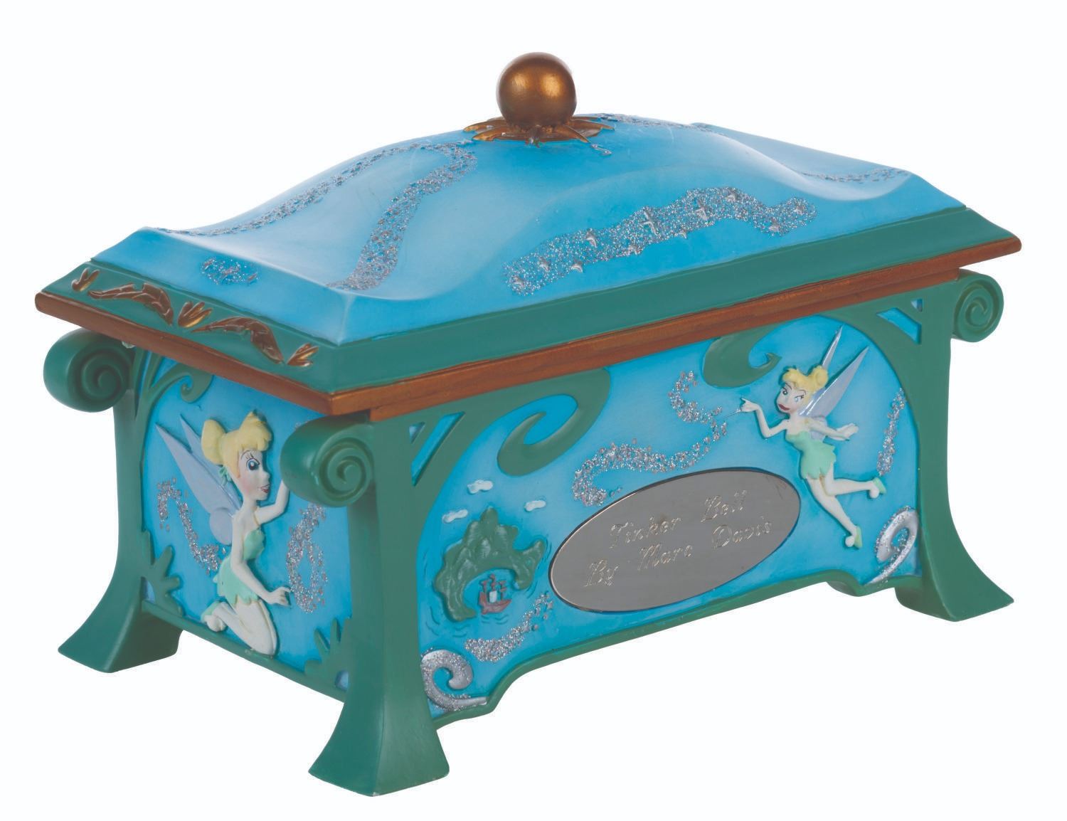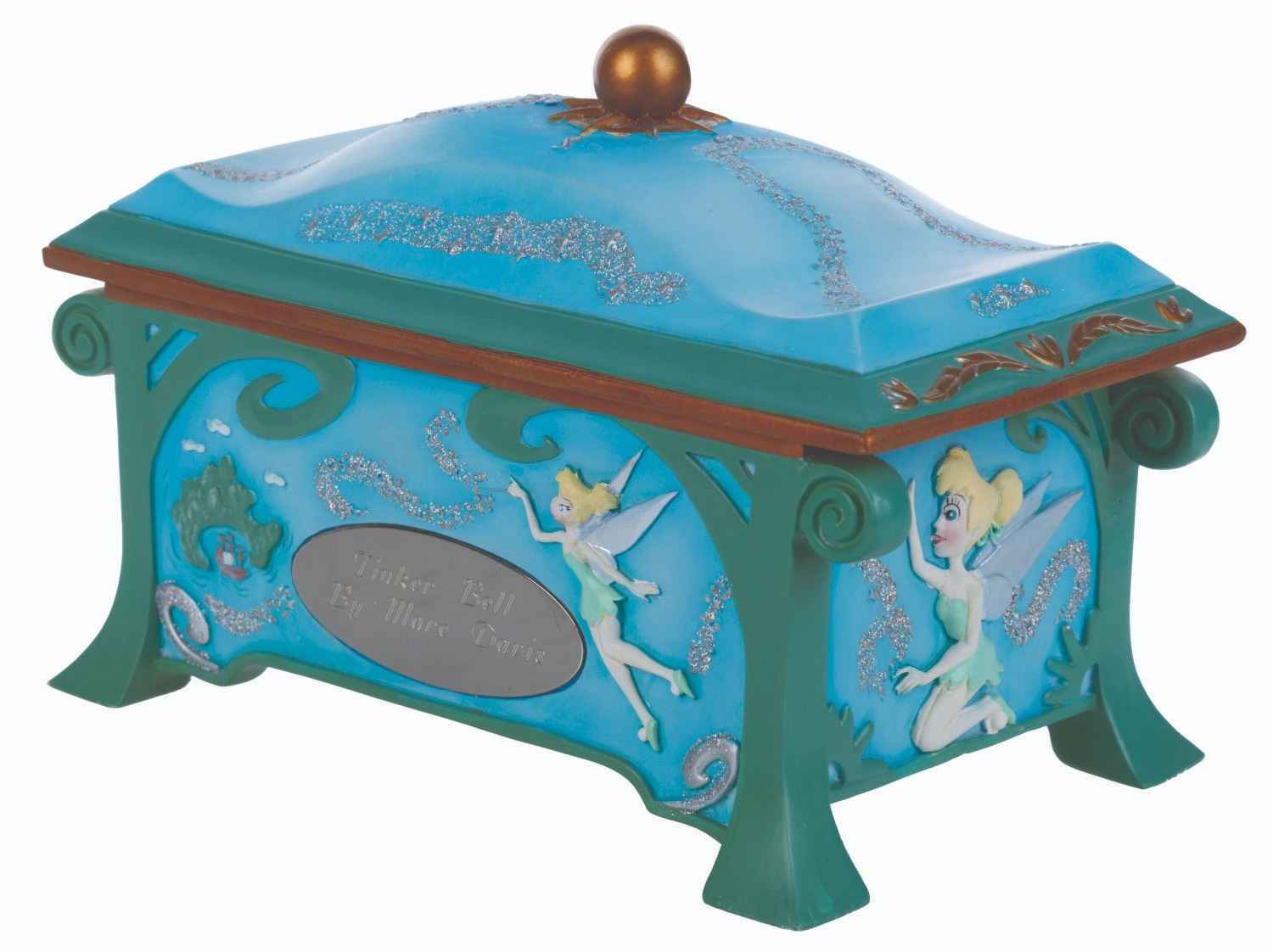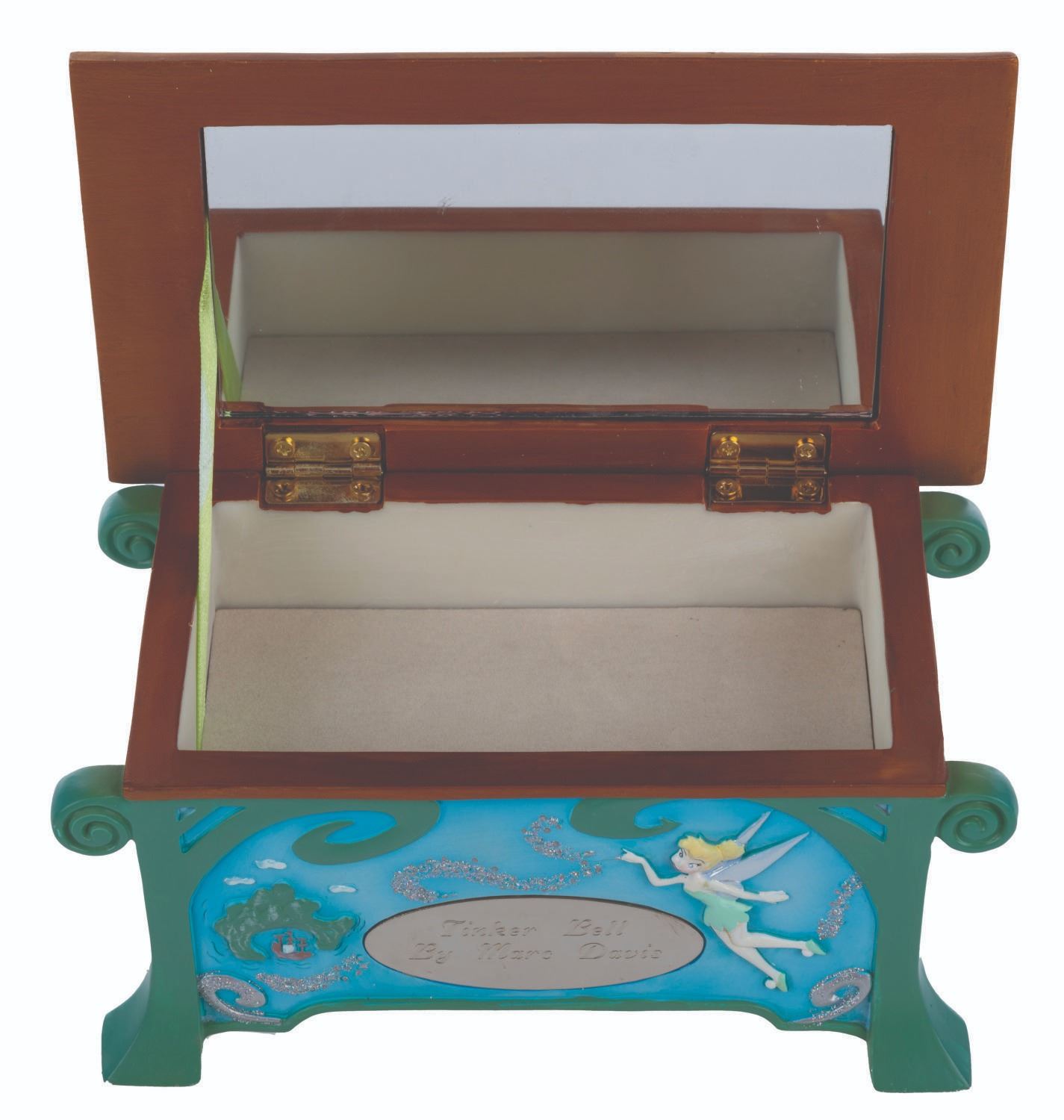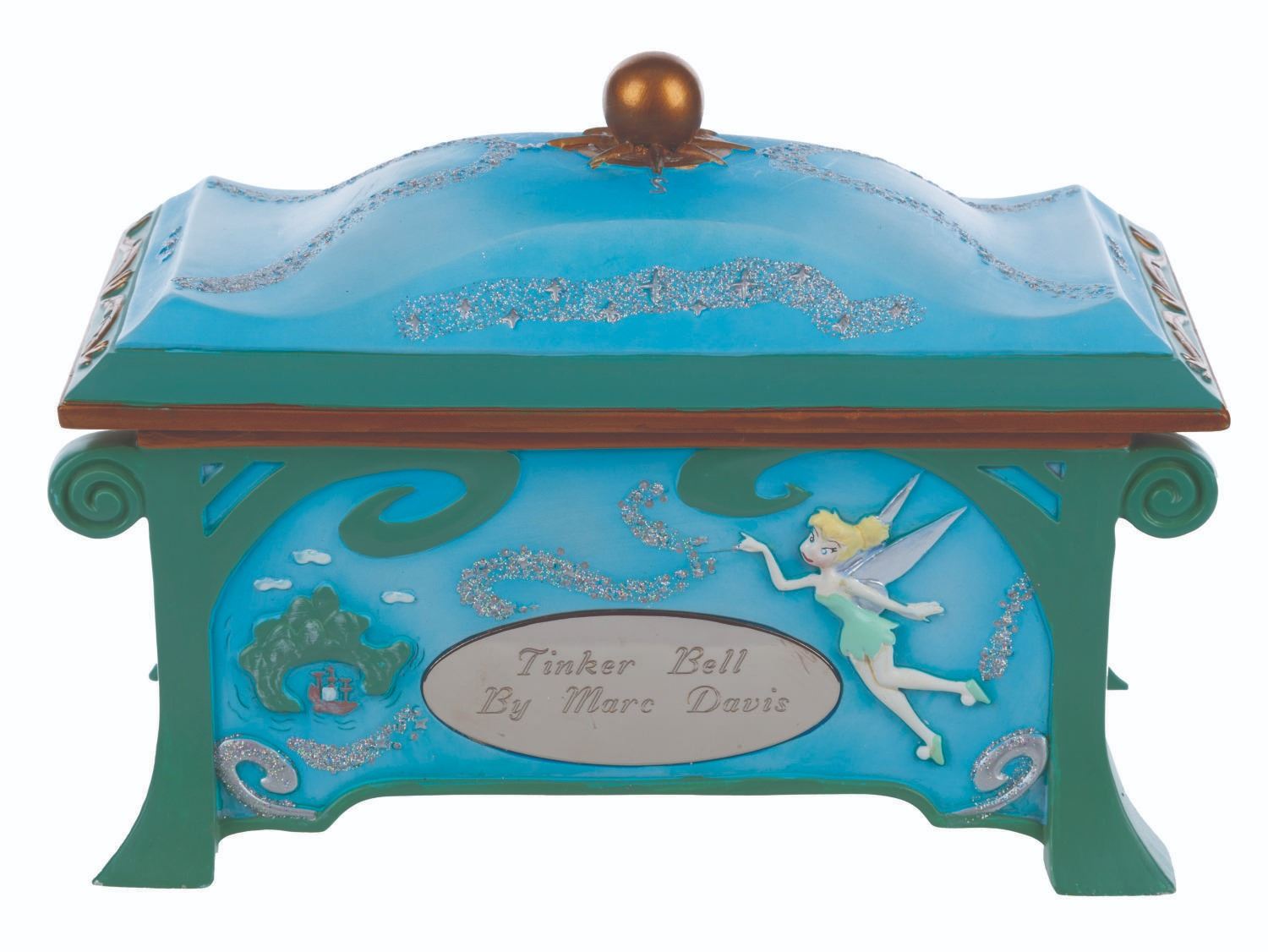 (Disney, 2008) A customized Tinker Bell music box from Disney Store Online. The music box's front plaque is engraved with "Tinker Bell by Marc Davis," a customizable option for customers. When wound the music box plays “You Can Fly” and worked when tested. Measuring 6.5” x 4.” x 4.75”, the music box displays in very good condition with very light wear to the paint on the corners of the legs and lid.