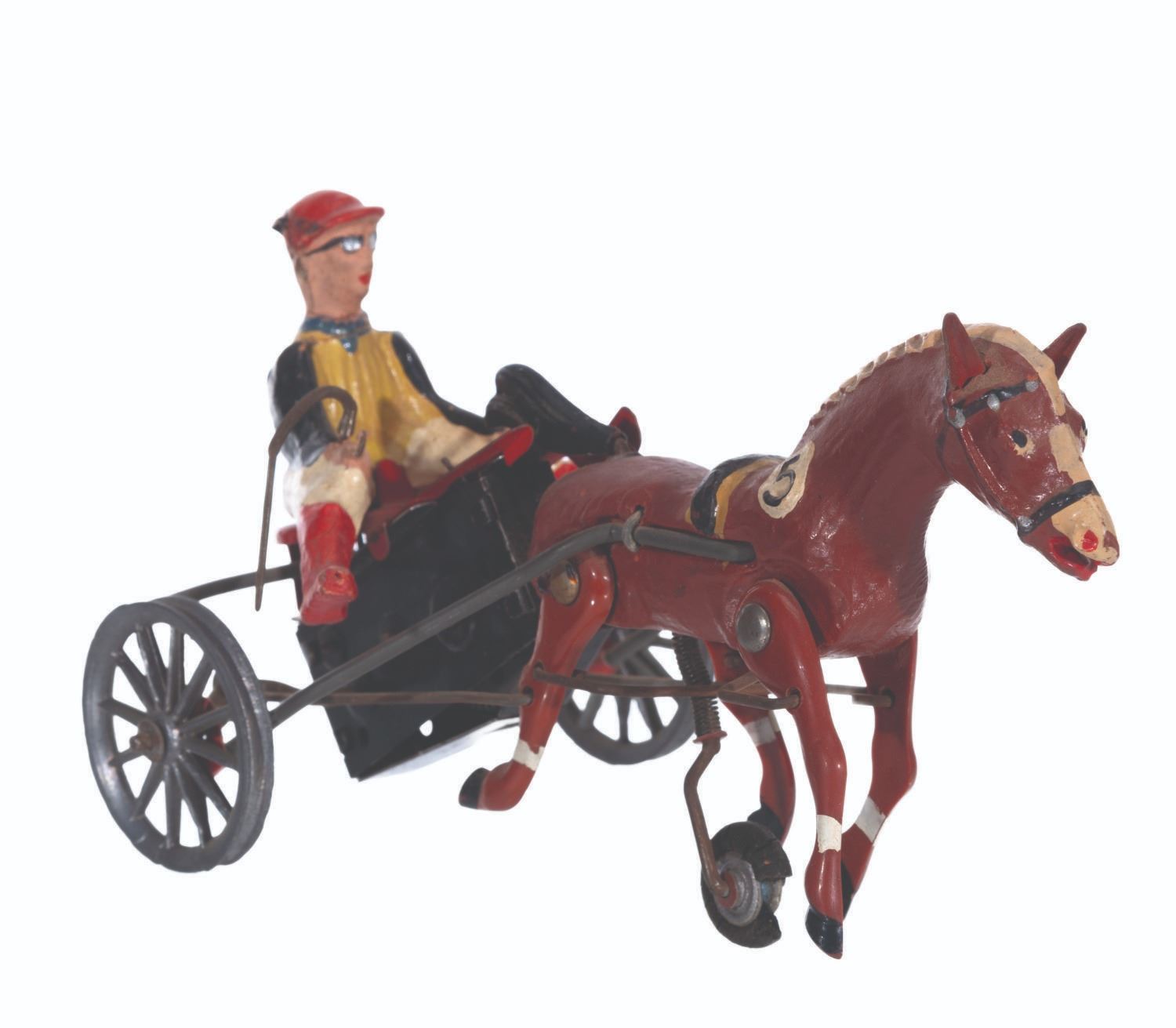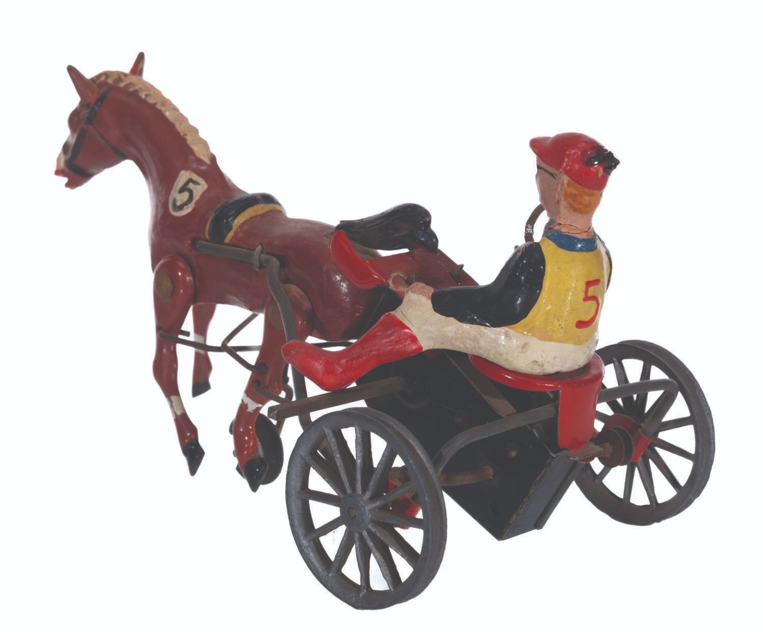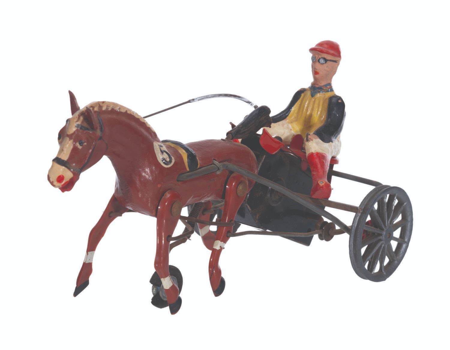 (D.G.M., 1940s-1960s) A racehorse and jockey wind-up toy manufactured by D.G.M. of Germany. The toy has been tested and is not in working condition. Measuring 3.5” x 6.5” x 3.5” tall, the toy displays in very good condition with paint loss, scratches, wear, a limp whip, and cracks, including cracks around the jockey’s neck.