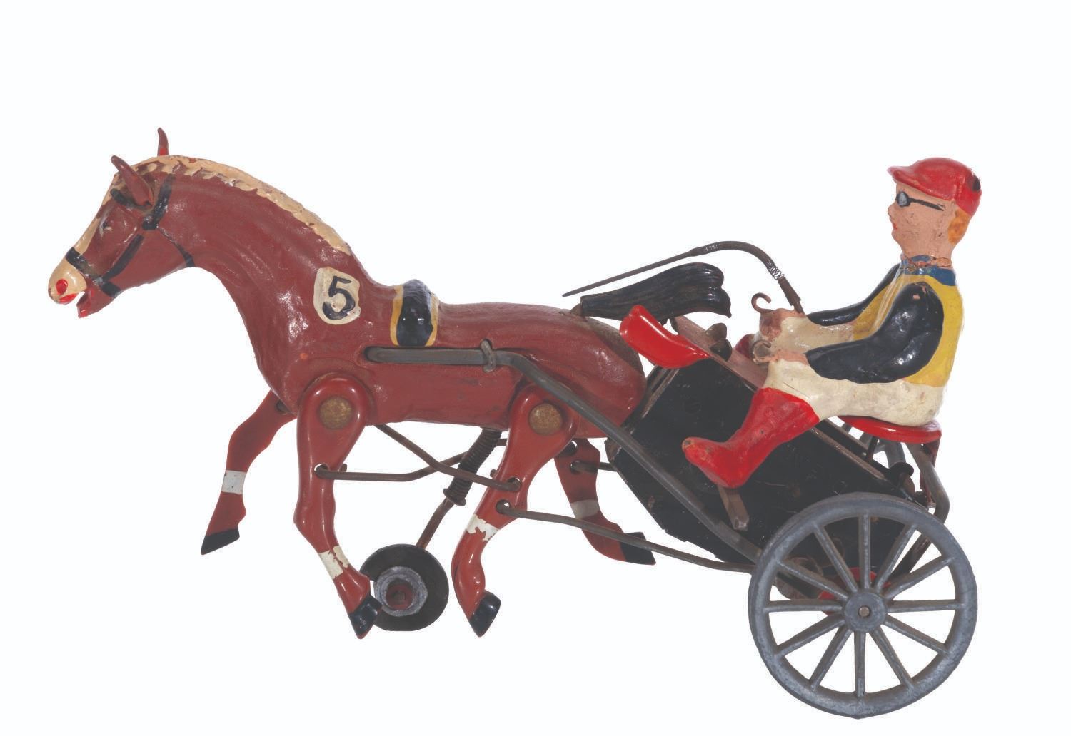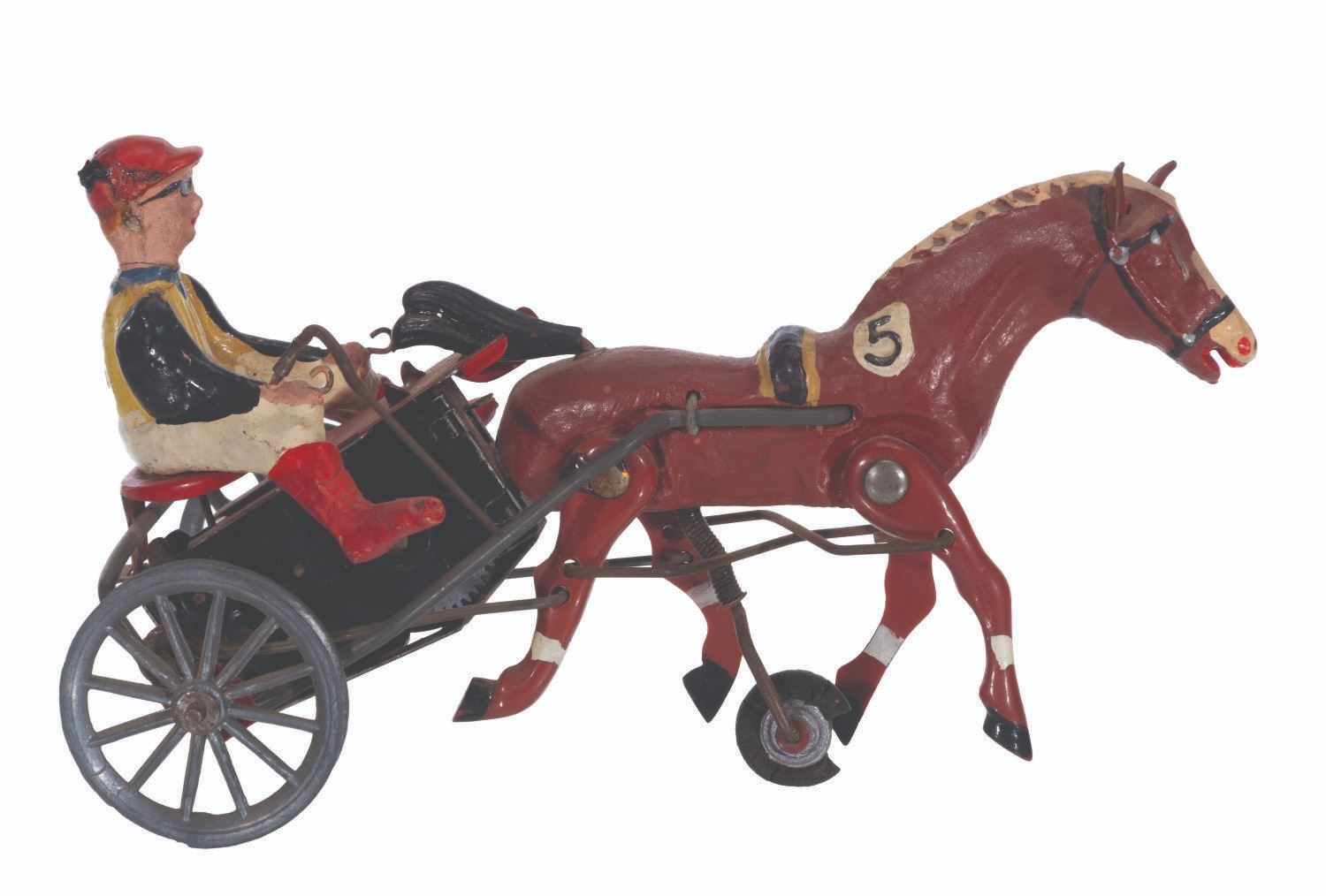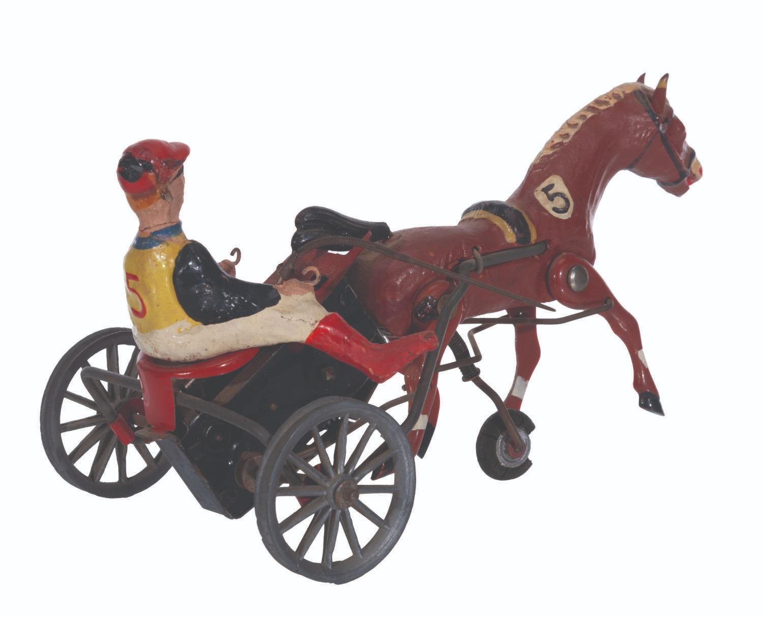 (D.G.M., 1940s-1960s) A racehorse and jockey wind-up toy manufactured by D.G.M. of Germany. The toy has been tested and is not in working condition. Measuring 3.5” x 6.5” x 3.5” tall, the toy displays in very good condition with paint loss, scratches, wear, a limp whip, and cracks, including cracks around the jockey’s neck.