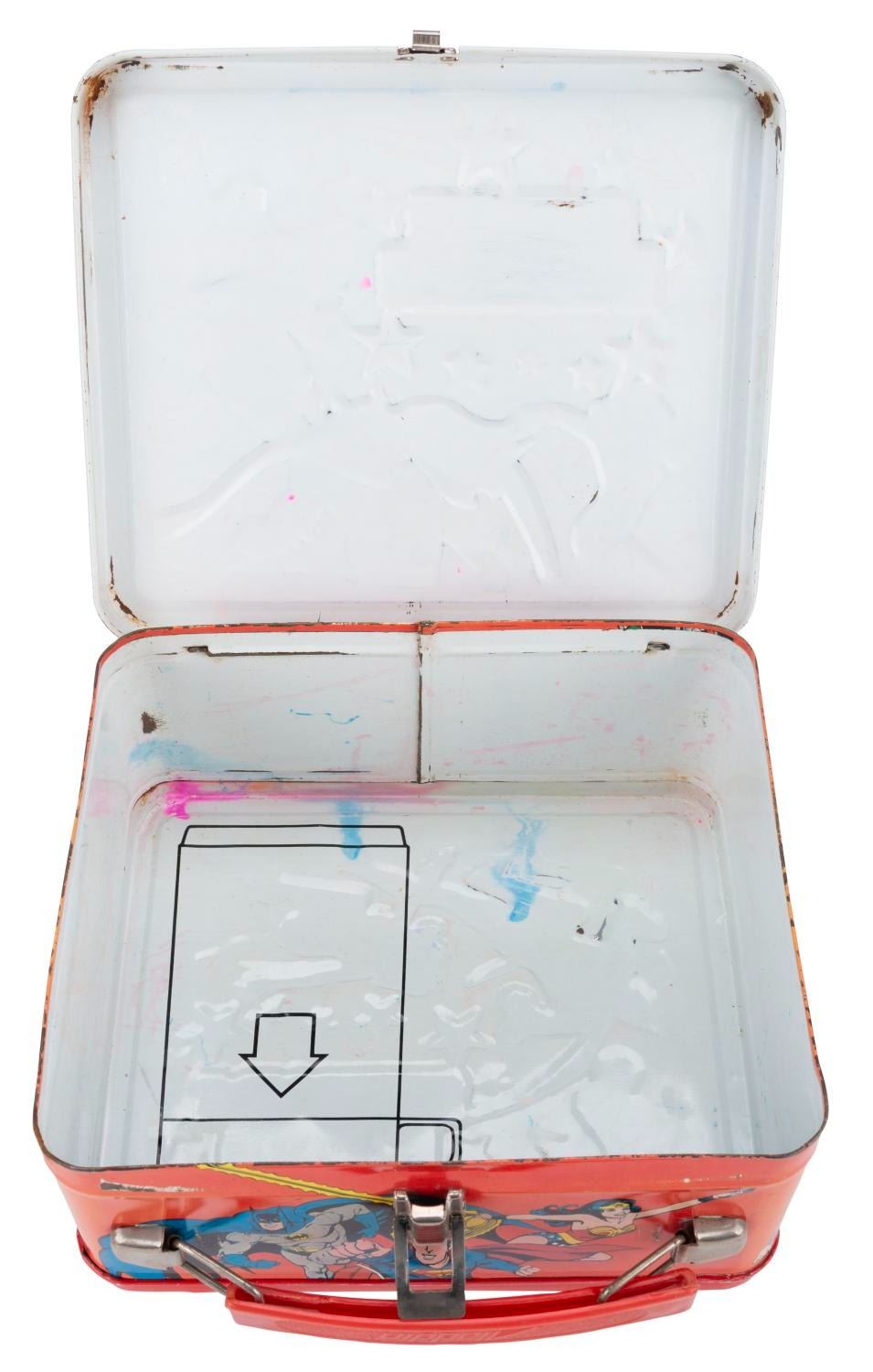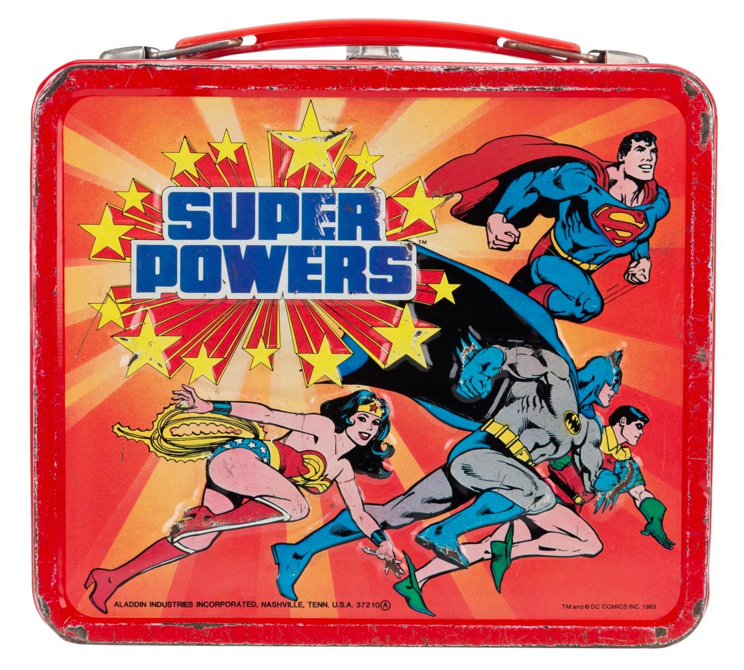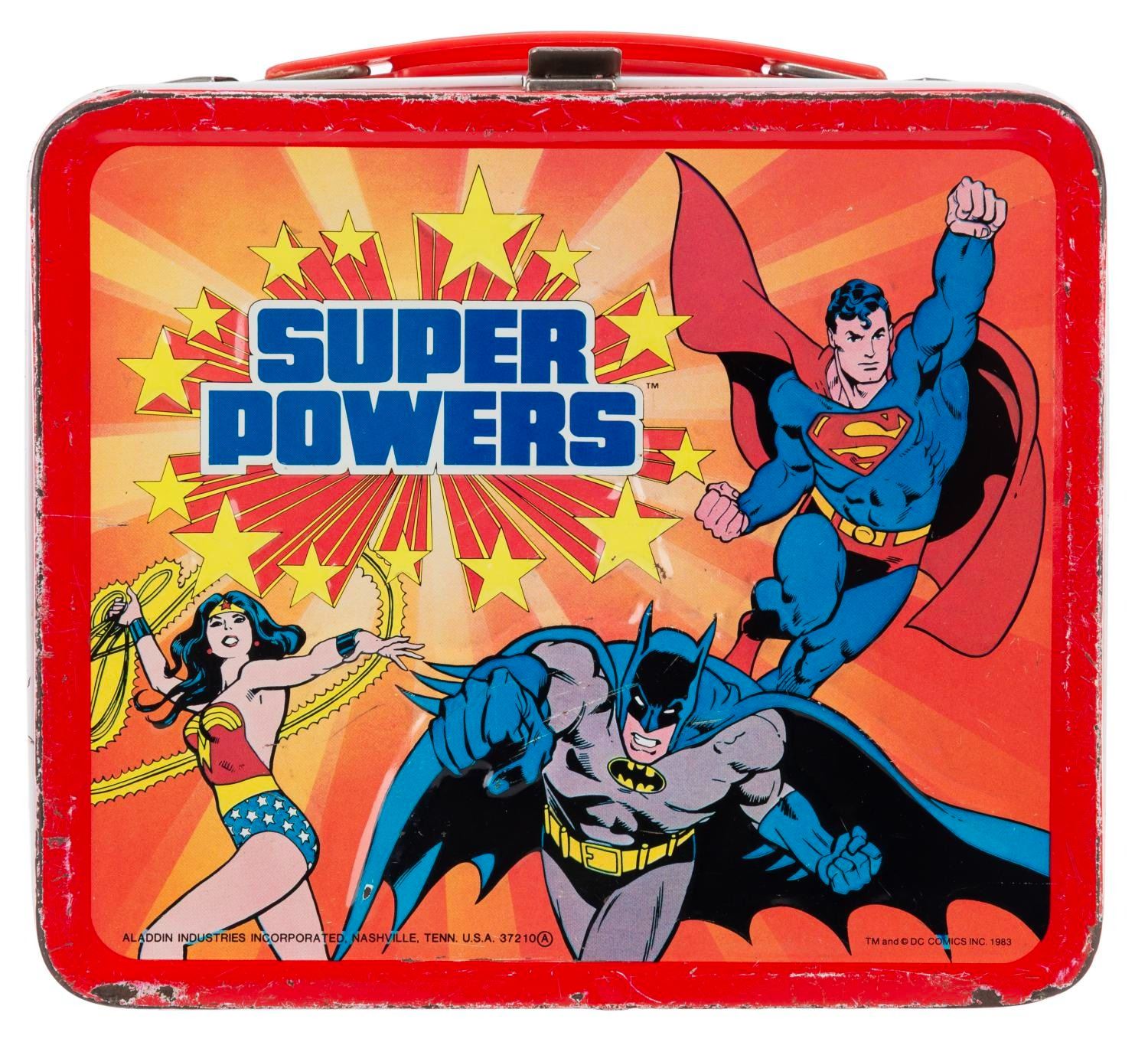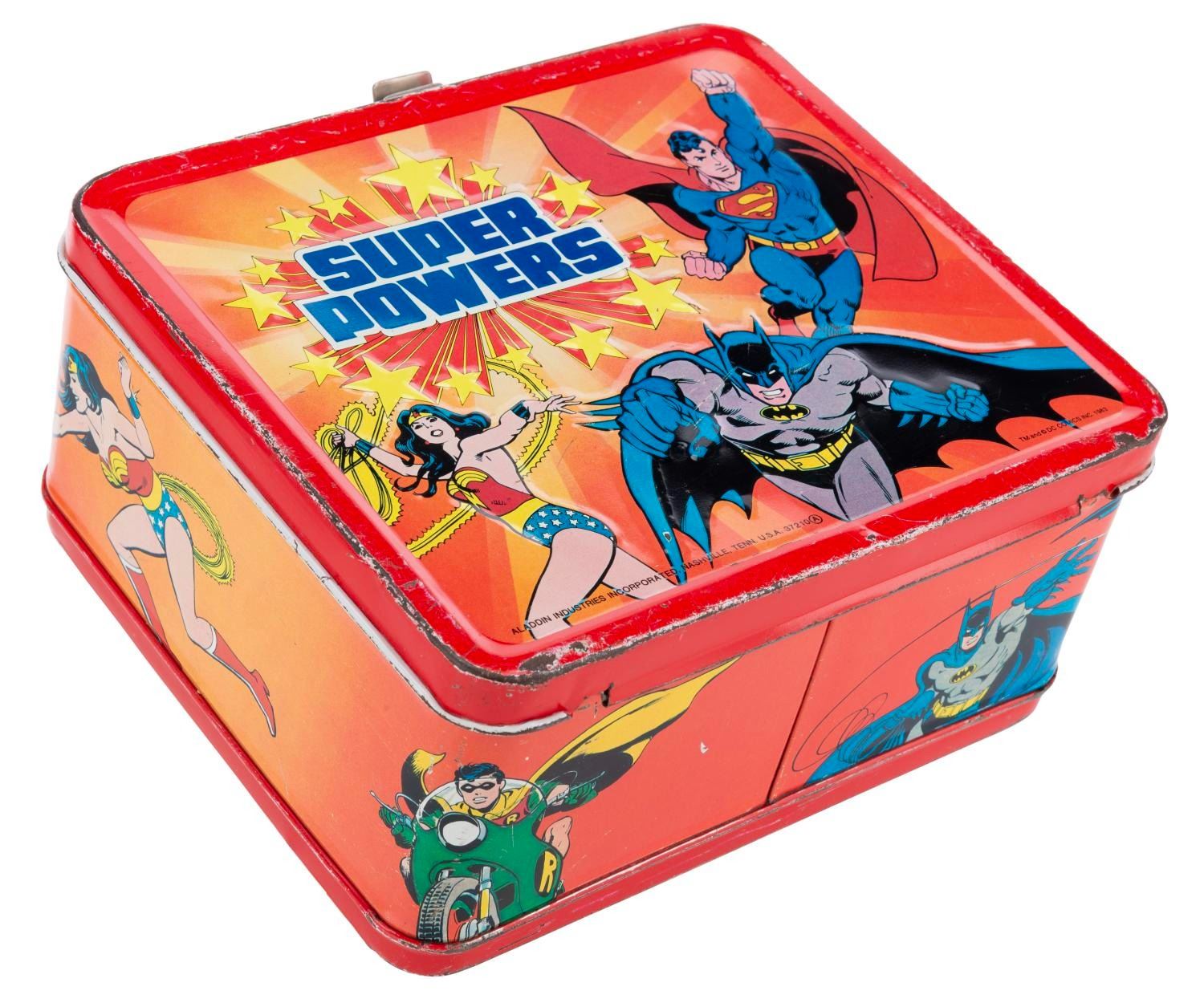 (Aladdin, 1983) A Super Powers Lunch Box manufactured by Aladdin featuring Superman, Wonder Woman, Batman, and Robin. Measuring 8.25" x 4" x 7", the lunch box displays in good condition with scratches, scuffs, oxidation from age, stains inside, and wear.