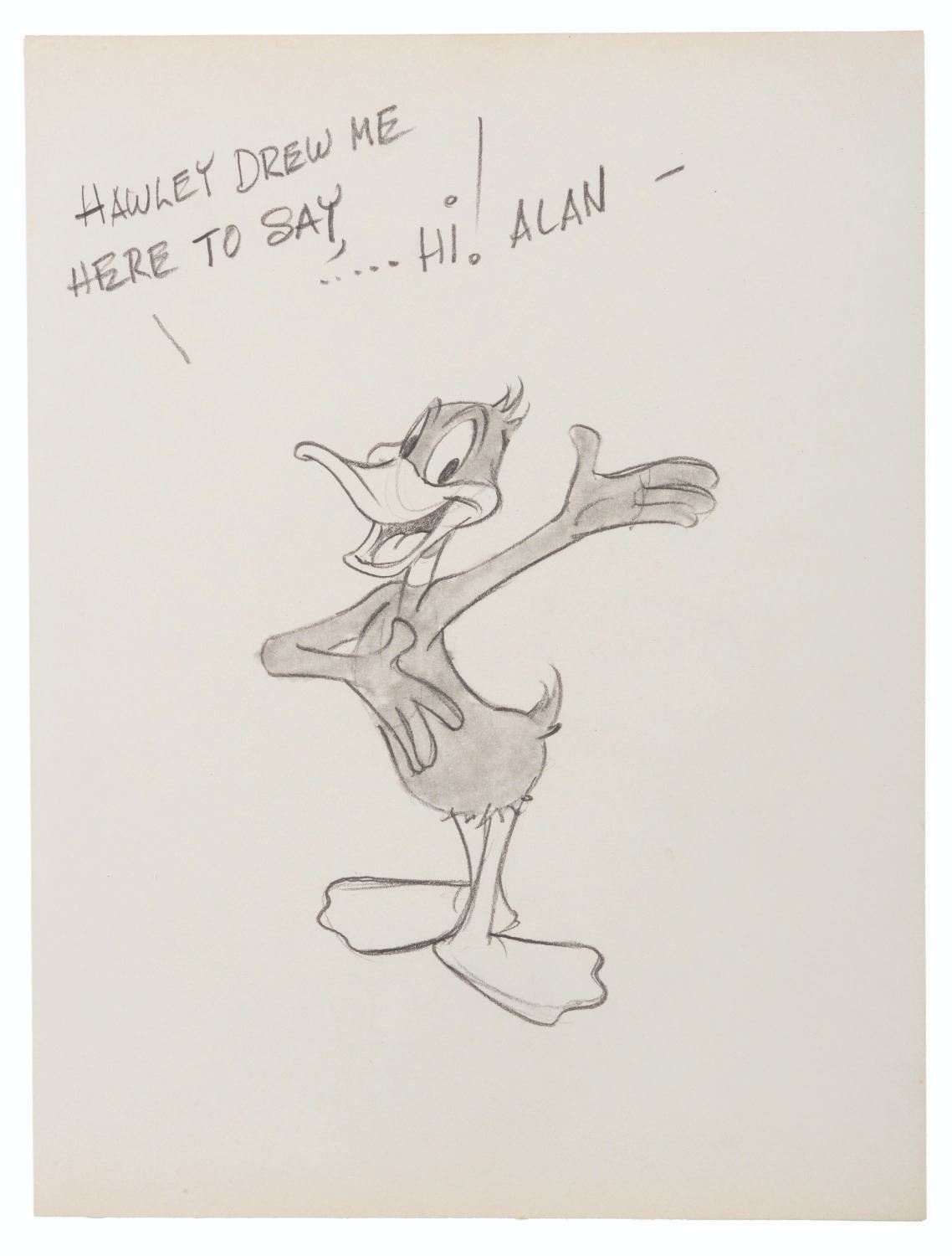 (Pratt, 1970s-80s) An original pencil drawing of Daffy Duck by animator Hawley Pratt, signed with a dedication to Alan. Pratt is known for his work at Warner Bros. alongside director Friz Freleng. With an image size of 4.5" x 6" on 8.25" x 11" paper, the drawing is in very good condition with the paper off-white from age.