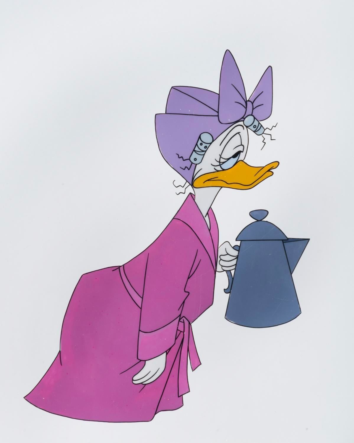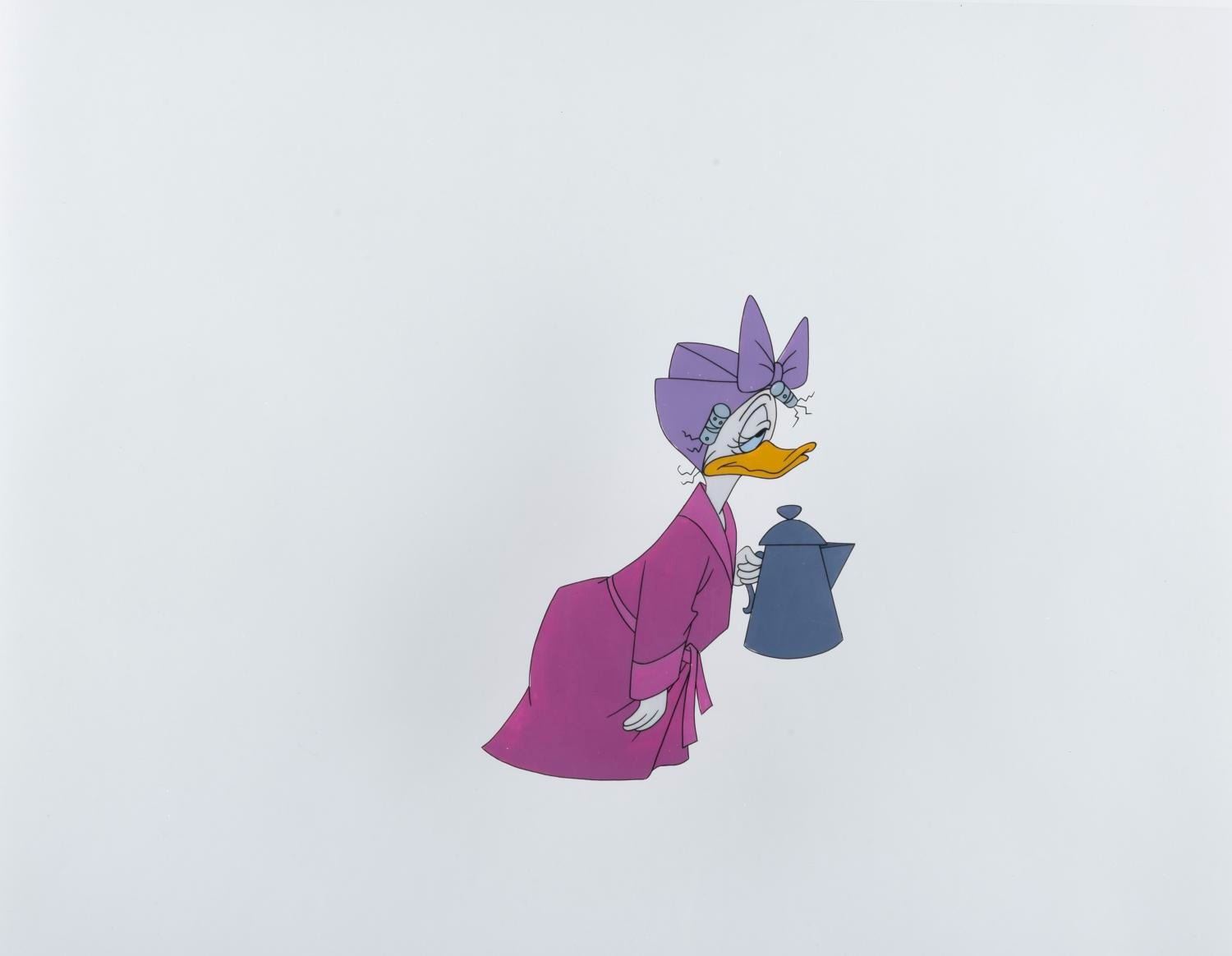 (Disney, 1959) An original hand-painted production cel of Daisy Duck from “How to Have an Accident at Work.” With a character image size of 4.5” x 6.25” on a 12.5” x 16” cel, the art is in good condition with spots of paint loss and surface scratches.