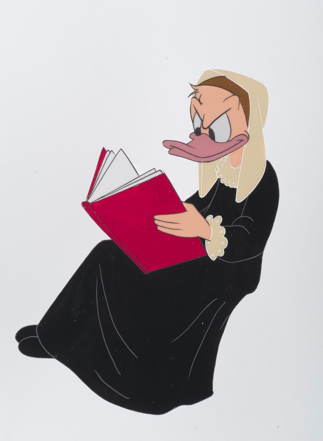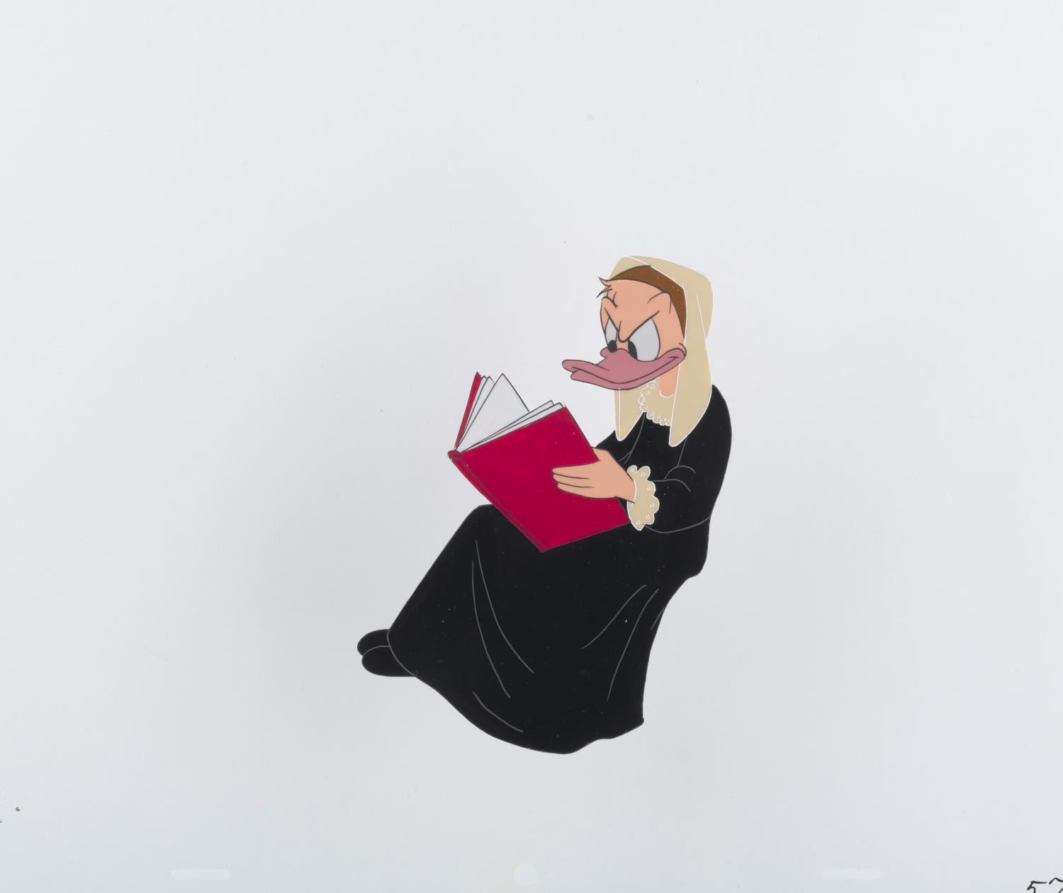 (Disney, 1954) An original hand-painted production cel of Daisy Duck’s mother from “Donald’s Diary.” With a character image size measuring 5.5” x 4” on an untrimmed 10” x 12” cel, the piece is in fine condition.
