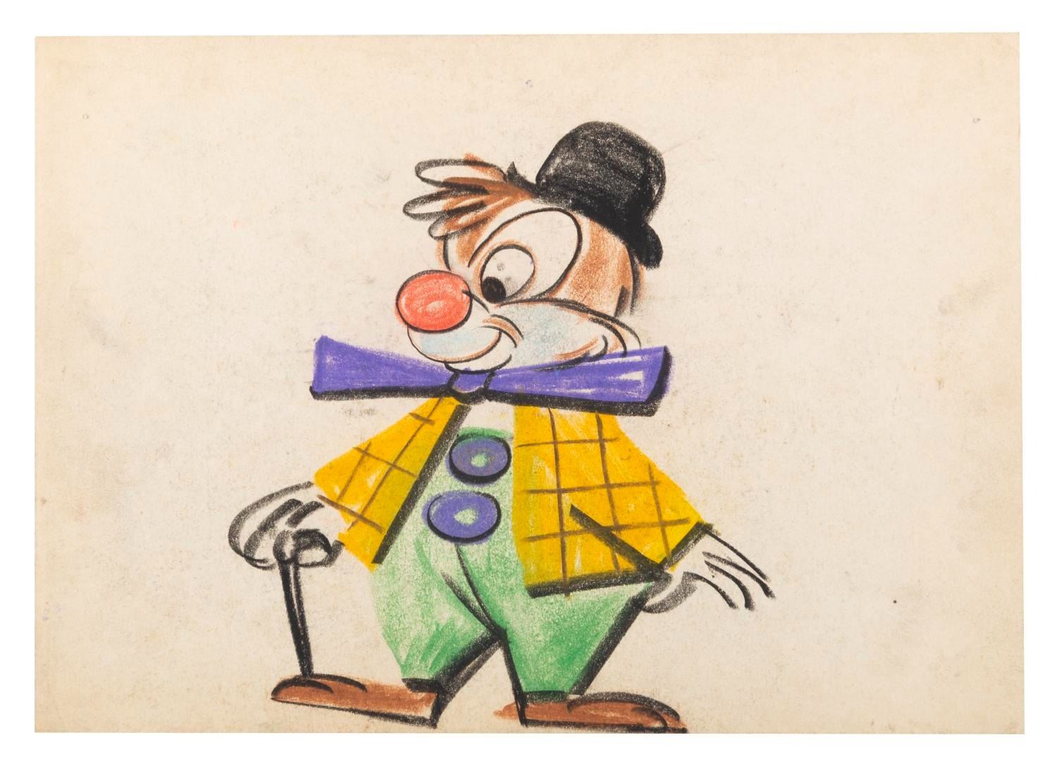(Disney, 1950s) A storyboard panel featuring Dale as clown from an unknown production. Measuring 6" x 8.25", the drawing accomplished in grease pencils and pastels is in very good production-used condition.