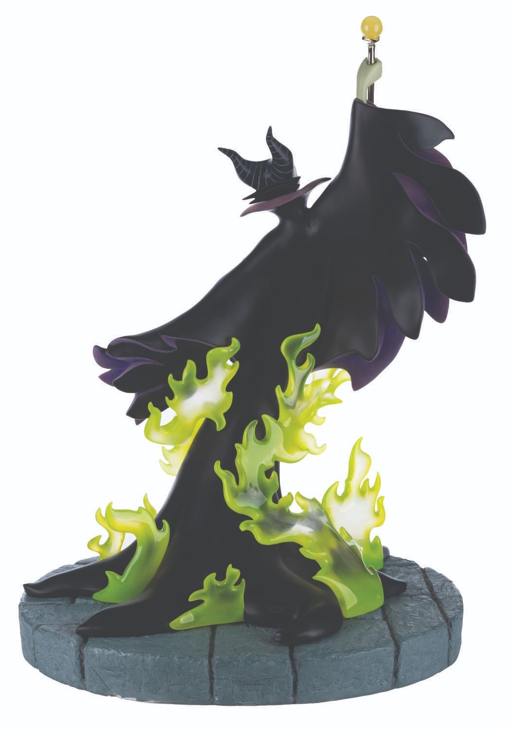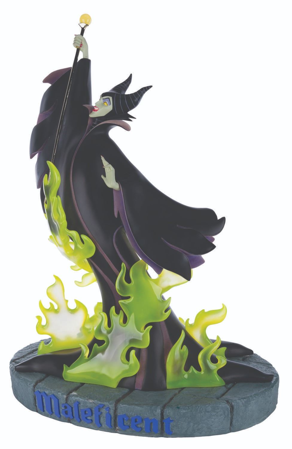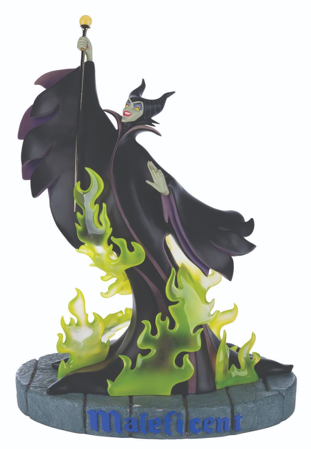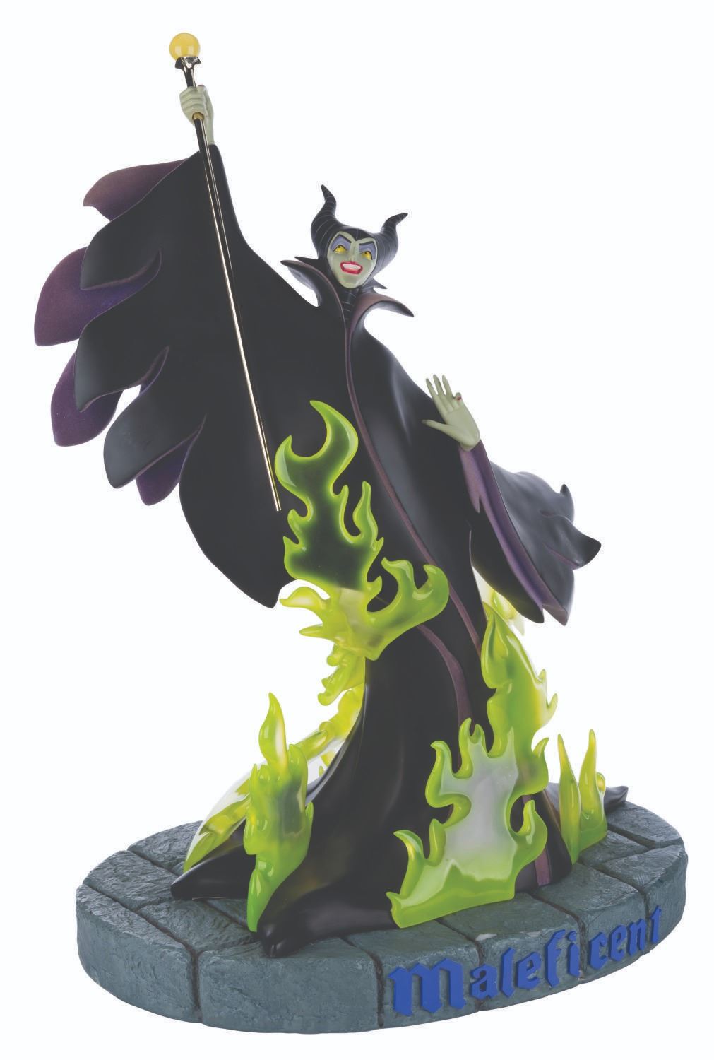 (Disney, 2004) A very rare Big Fig of Maleficent from "Sleeping Beauty." Titled "Maleficent's Fury," the Big Fig was released in a limited edition of only 150 exclusively at Walt Disney World. Measuring 21" x 15" x 29" tall, including the base, the resin sculpture displays in very good condition with light scratches, stains, and wear, and a crackline on her right wrist. The base is in fair condition, having broken into several pieces and been glued back together, with crack lines throughout, and large chips missing that show white above the Maleficent name on the front, and along a line just past the middle through the center. Special shipping is required, please inquire before bidding.
