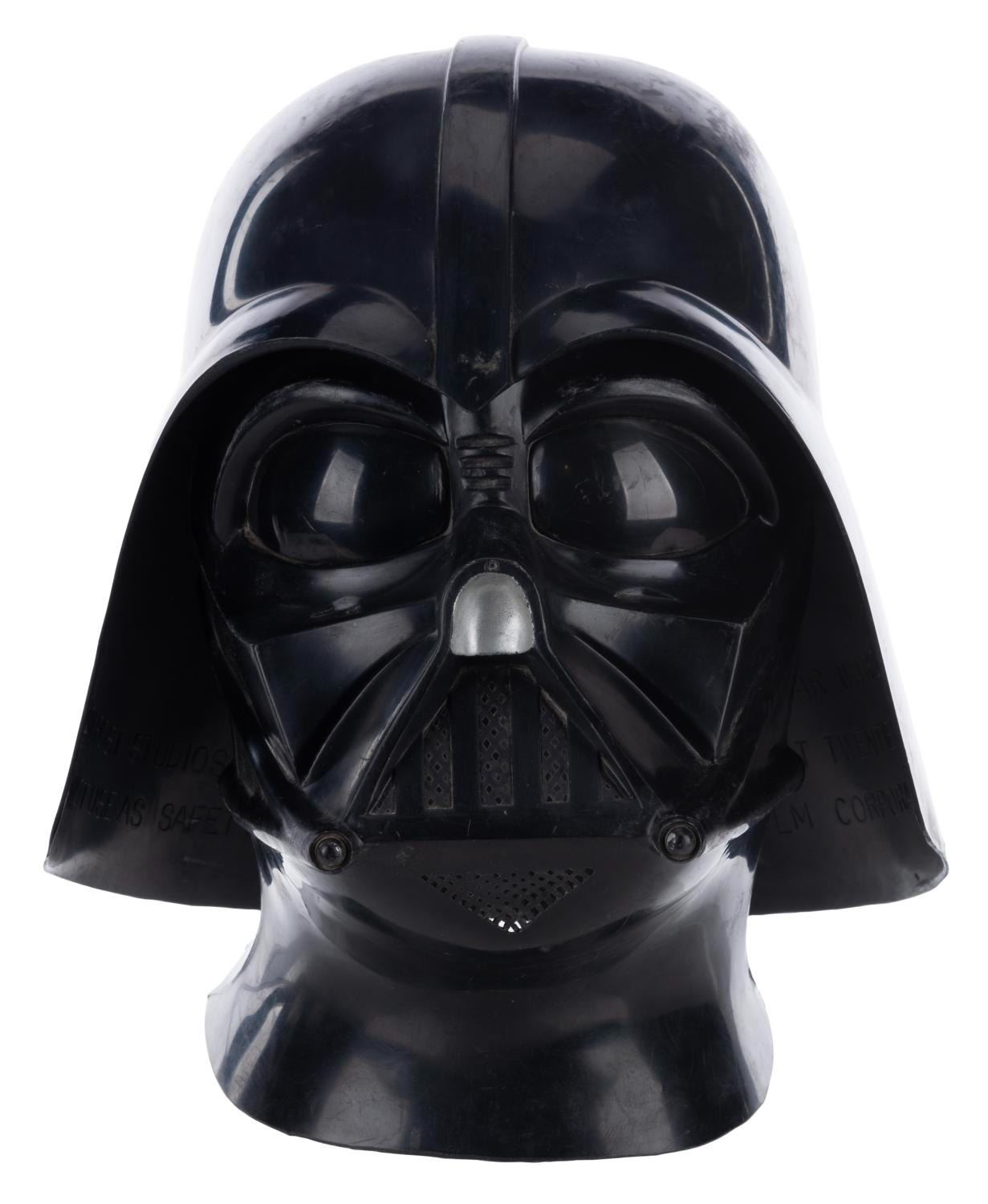 (Don Post Studios, 1977-90s) A Darth Vader mask by Don Post Studios. This two-piece mask was the very first commercially available version of Vader’s helmet and was produced by the studio through the late 90s. The plastic mask measures 10.25” x 11.75” x 12” tall and displays in good condition with wear and scuffs.