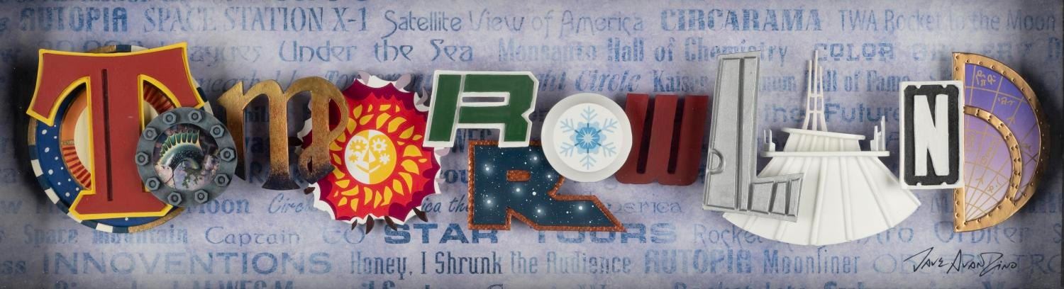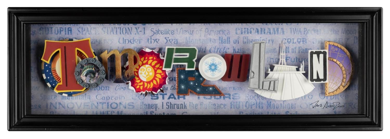 (Disney, 2005) A Tomorrowland-themed dimensional art piece by mixed-media artist David Avanzino. Each letter in “Tomorrowland” is themed to the land’s past and present attractions including Submarine Voyage, Star Tours, Space Mountain, Autopia, and the Skyway. This piece is the fifth in Avanzino’s series of commemorative Disneyland 50th anniversary Icon Letter shadowboxes. Measuring 6.25” x 18.75”, the shadowbox art displays in very good condition with light scratches, scuffs, and wear.