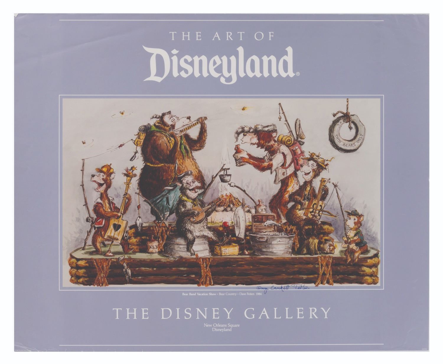 (Disneyland, 1987) A signed Bear Band Vacation Show poster featuring Dave Feiten’s 1984 concept art for the Country Bear Jamboree revamp. The show was retitled The Country Bear Vacation Hoedown, replacing the original attraction in 1986. Originally from The Disney Gallery, the poster was signed by Feiten in blue pen with the name Davy Crockett Feiten. Measuring 26” x 32”, the poster displays in good condition with heavy creases and edge wear.