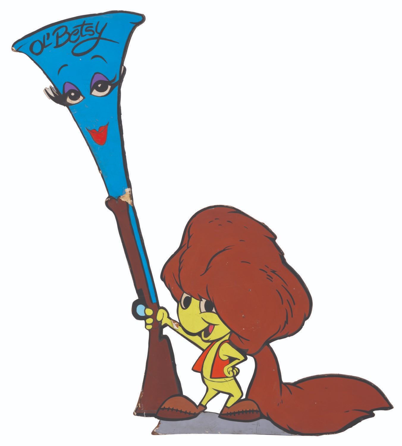 (Clampett, 1960s) A handmade wooden cut-out of Davey Cricket with his gun, Ol’ Betsy, from “Beany and Cecil,” that decorated Bob Clampett’s backyard poolside area. Measuring 45” x 31.5” and 0.25” thick, the display is in fair condition with edge wear, peeling, scratches, soiling, a 2” x 1.5” area of missing paint on the right edge of the gun, a 1” x 1” area of missing paint on Davey’s right arm, and light discoloration from age. Due to size and weight, this item requires special shipping arrangements. Please inquire before bidding.