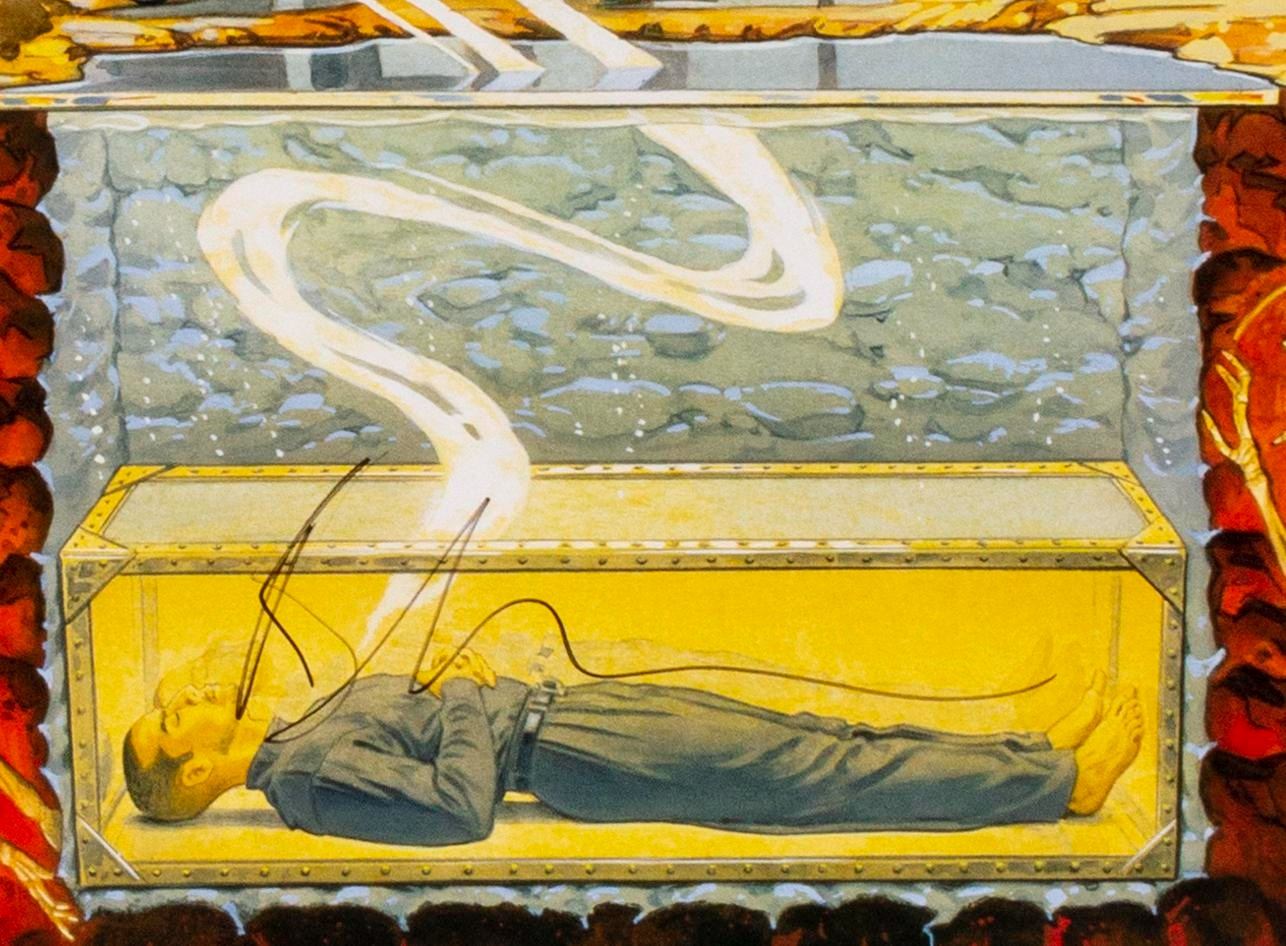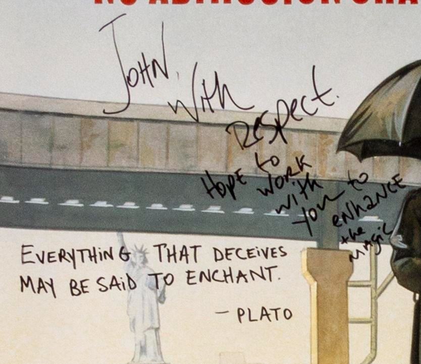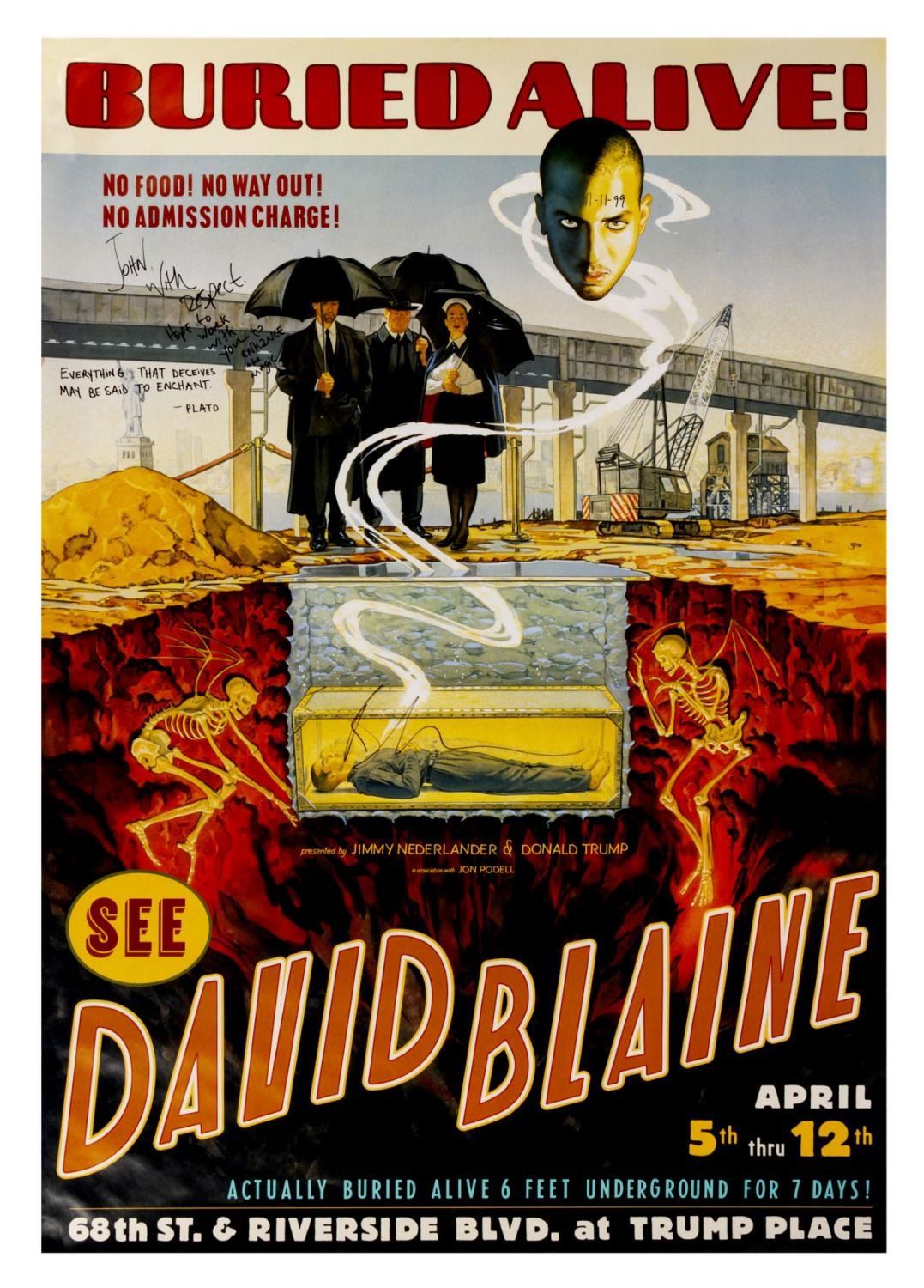 (Blaine, 1999) A signed original poster for magician David Blaine's "Buried Alive!" performance where Blaine was buried underground in a plexiglass coffin under a 3-ton water tank for seven days and nights. This poster was created by Mark Stutzman inspired by vintage magic posters, and has been signed in ink by Blain with dedication to film director John Landis. Measuring 27” x 38", the poster is in very good condition with light edge wear and creasing, and a two 0.25” stains along the left edge.
