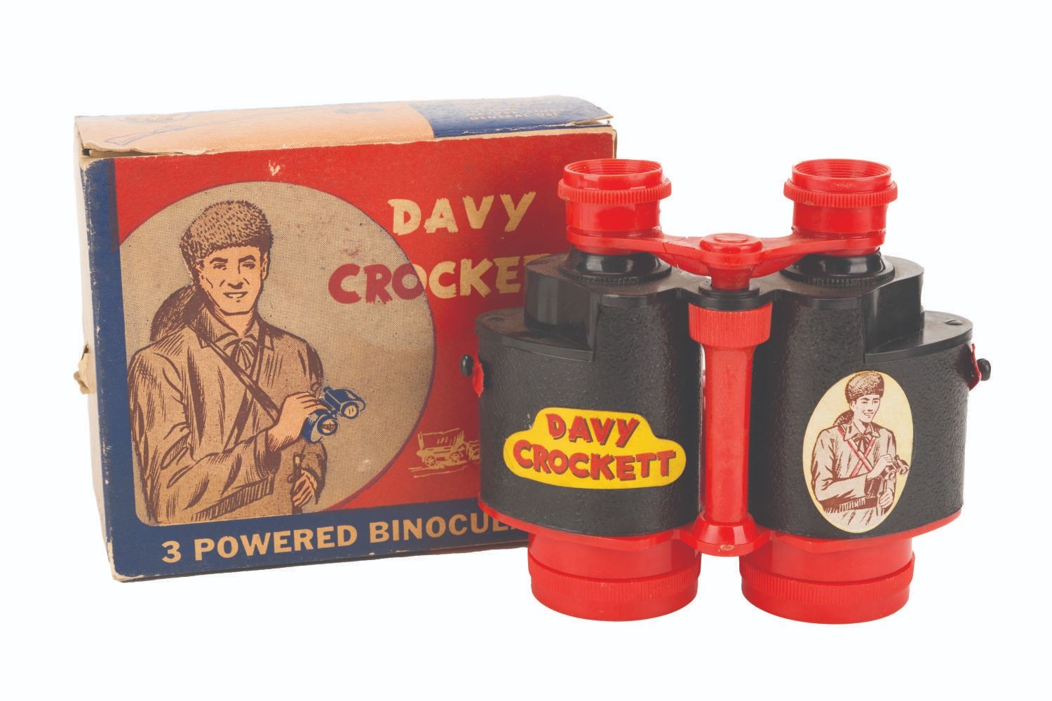 (Harrison, 1950s) A plastic Davy Crockett binoculars toy. Featuring vinyl straps and Davy Crockett decals, they come with the original box. The binoculars measure 6" x 5.5" x 2.25" and are in very good condition, with slightly peeling decals, minor scuffs, and repair of a hairline crack to plastic. The box measures 6.25" x 5.25" x 2.5" and is in very good condition with a 0.5" diameter puncture, slight wear, and creases to flaps, edges, and corners.