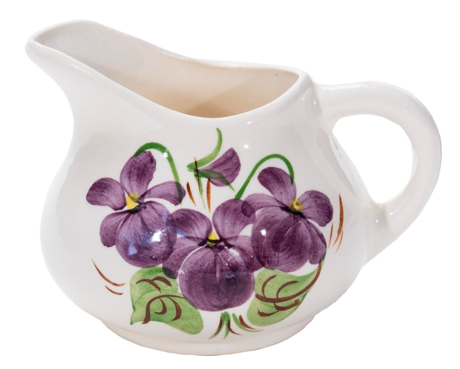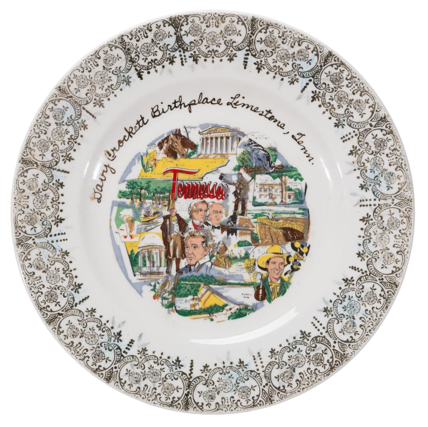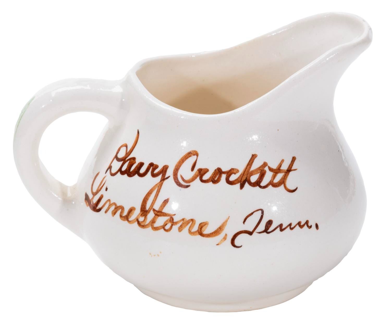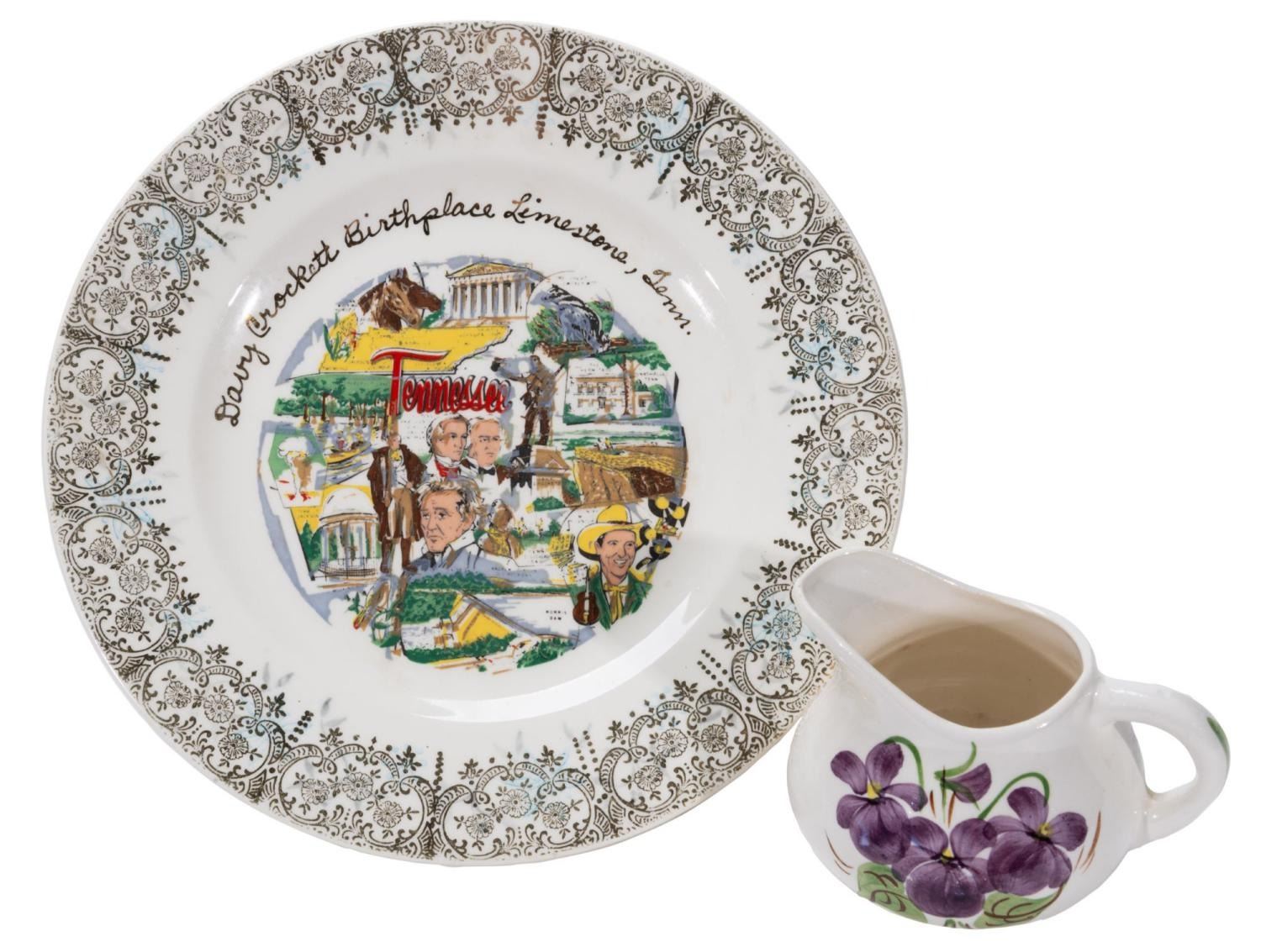 (Clinchfield, 1950s-60s) A Davy Crockett Birthplace Plate & Creamer. The hand-painted pieces were manufactured by Clinchfield Artware and an unknown manufacturer for the Davy Crockett Birthplace in Limestone, Tennessee. The creamer features the state cultivated flower of Tennessee, while the plate vignettes from state history. The plate measures 8" in diameter and the creamer 2.5" tall and 3" in diameter, both in very good condition with light wear and discoloration from age.