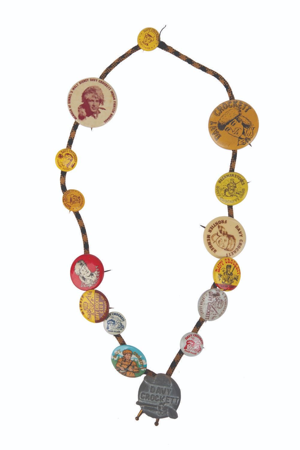 (Disney/Various, 1950s) An eclectic collection of 14 Davy Crockett buttons on a Davy Crockett bolo tie. The buttons include a Disney button for department store Gimbel's "Walt Disney Davy Crockett Indian Fighting Brigade." The bolo tie bears an iron emblem with a flintlock pistol and Crockett's name. Measuring 0.75" to 1.75", the buttons are in good to fine condition, with some scratches and oxidation to backs and pins. The bolo tie is in good condition.