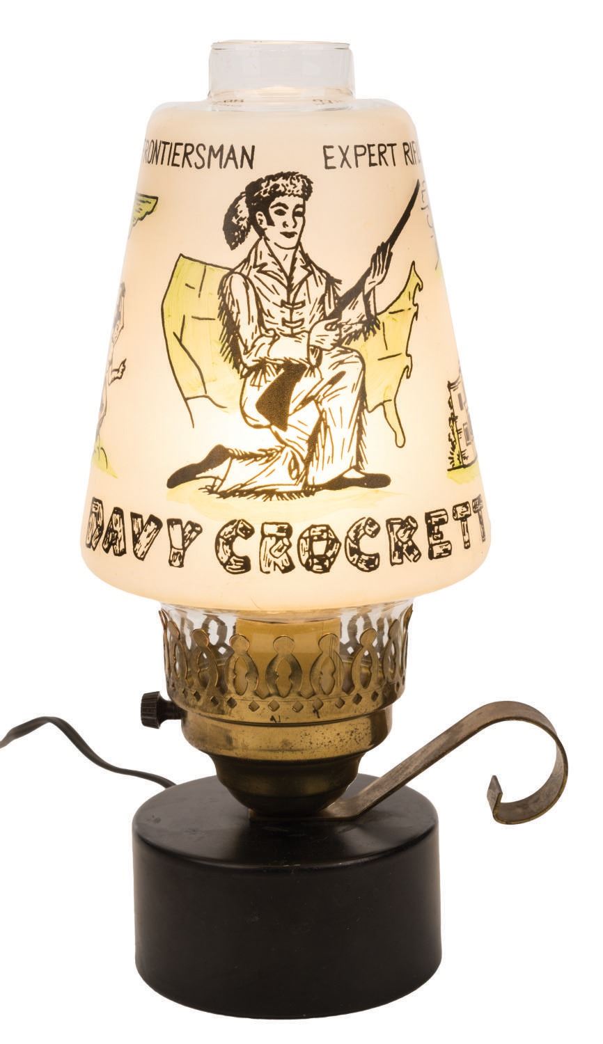 (1950's) A Davy Crockett lamp styled to look like an old-fashioned gas lamp. The hurricane glass style top illustrates great moments in Crockett's life. Measuring 5" at widest diameter and 12" high, the lamp is in very good working condition with slight wear from use and display, particularly to the finish on the handle.
