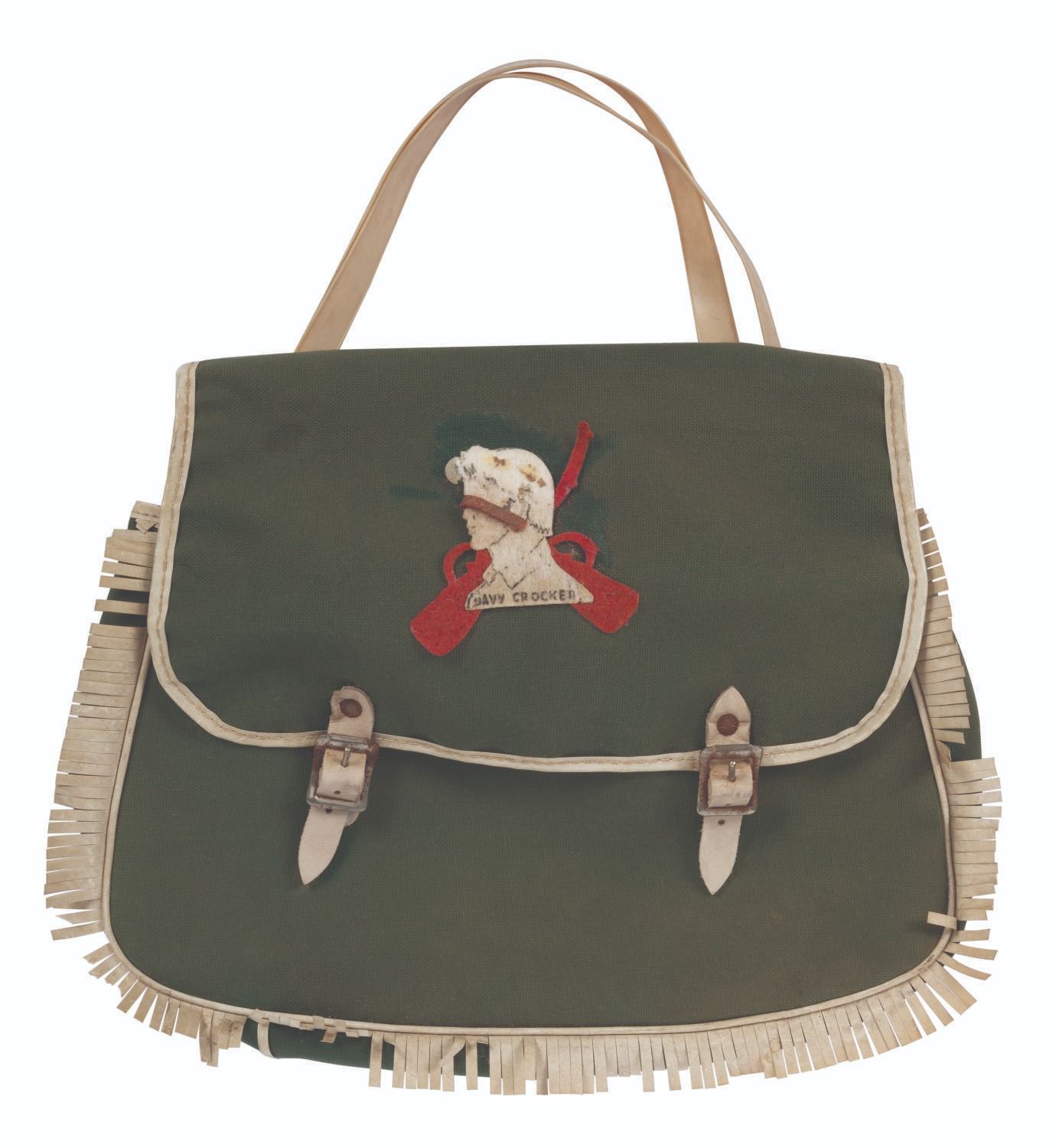 (1950s) A Davy Crockett toy messenger bag. This green canvas bag with white plastic fringe features a felt profile of Crockett that is missing a coonskin cap piece. Measuring 14" x 11" with a 32" vinyl strap, the bag is in good condition with several frills missing, discoloration from age, oxidation, and lifting and separation at the top of Davy's head.