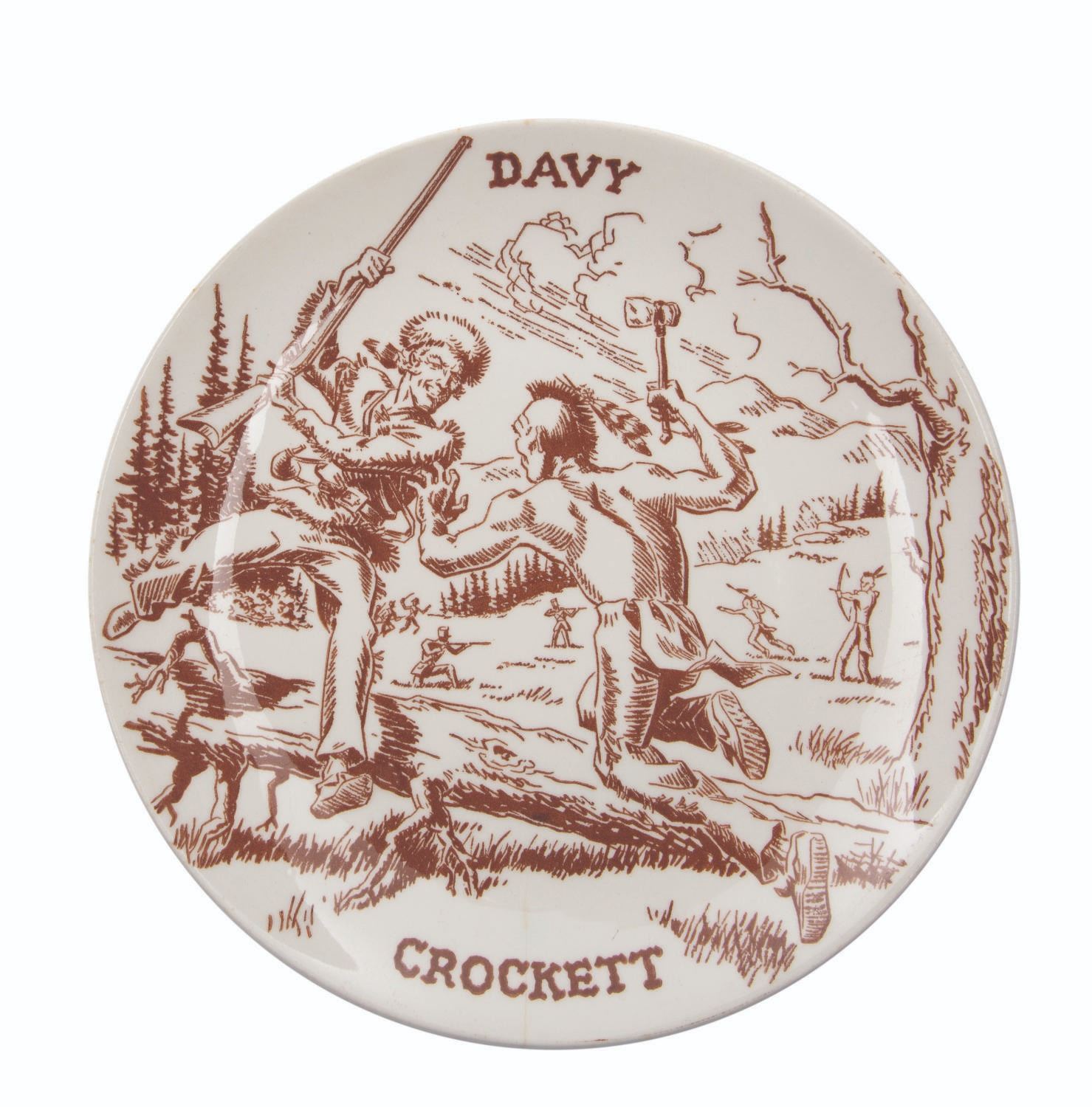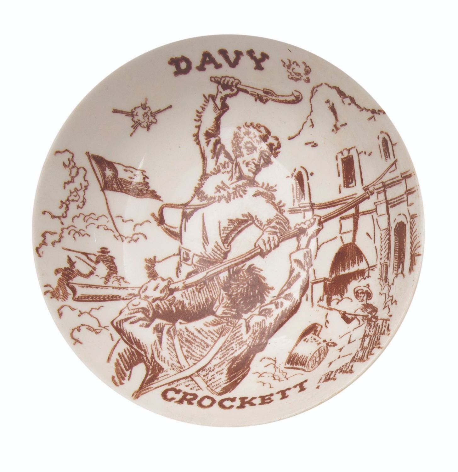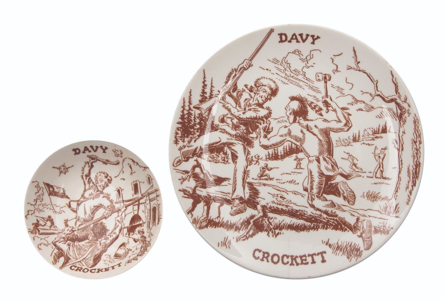 (Oxford China Co., 1950s) A china plate and bowl depicting Crockett battling Native Americans and defending the Alamo. The 6" bowl and 9.5" plate are in fine condition, with very slight crazing and color shift on the plate's back, typical of age.