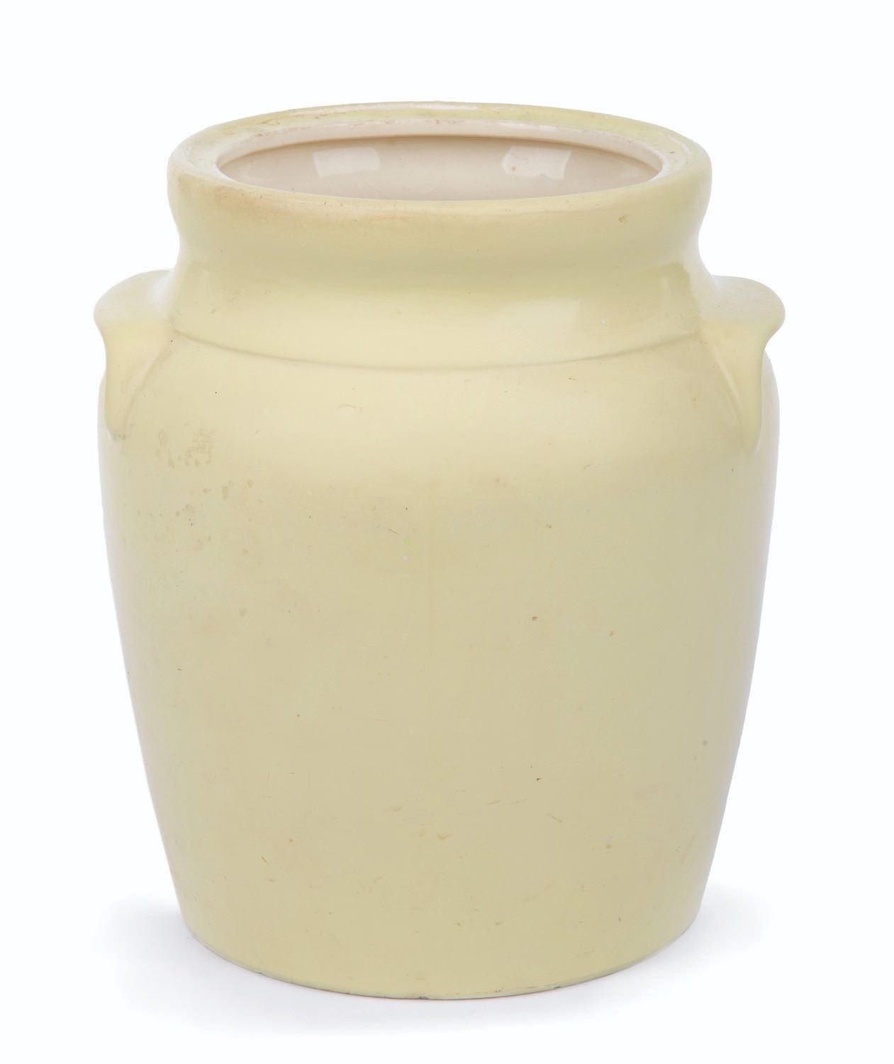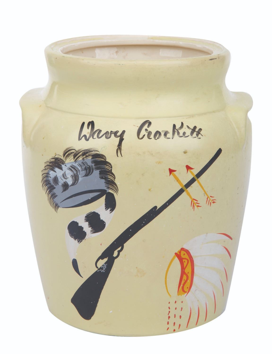 (Ransburg, 1950s) A Davy Crockett Cookie Jar by Ransburg of Indianapolis. The hand-painted 9" x 8" diameter jar is in fine condition, with light scuffs, and the lid is missing.